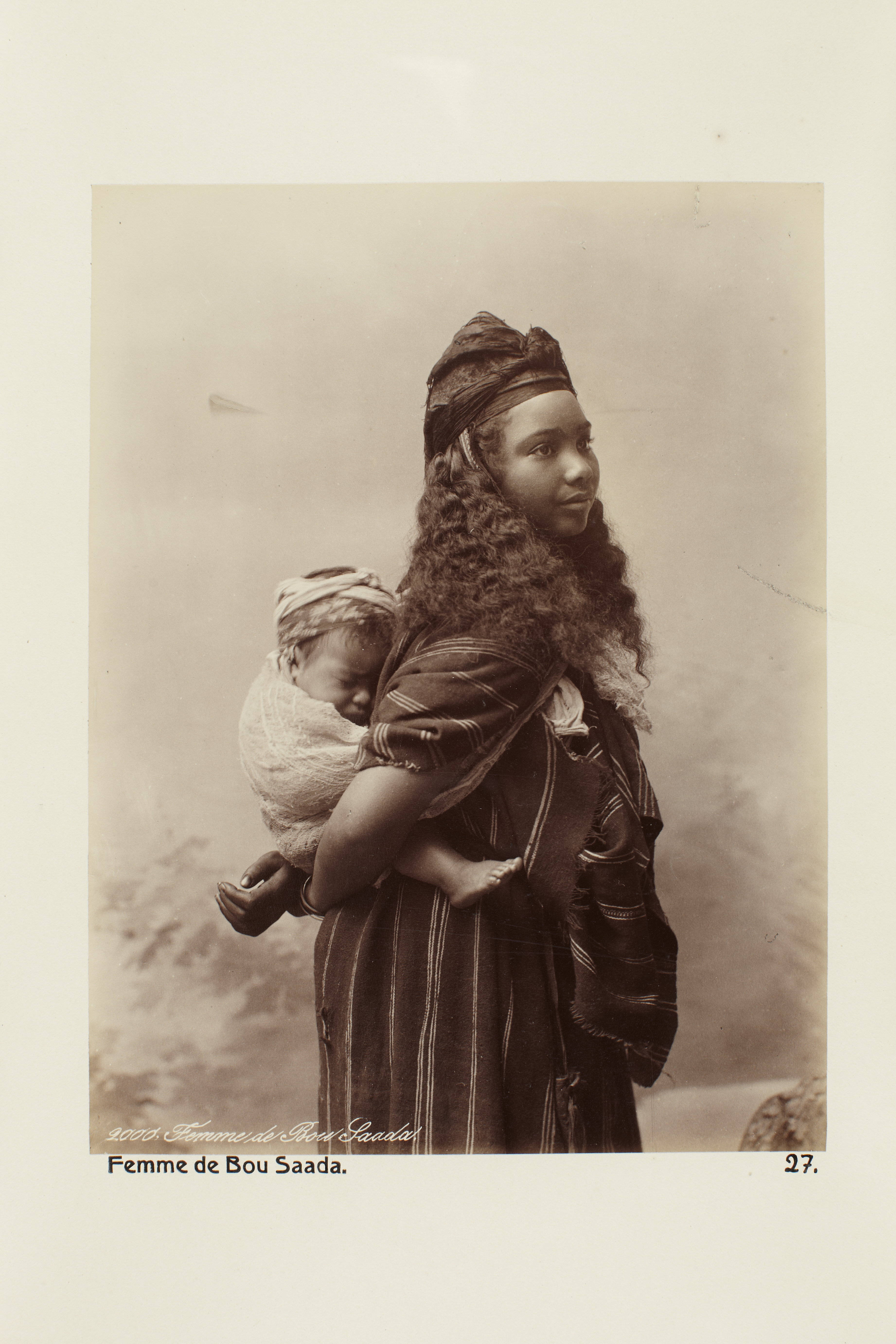Algeriet. Kvinna från Bou-Saada. Foto från resa genom Algeriet och Tunisien samt åter över Schweiz, 11 februari - 19 maj 1889. Samtliga foton i gruppen LXVI:F. är inköpta av Wilhelmina von Hallwyl i Alger, Biskra, Tunis, Constantine, Oran och Blidah vid hennes vistelse i nämnda städer tillsammans med sin make, Walther von Hallwyl, sin mor, Johanna Kempe, f. Wallis, dottern Irma samt fröknarna Caroline Pflaum och Ida Uhse. Uppgifterna kommer från fröken Ida Uhses reseanteckningar.