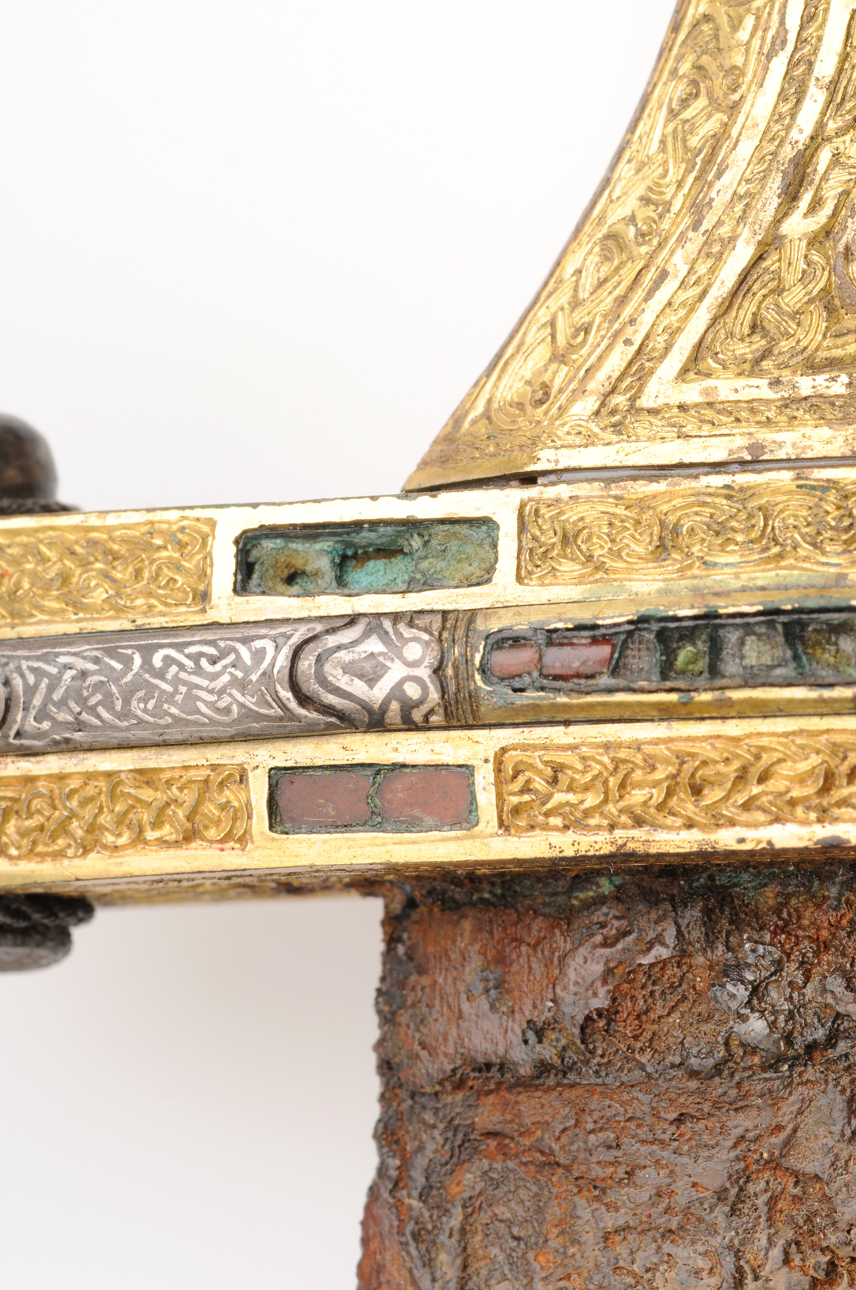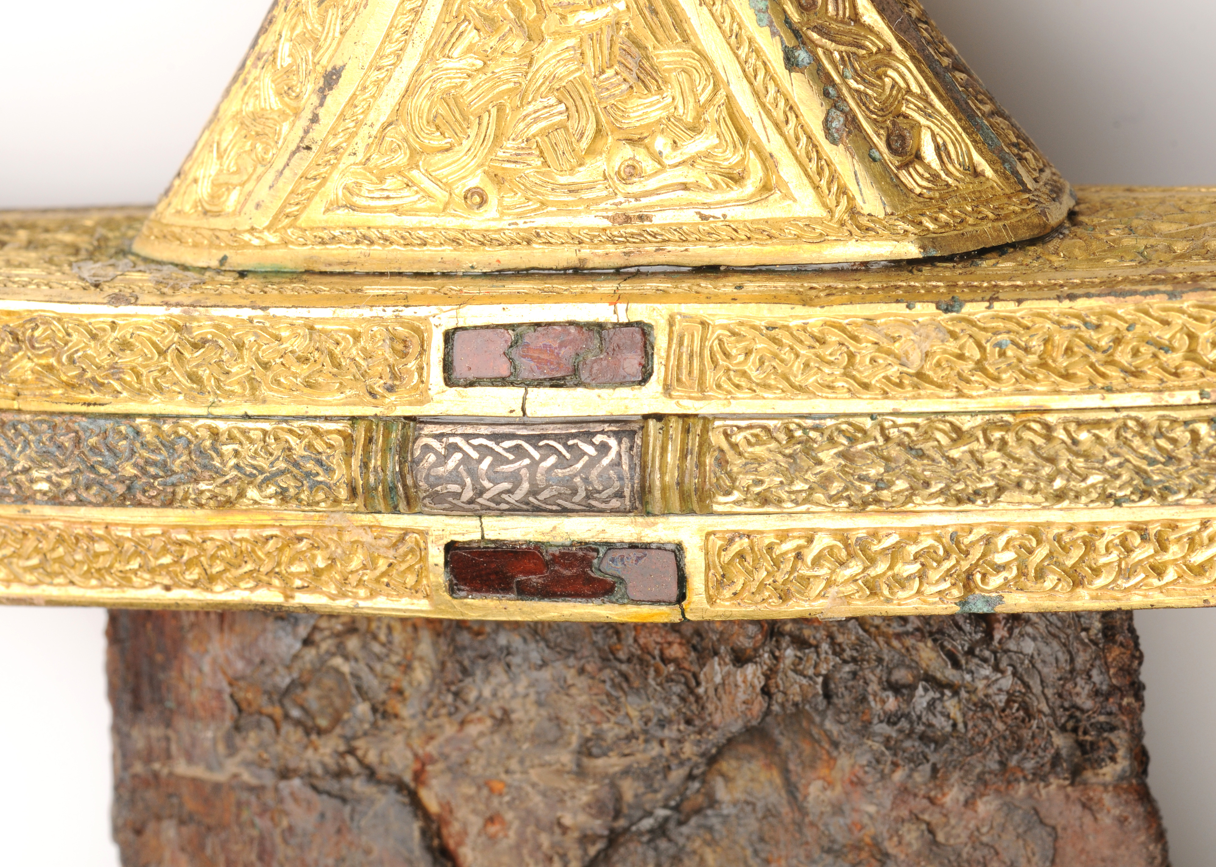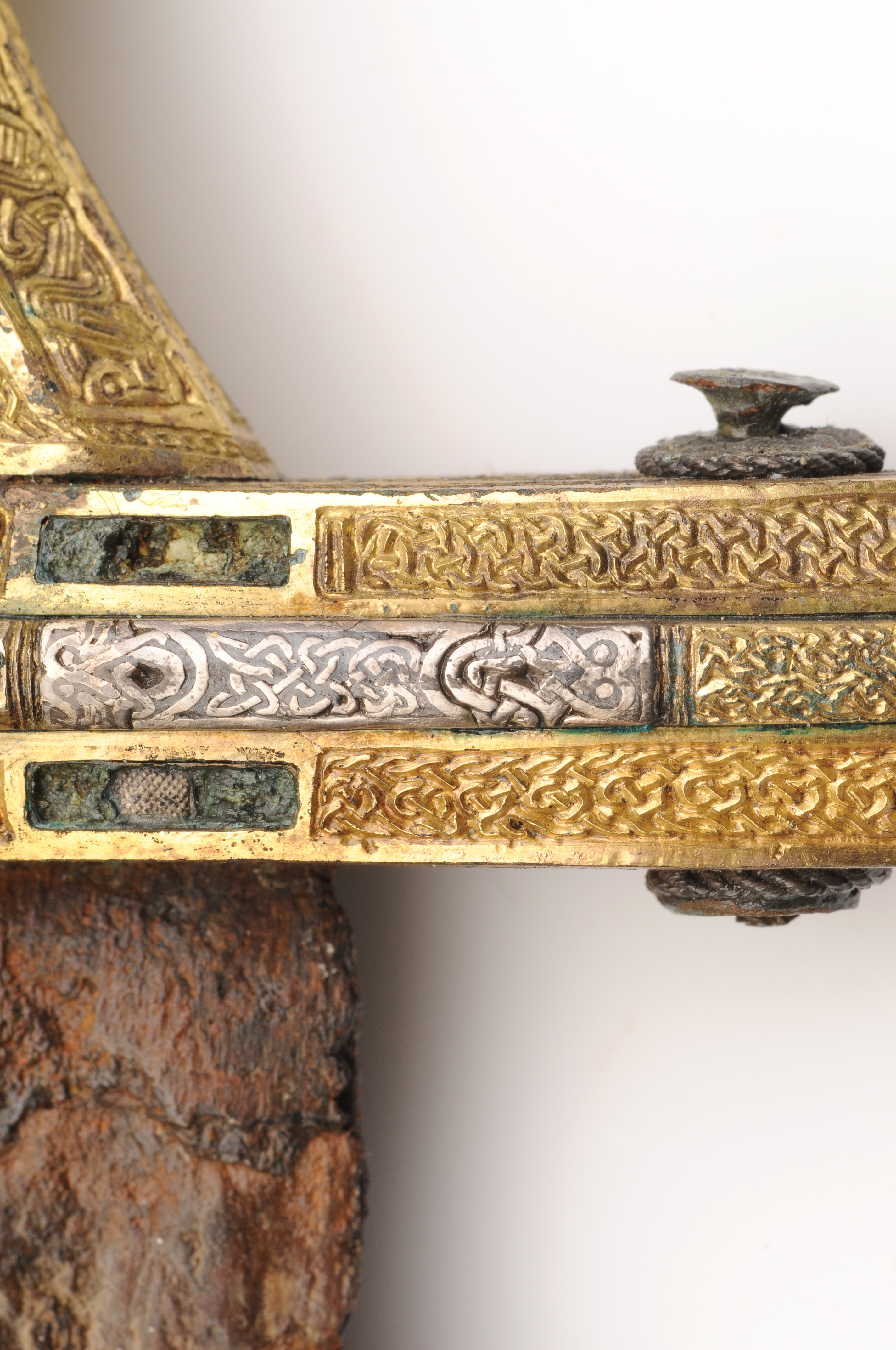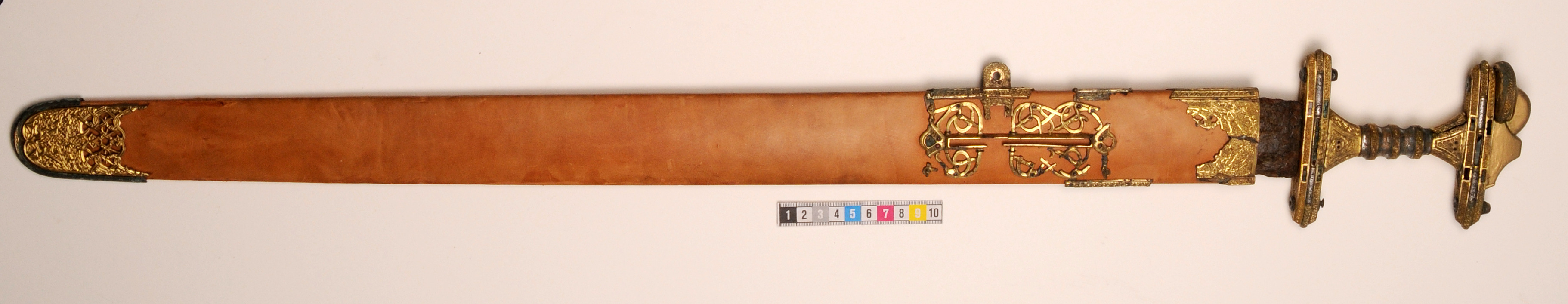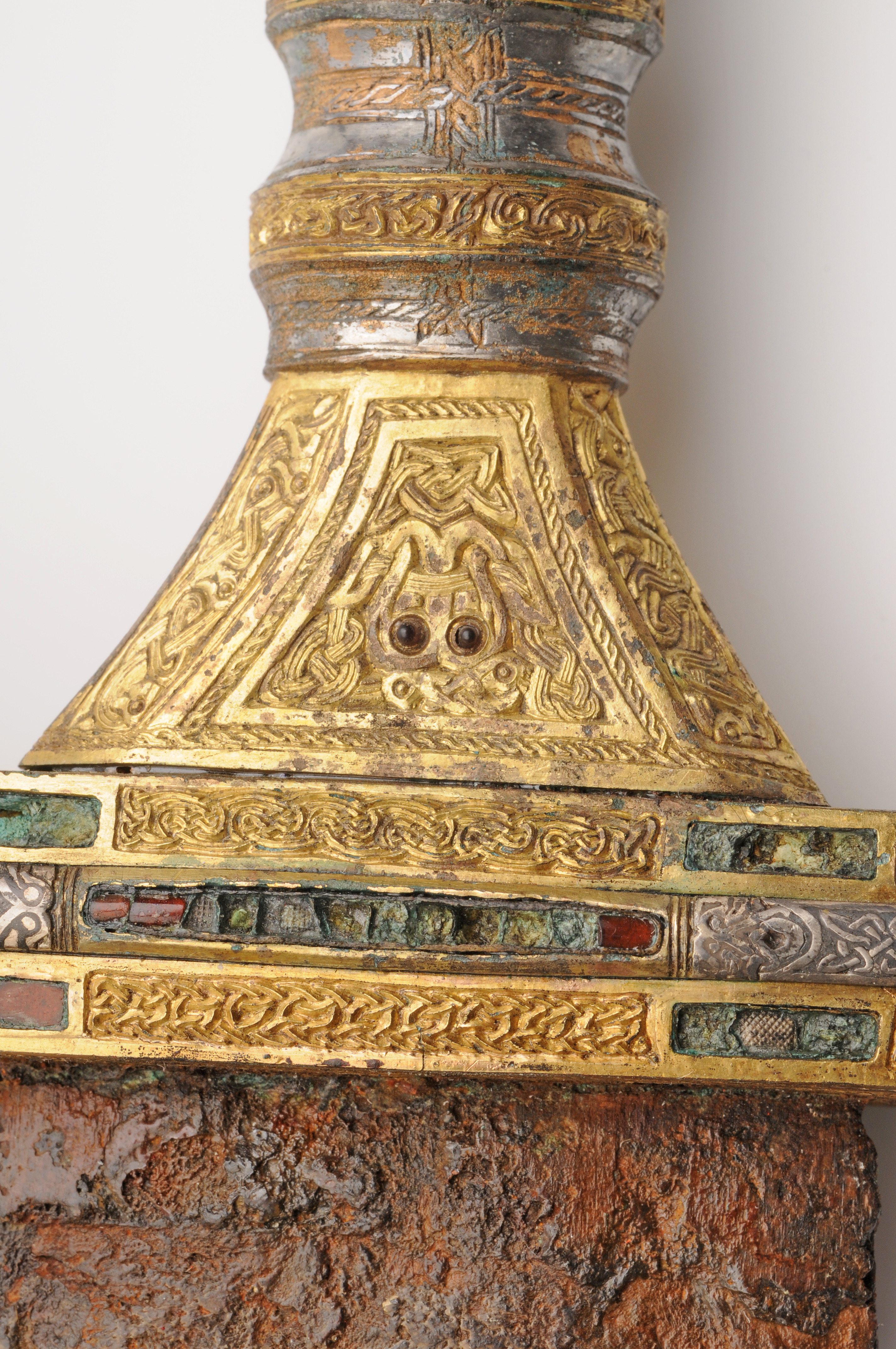 Fästet och övre delen av klingan till ett präktigt järnsvärd. Fästet är utfört i förgylld och försilvrad, fint ciselerad brons. På framsidan av vardera tvärstången två infällda rektangulära silverplåtar med djurornament i niello, har granatskivor inlagda. Rekonstruerad svärdsskida.