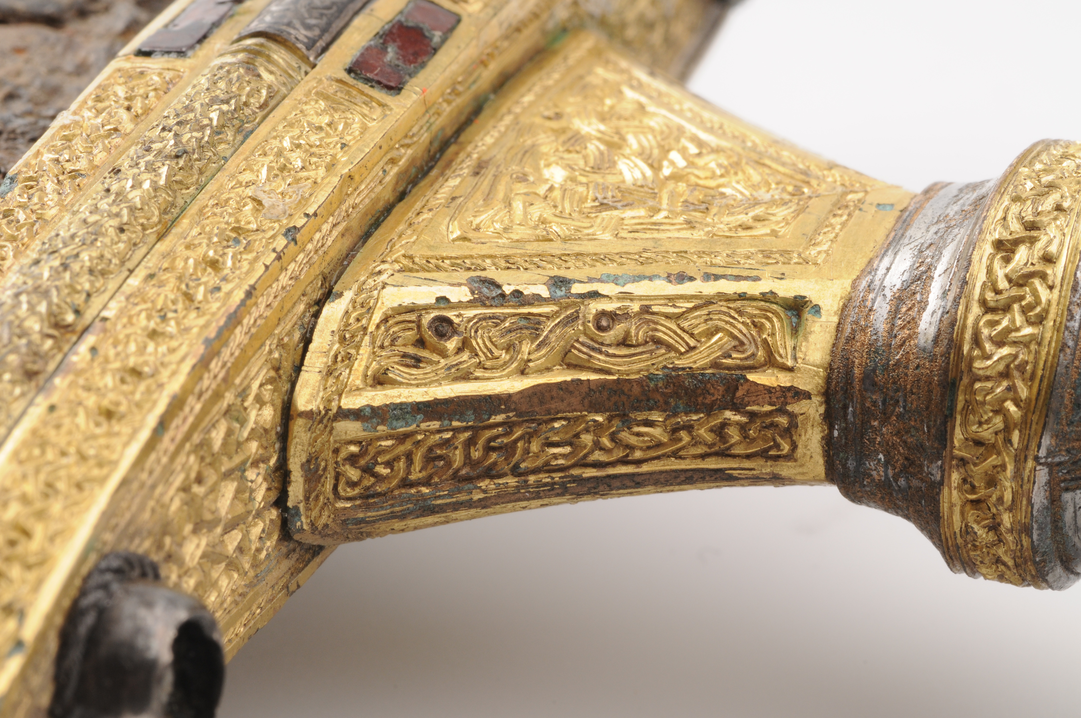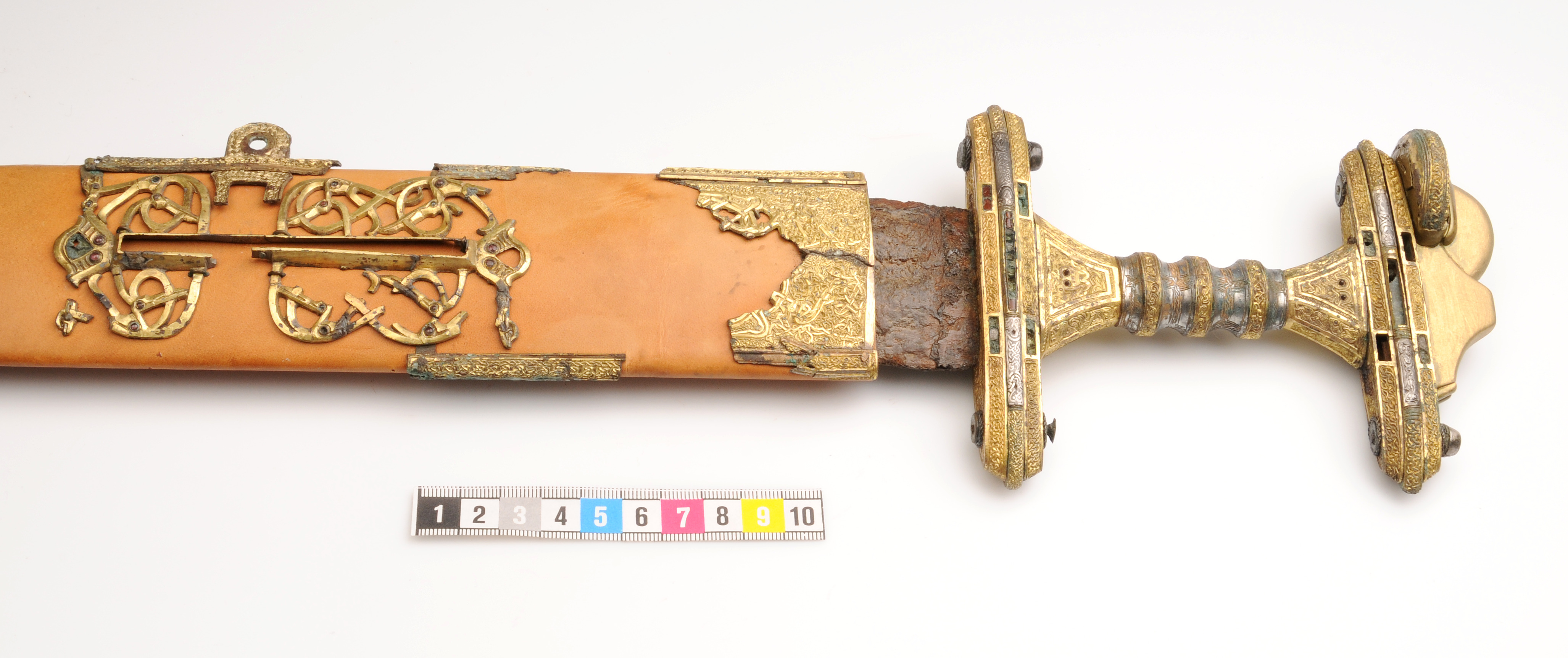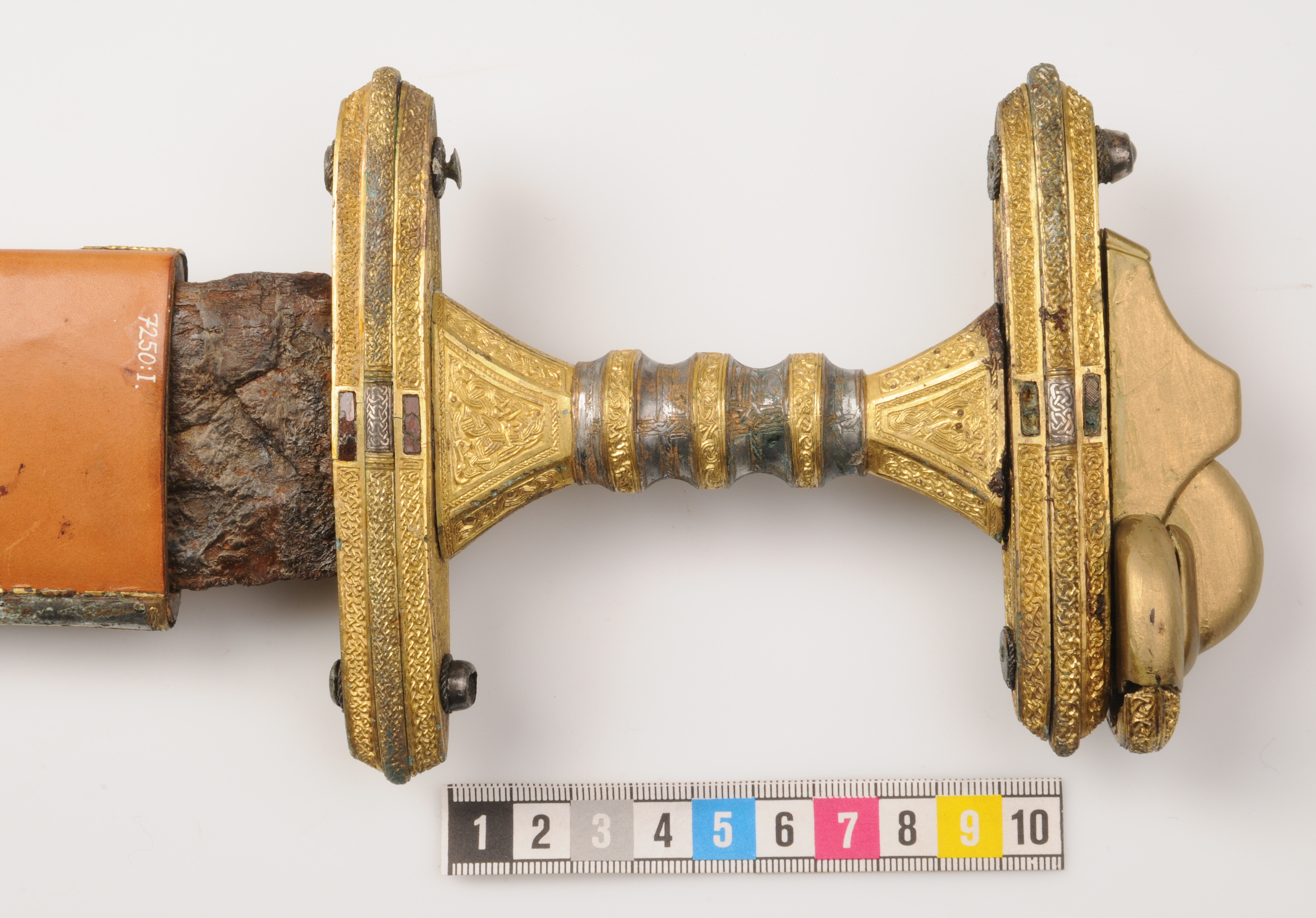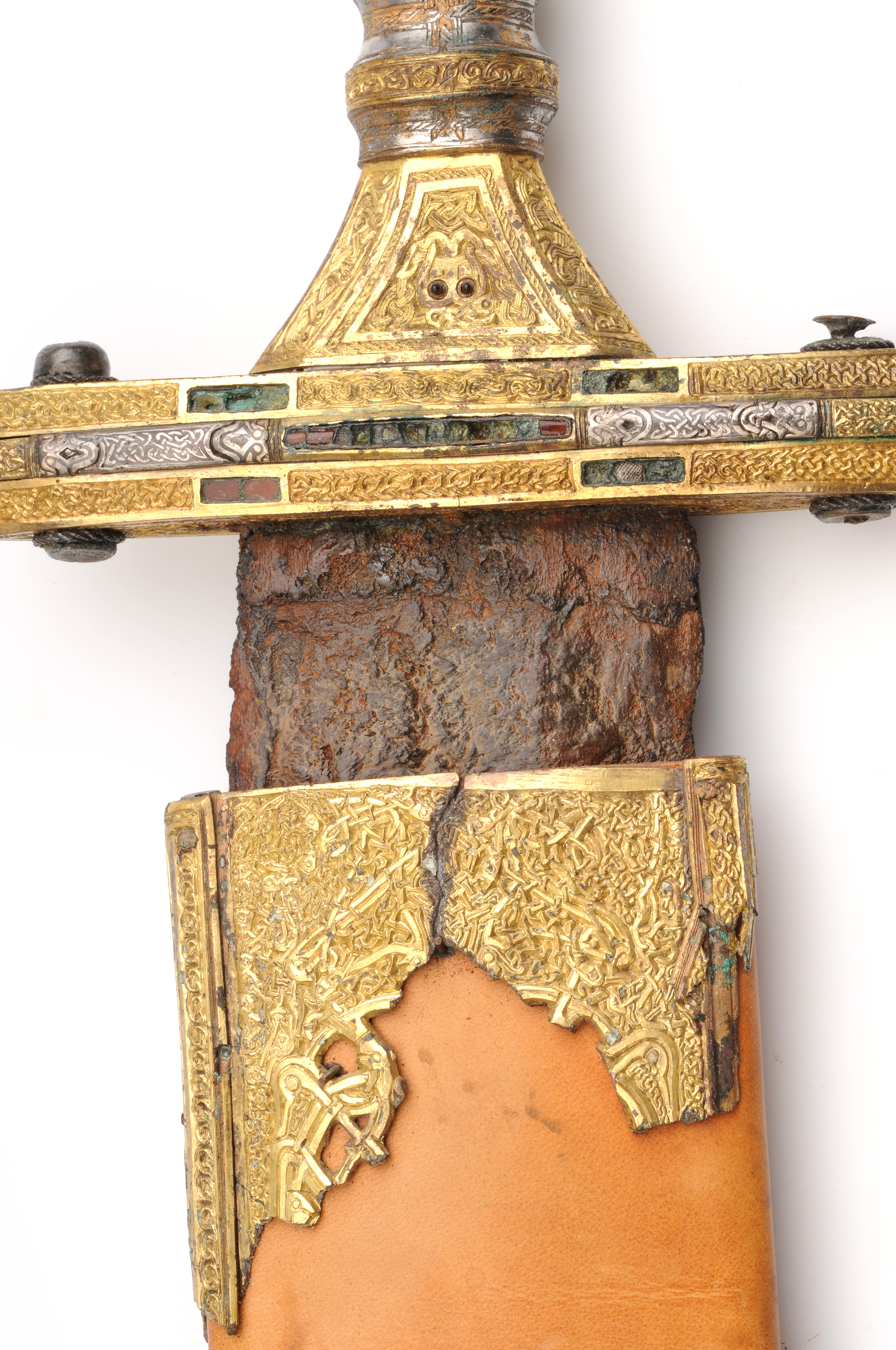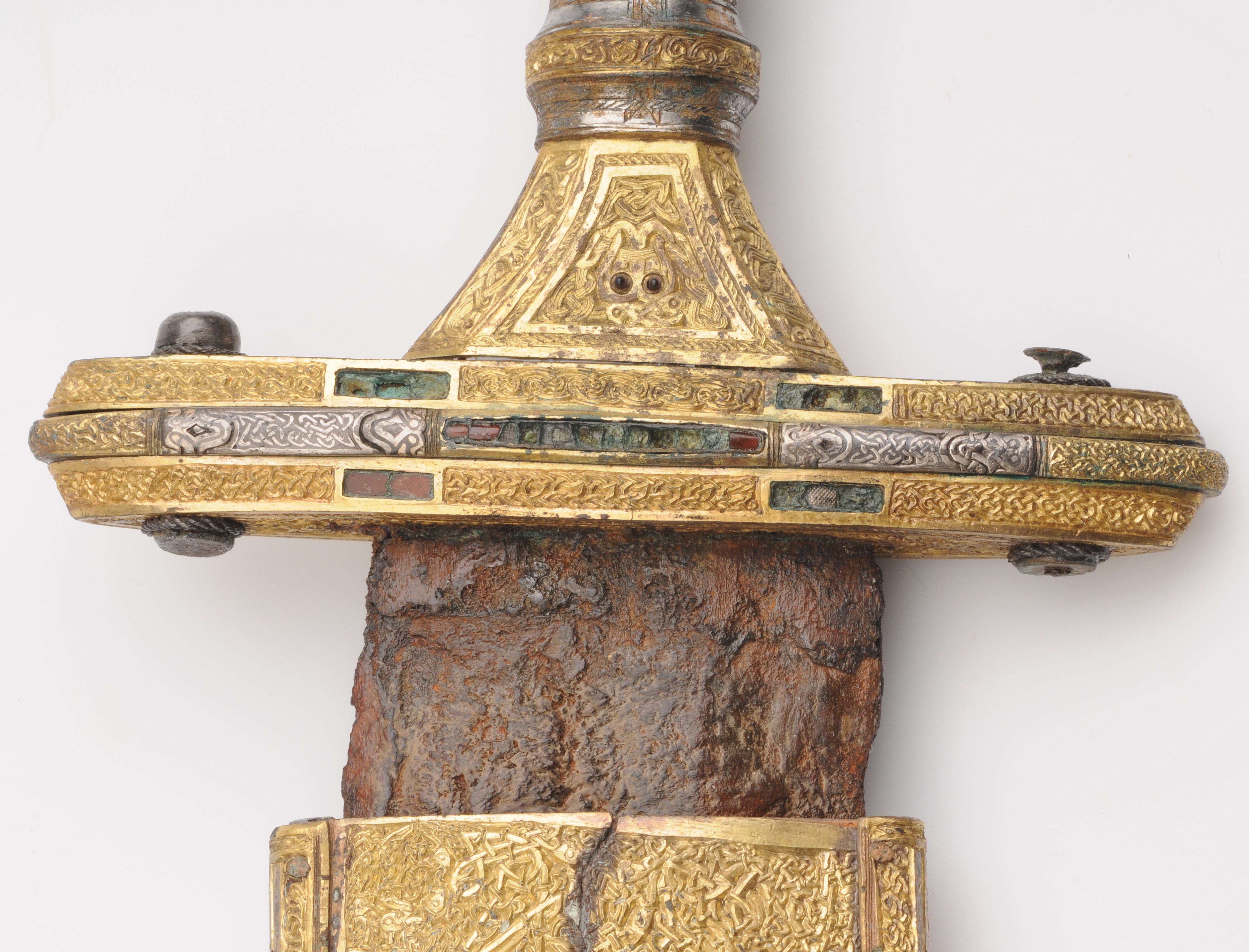 Fästet och övre delen av klingan till ett präktigt järnsvärd. Fästet är utfört i förgylld och försilvrad, fint ciselerad brons. På framsidan av vardera tvärstången två infällda rektangulära silverplåtar med djurornament i niello, har granatskivor inlagda. Rekonstruerad svärdsskida.