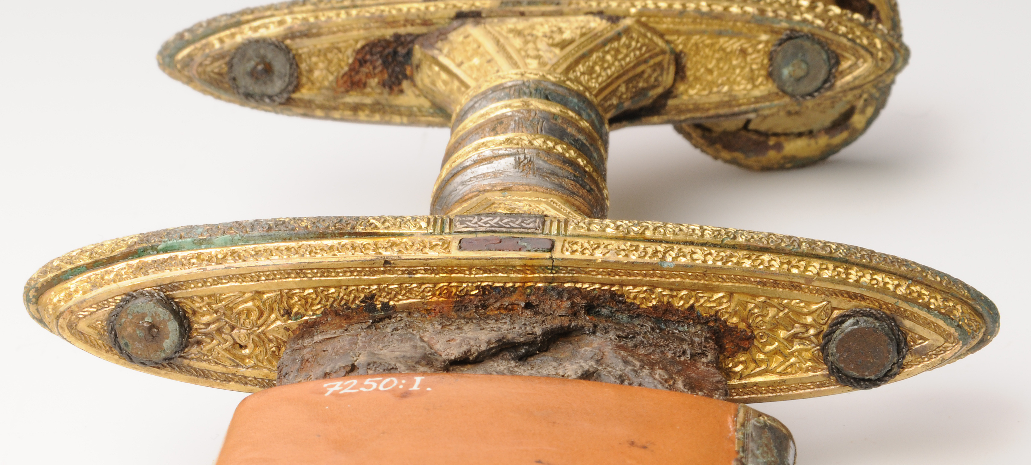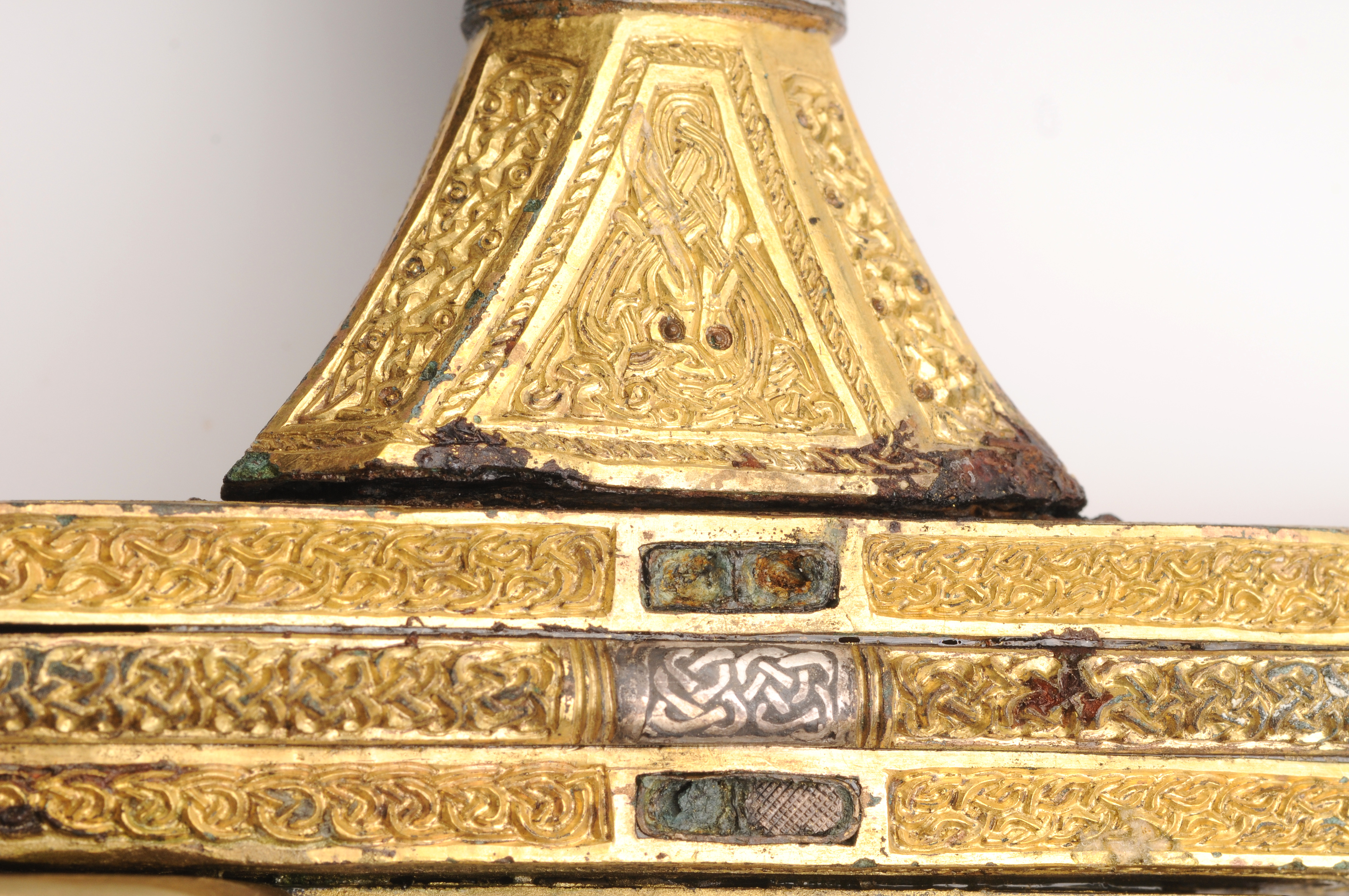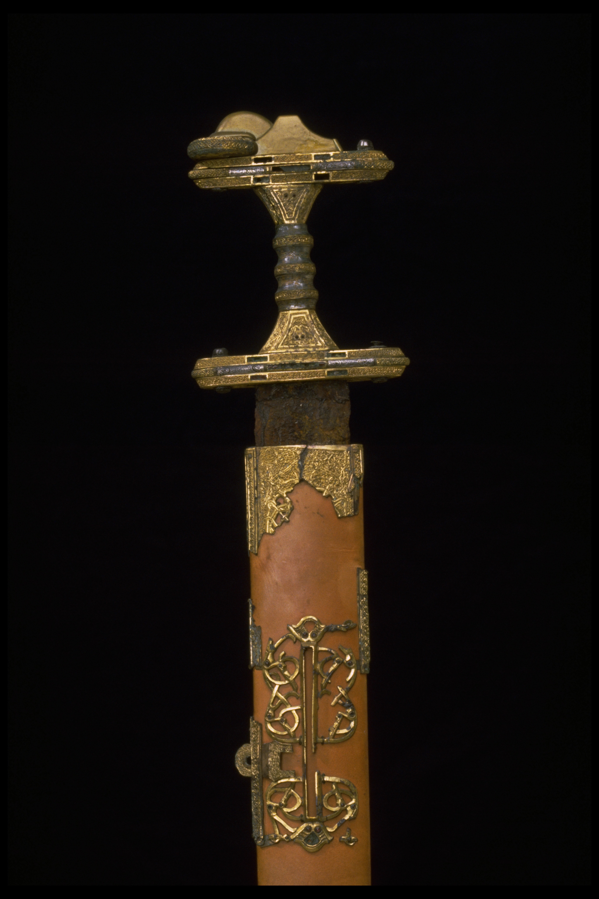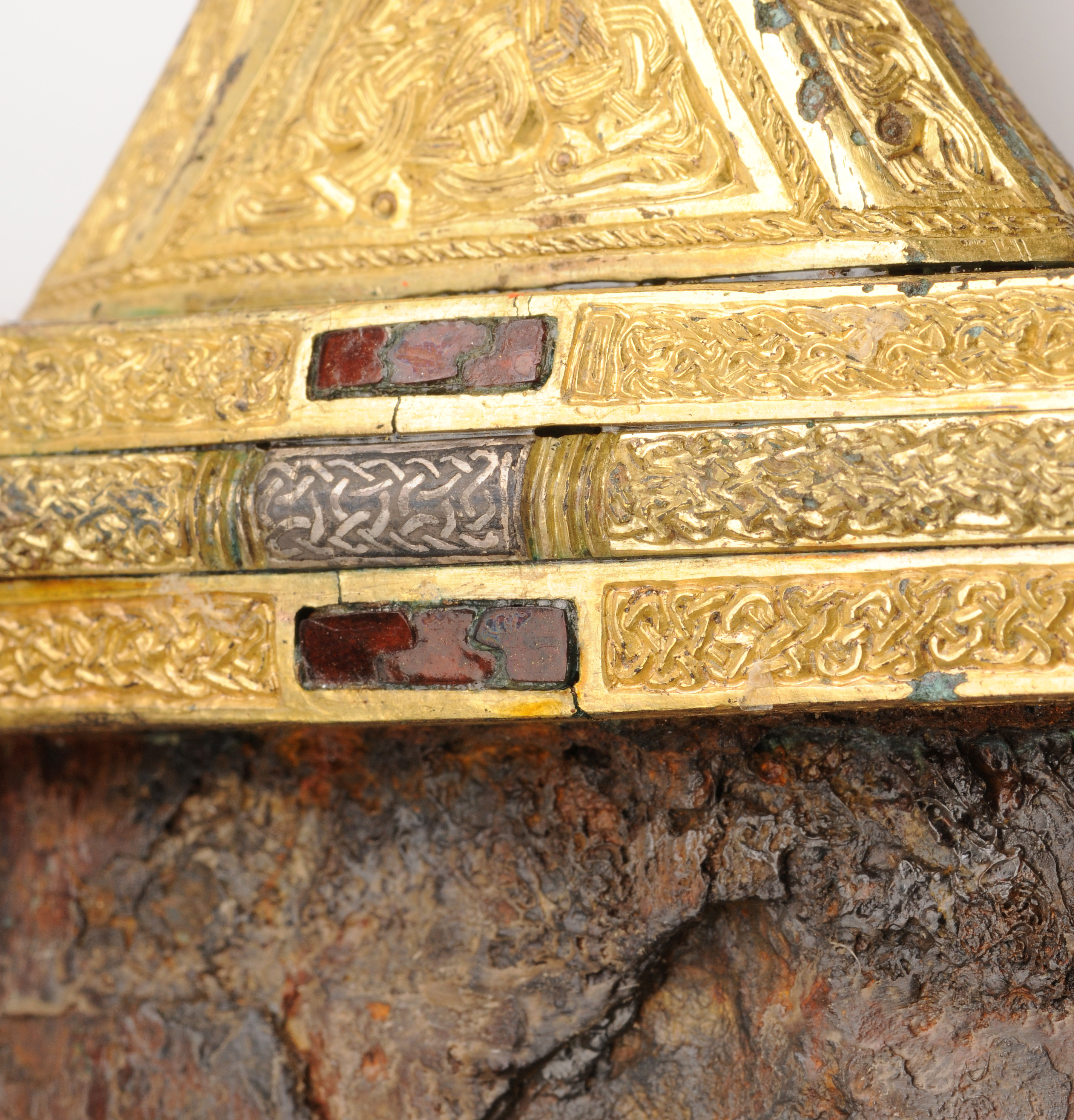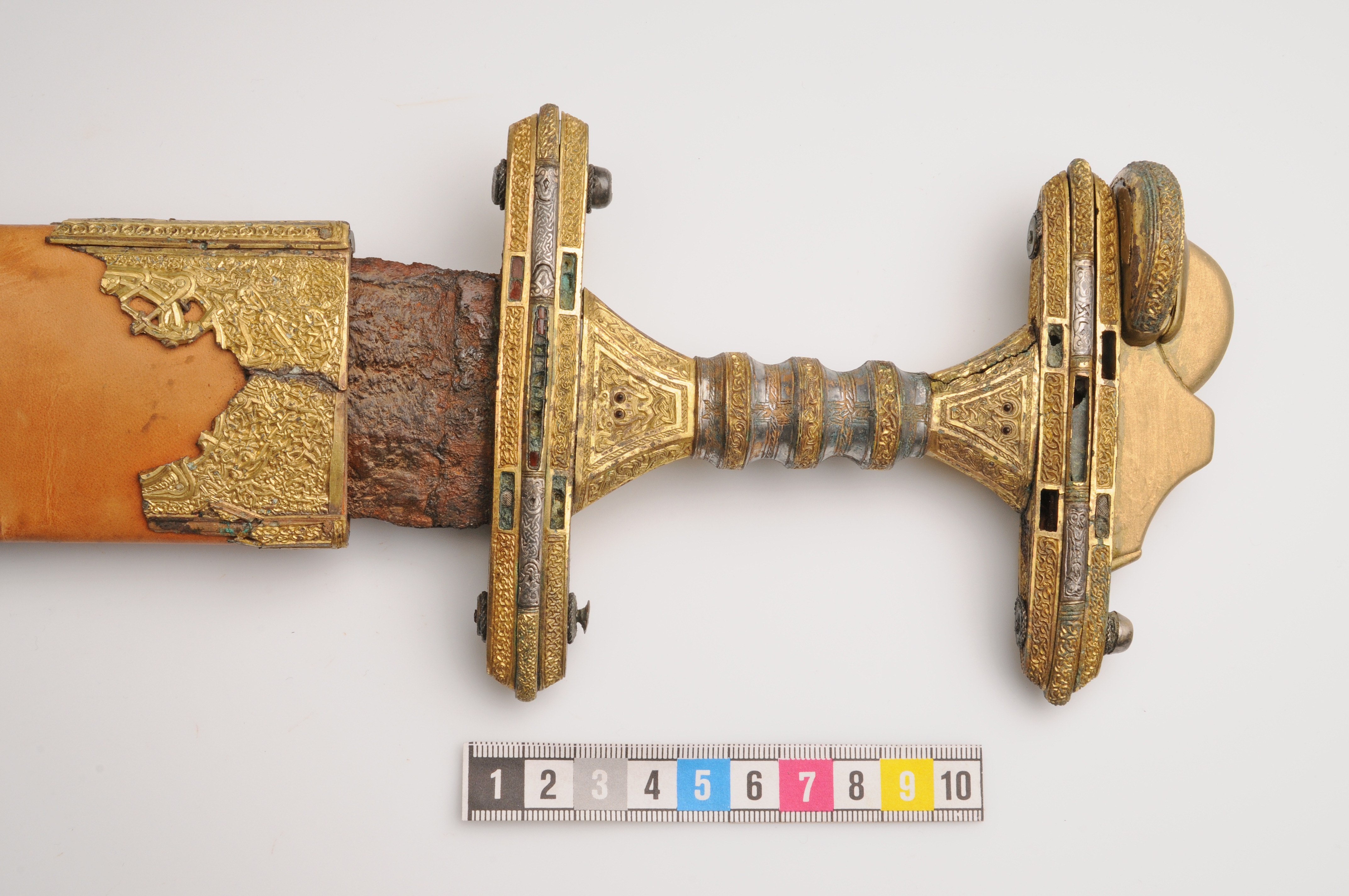 Fästet och övre delen av klingan till ett präktigt järnsvärd. Fästet är utfört i förgylld och försilvrad, fint ciselerad brons. På framsidan av vardera tvärstången två infällda rektangulära silverplåtar med djurornament i niello, har granatskivor inlagda. Rekonstruerad svärdsskida.