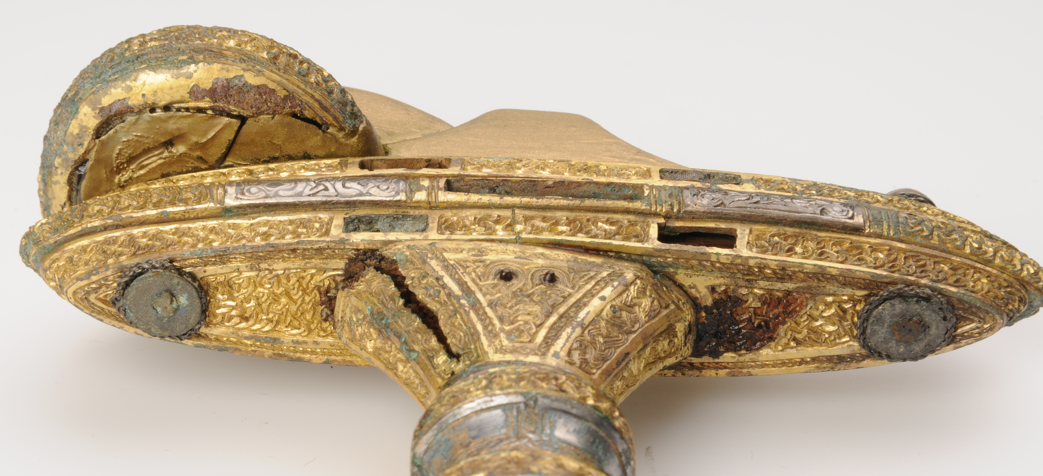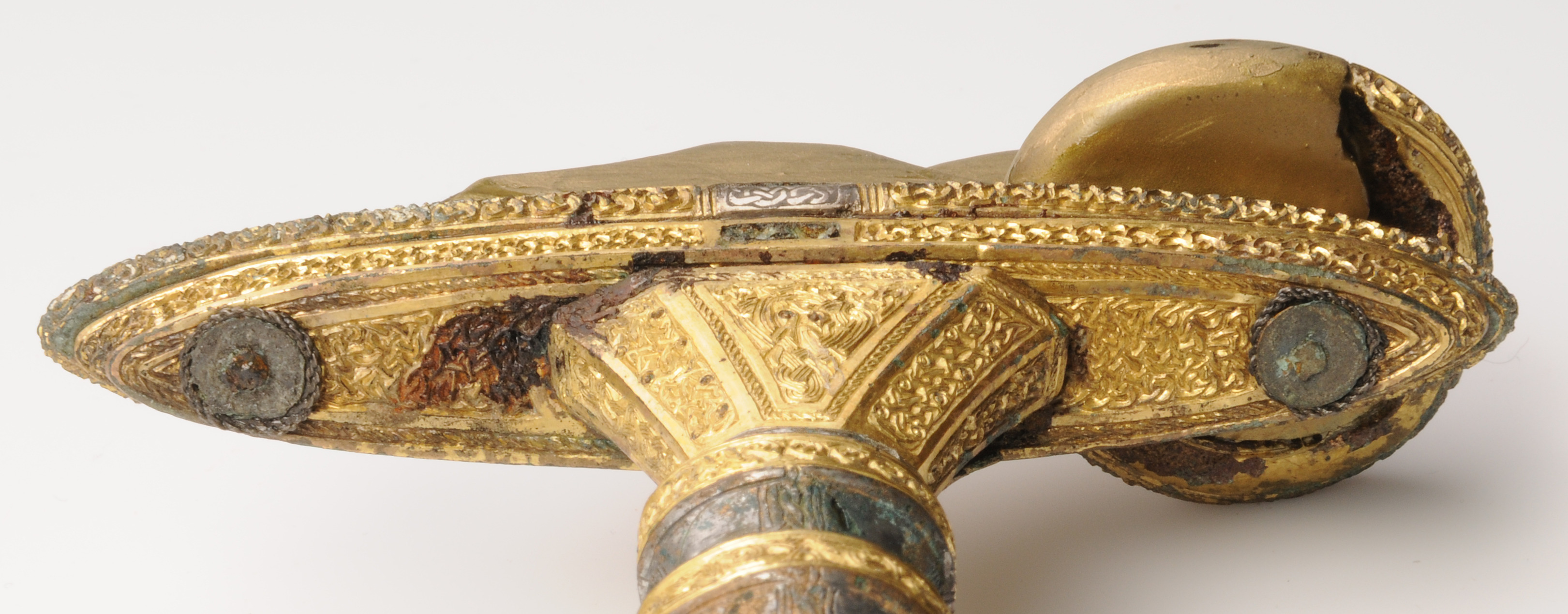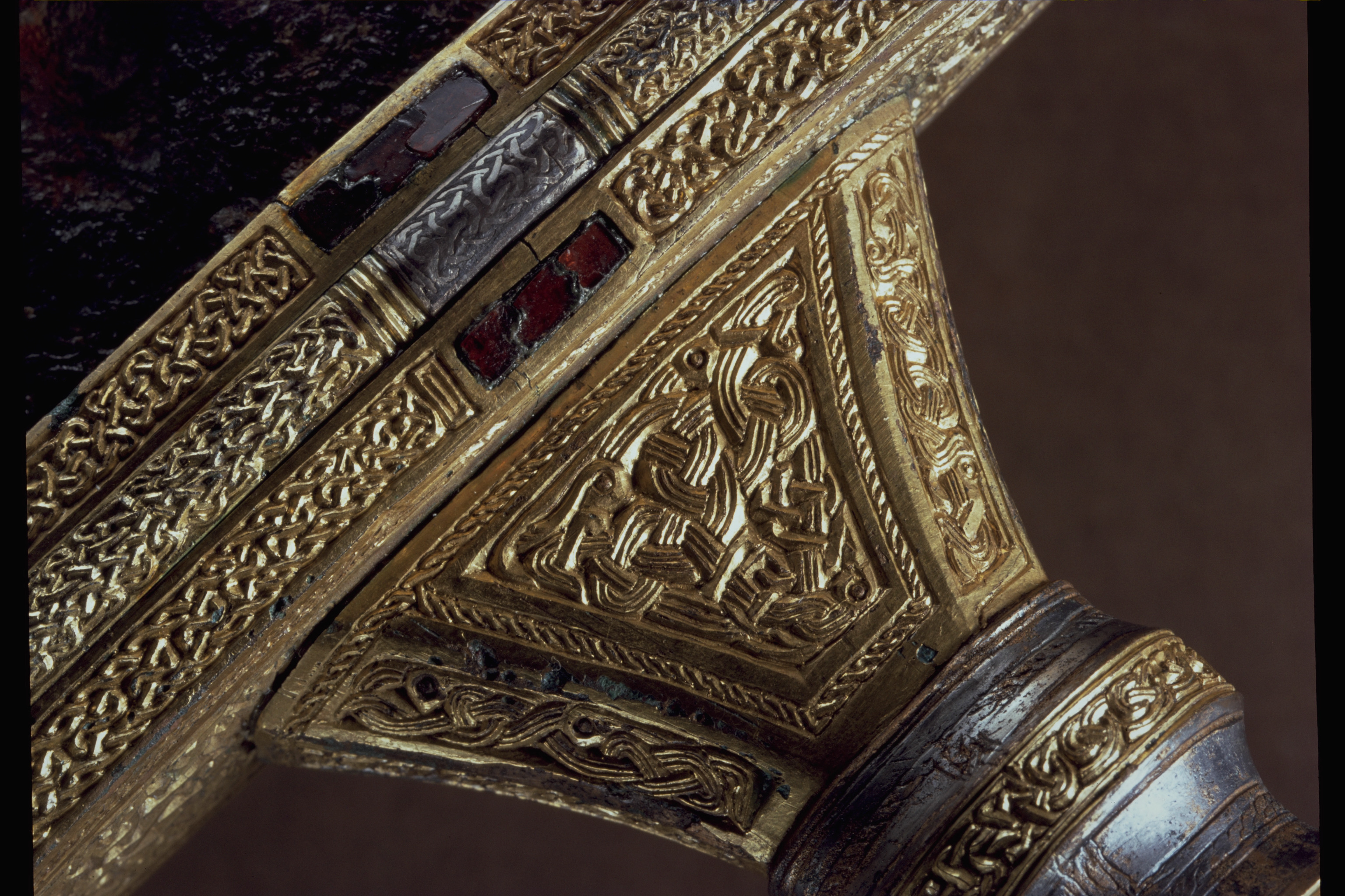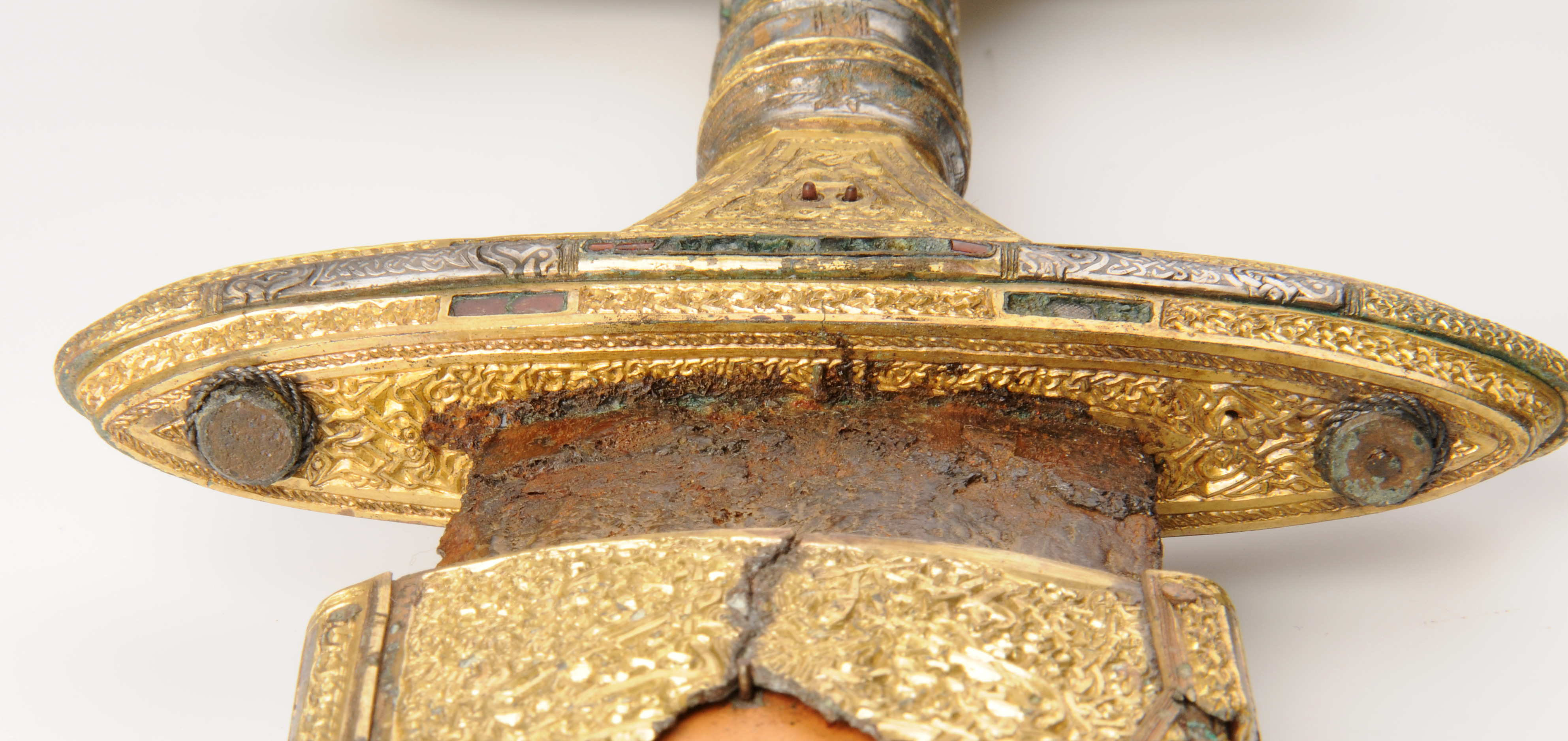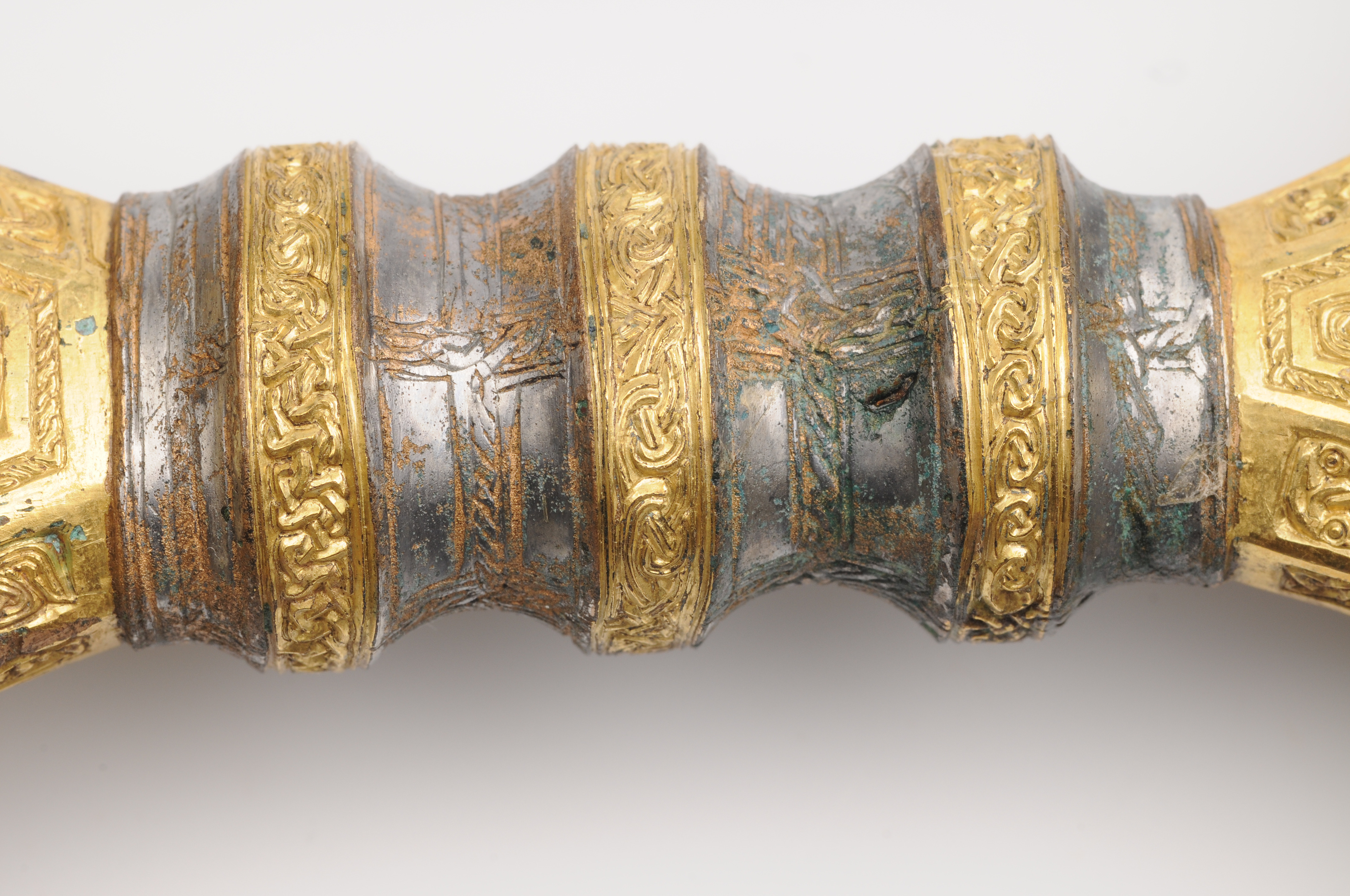 Fästet och övre delen av klingan till ett präktigt järnsvärd. Fästet är utfört i förgylld och försilvrad, fint ciselerad brons. På framsidan av vardera tvärstången två infällda rektangulära silverplåtar med djurornament i niello, har granatskivor inlagda. Rekonstruerad svärdsskida.