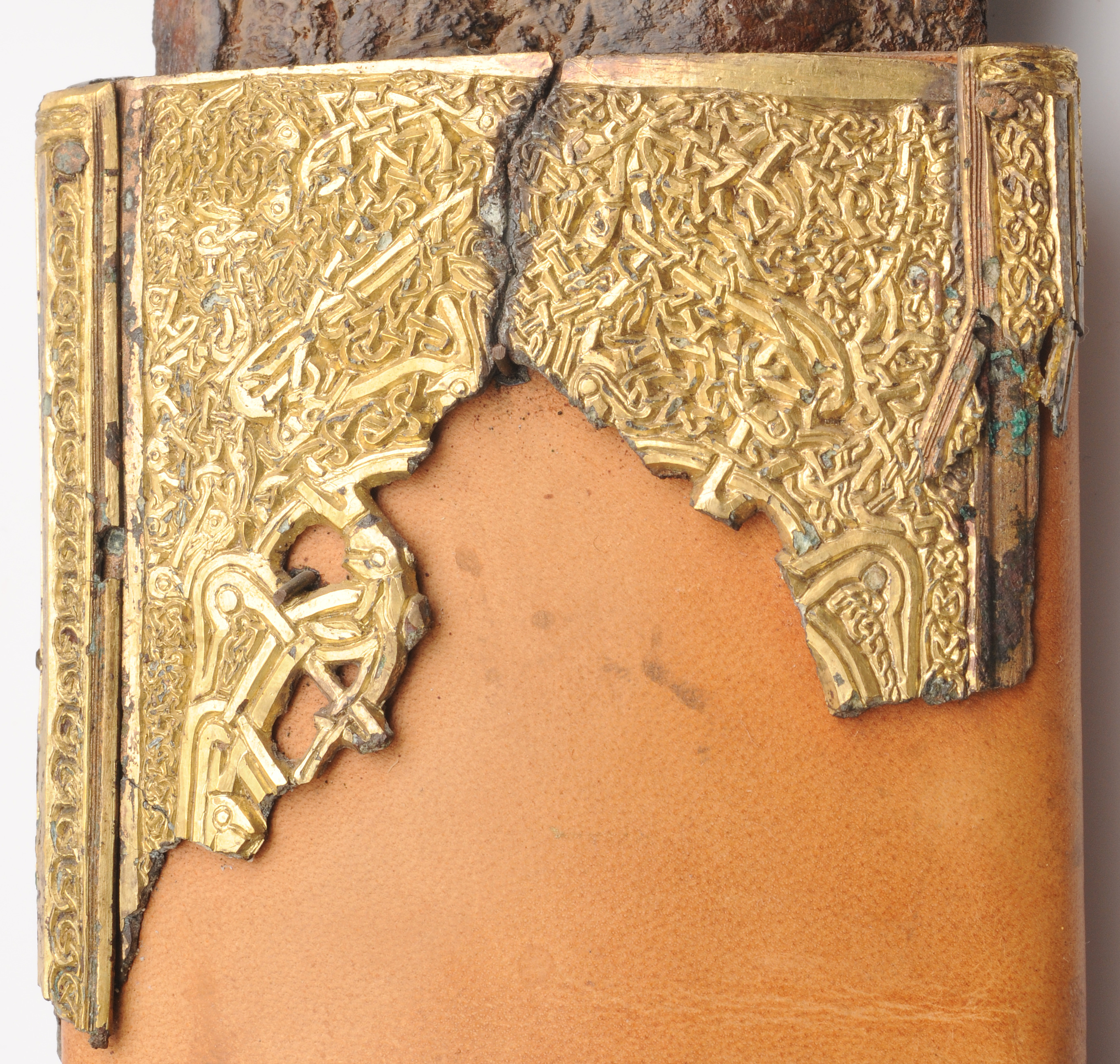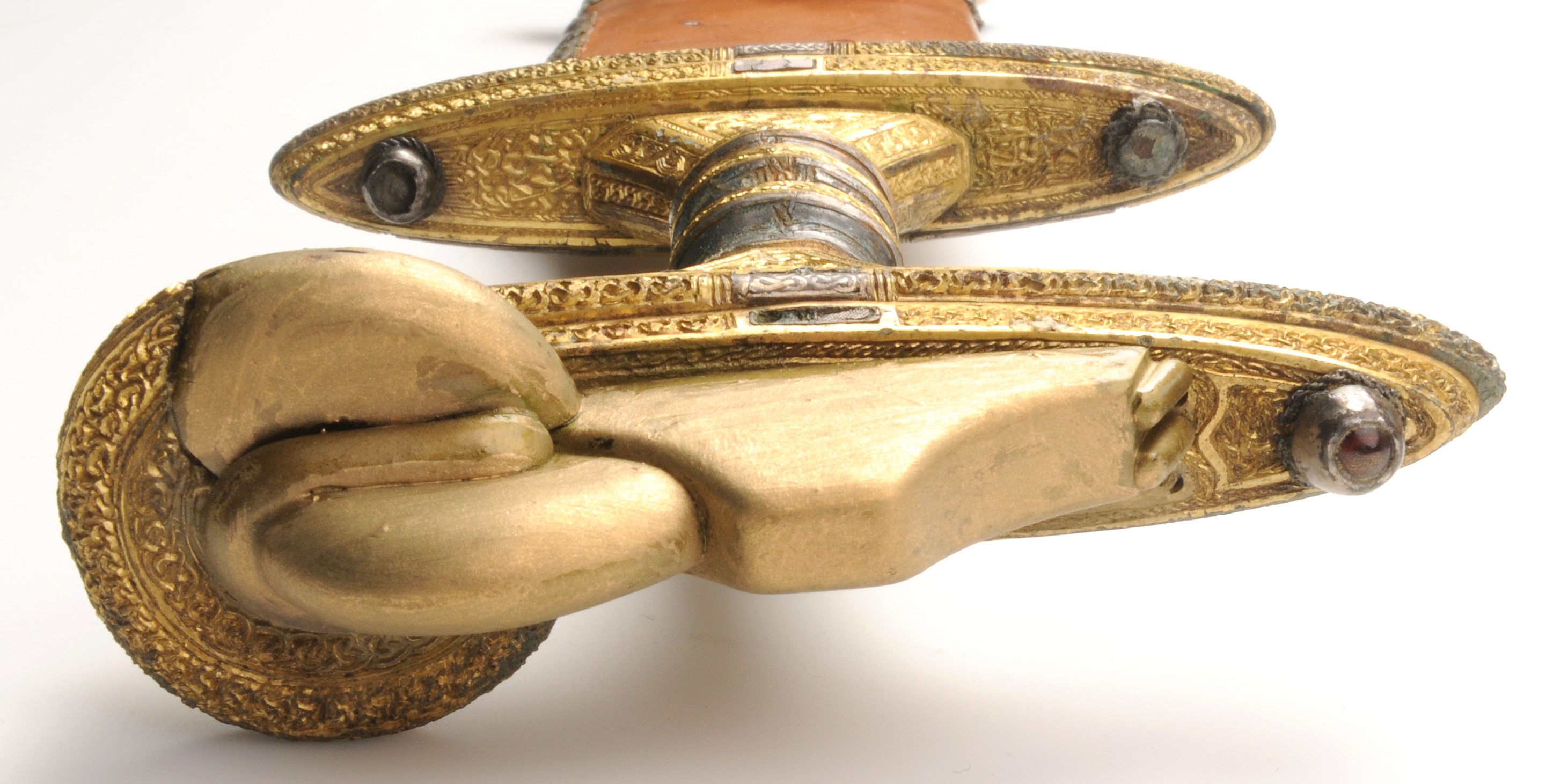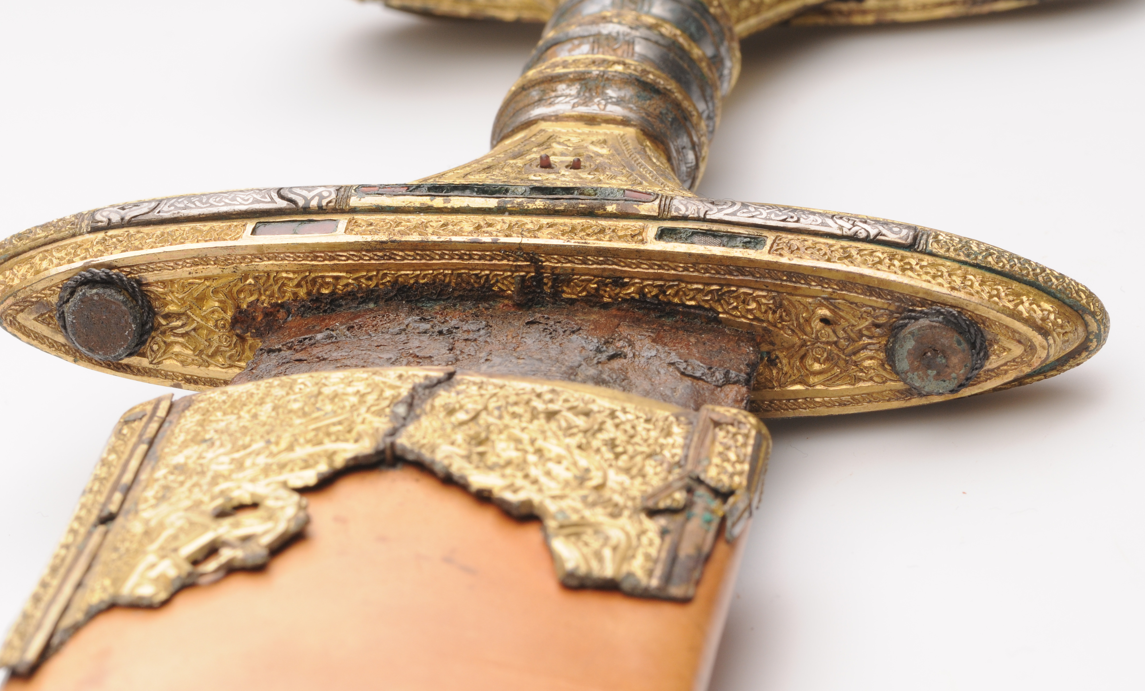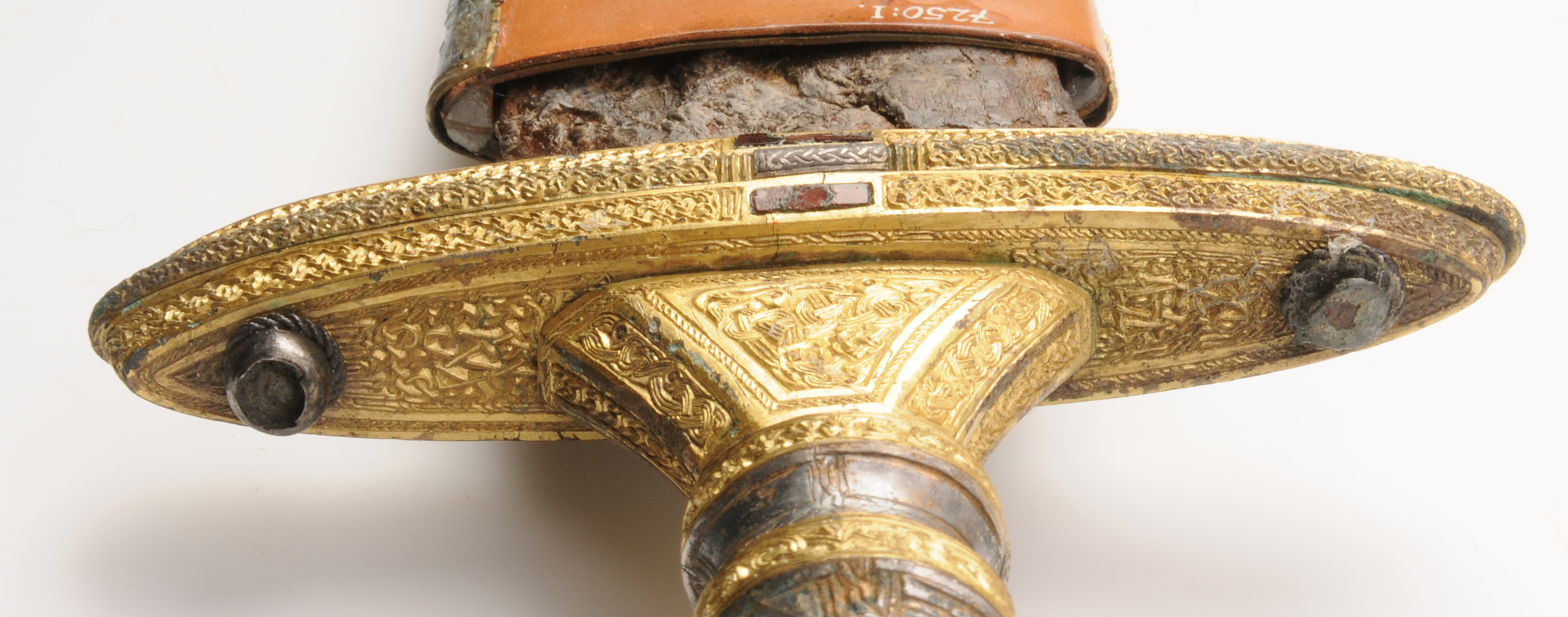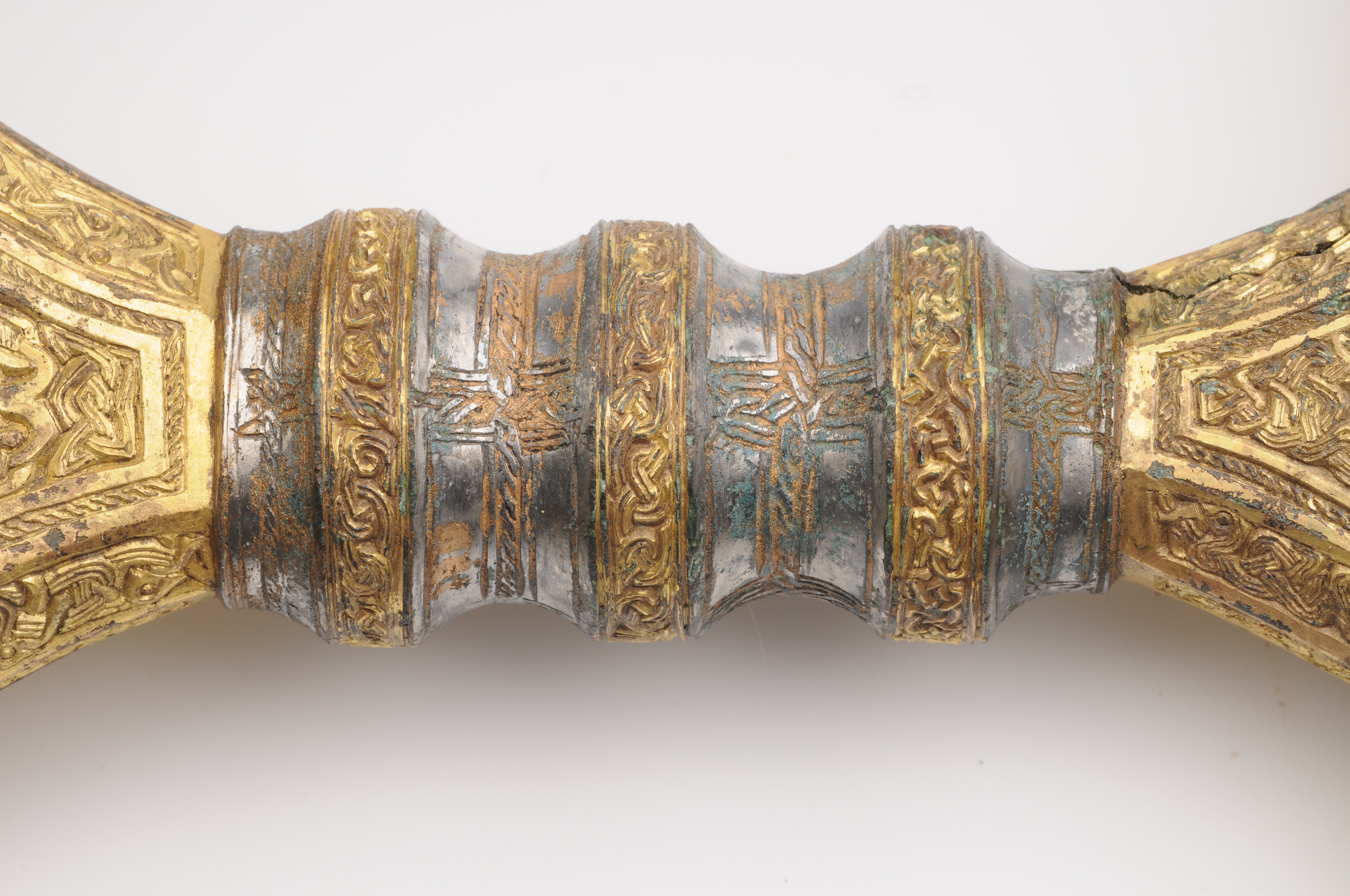 Fästet och övre delen av klingan till ett präktigt järnsvärd. Fästet är utfört i förgylld och försilvrad, fint ciselerad brons. På framsidan av vardera tvärstången två infällda rektangulära silverplåtar med djurornament i niello, har granatskivor inlagda. Rekonstruerad svärdsskida.