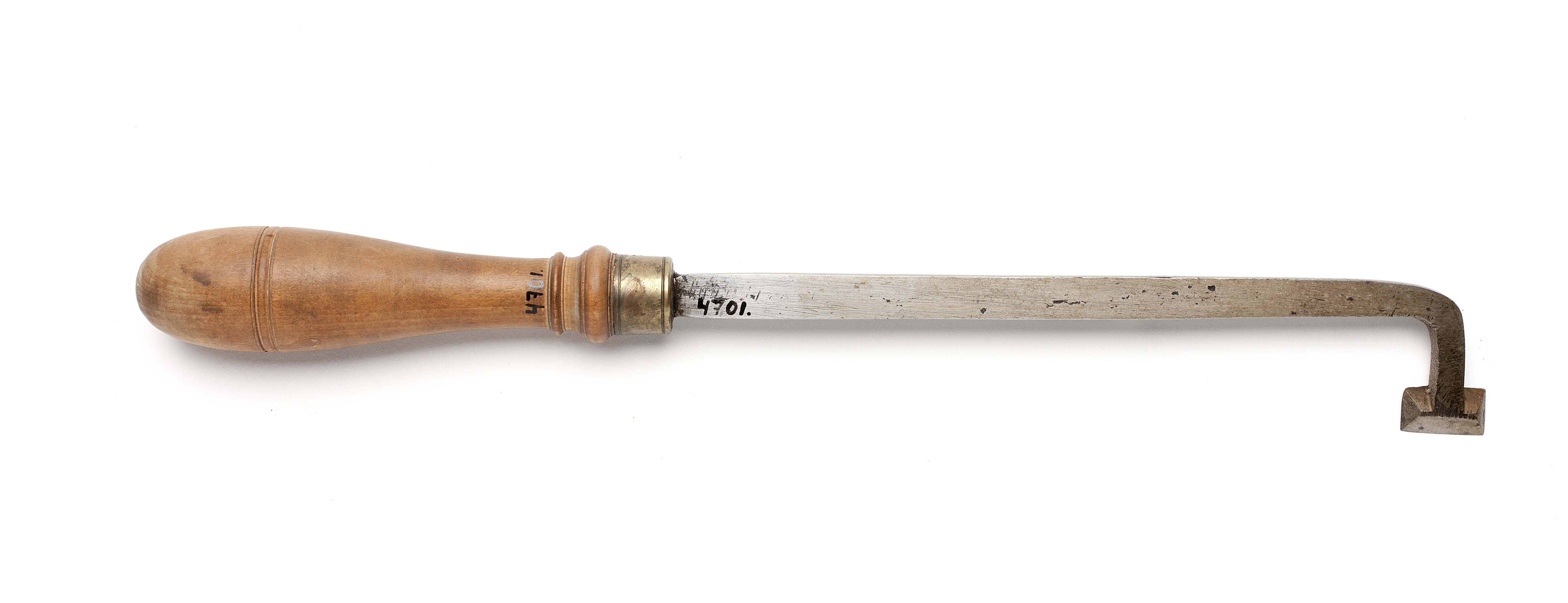 Klinga med rektangulär genomskärning. Böjd ände. Brett, rektangulärt stål med främre egg efter tre sidor. Svarvat skaft av päronträ med två vulster nedtill ("skoklostertyp"). Mässingsring.