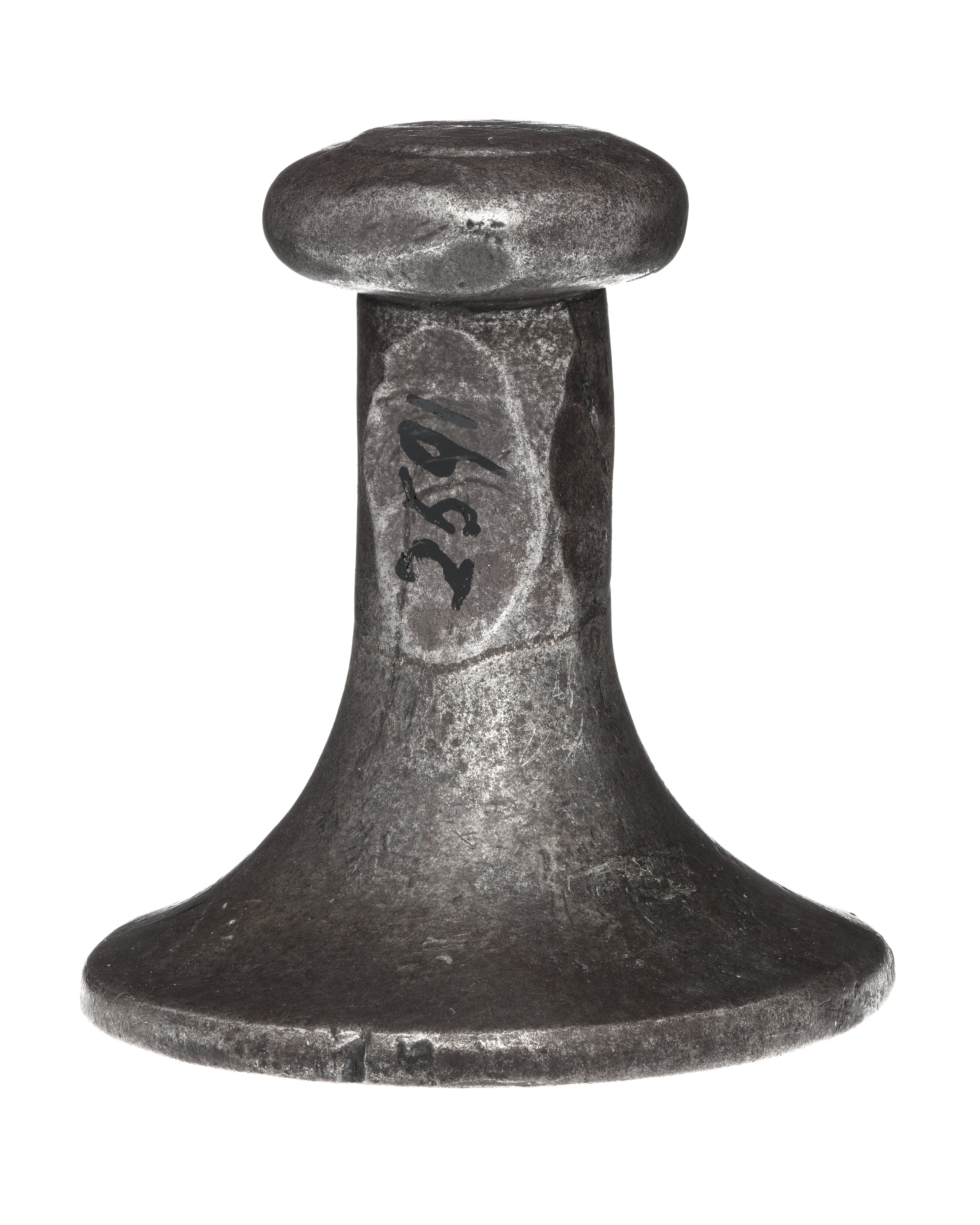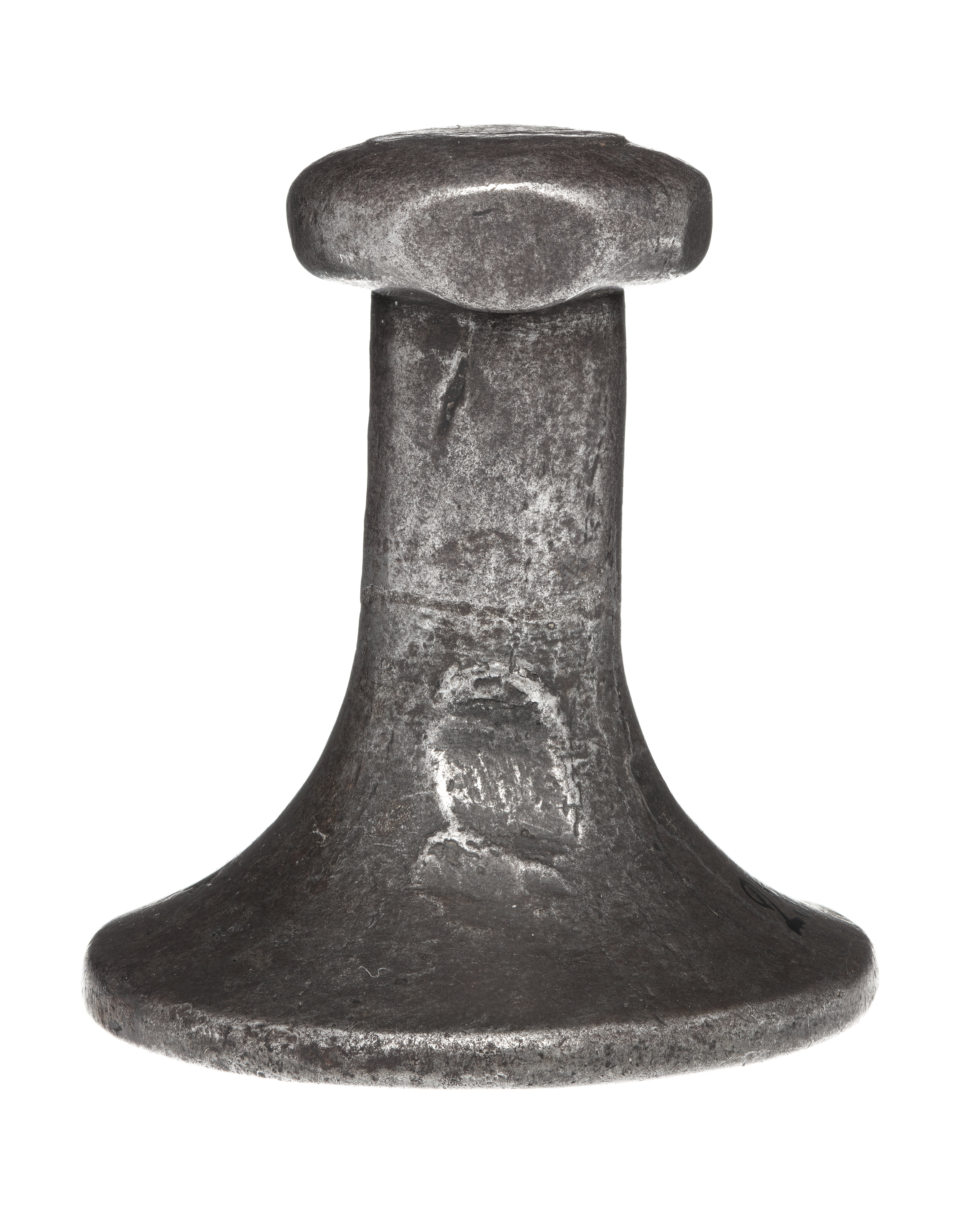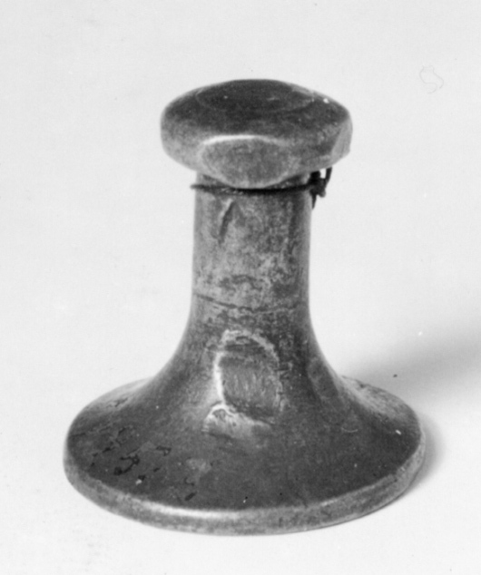 Helt av stål. Oval platta, däri graverat svenskt riksvapen, fyrdelad sköld med tre kronor och folkungalejonet, hjärtsköld Pfalz-Zweibrücken. Skölden krönt av kunglig krona, sköldhållare två krönta, utåtseende lejon, postament av rullverk. Spegelvänd omskrift upptill: "C.XII R.S" (den andra ettan senare tillagd). Kantbård i form av palmbladskrans. Ovansidan konisk, övergående i skaft, avslutat med oregelbundet rundskiva, d: ca 15 mm.
