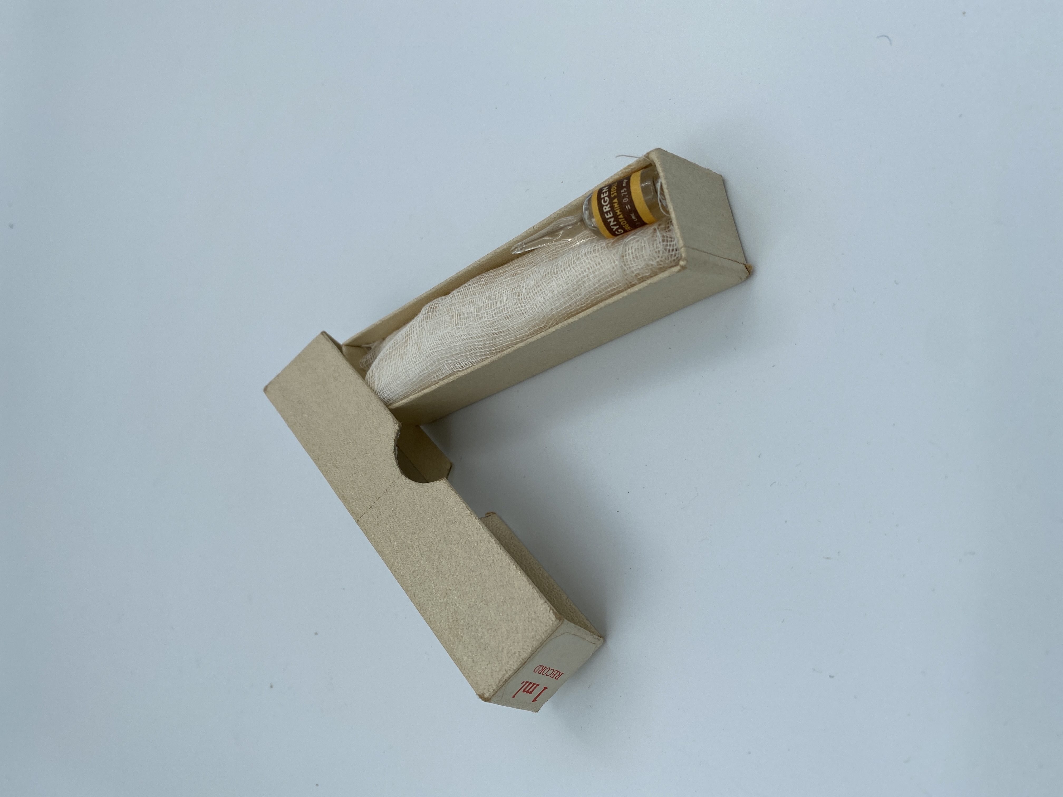 En kanyl i flera delar med ampull med vätska "Gynergen" "Ergotamina Stoll". Tillhörande också kompress i gasväv, en picett samt spatel mm. Förvaras hoprullat i kompress i en ask med lock