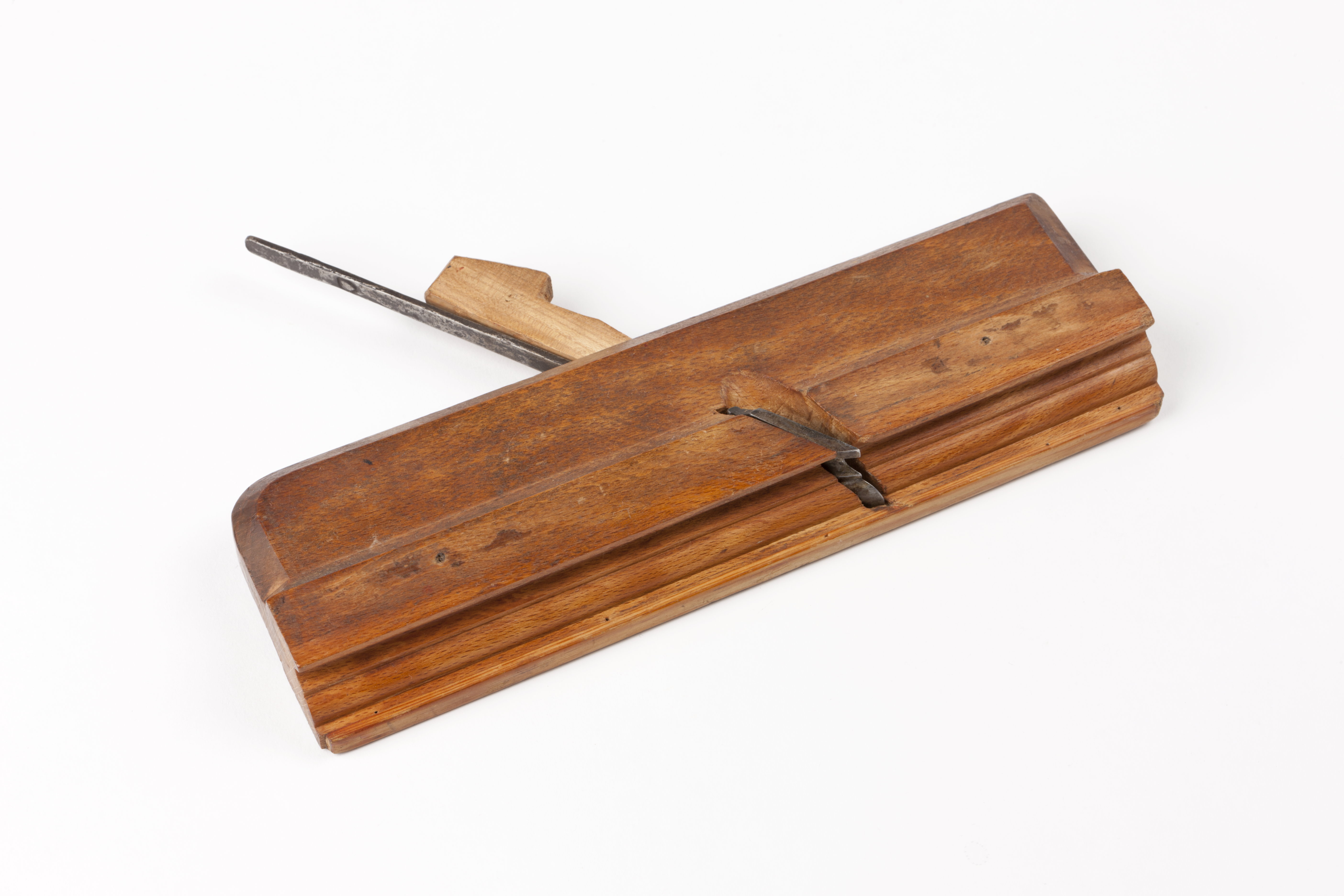 Av rödbok, sammansatt fin profil, på ena sidan pålimmad furulist. Ny kil av alm. Eggens bredd: 23,8 mm. Järnet stämplat med hjärta, stocken med: "I:A". På stockens framsida skrivet "B 51" (?) med blyerts.