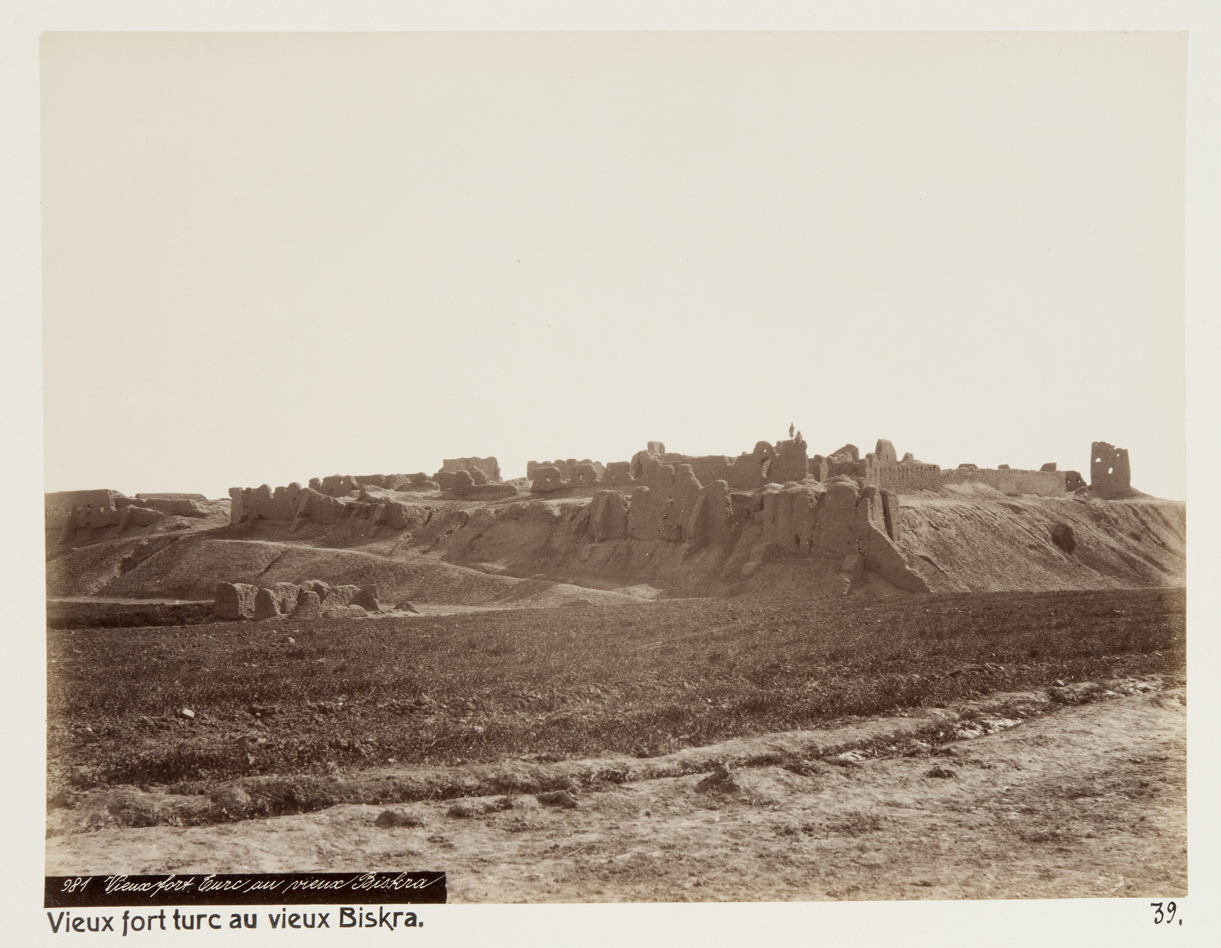 Det gamla turkiska fortet i gamla Biskra, Algeriet. Bilden är en dubblett till LXVI:F.40. Bilderna med inventarienummer LXVI:K.H.01.-137. är inköpta av Johanna Kempe, f. Wallis, i Alger, Biskra, Tunis, Constantine, Oran och Blidah vid hennes vistelse i nämnda städer tillsammans med sin dotter och svärson, Wilhelmina och Walther von Hallwyl, dotterdottern Irma samt fröknarna Caroline Pflaum och Ida Uhse under deras resa genom Algeriet och Tunisien samt åter över Schweiz 11 februari - 19 maj 1889. Förestående uppgifter lämnade med ledning av fröken Ida Uhses Reseanteckningar. Vissa av bilderna är dubbletter till bilder i inventarienummerserien LXVI:F.01.-138. som köptes in av Wilhelmina von Hallwyl under samma resa.