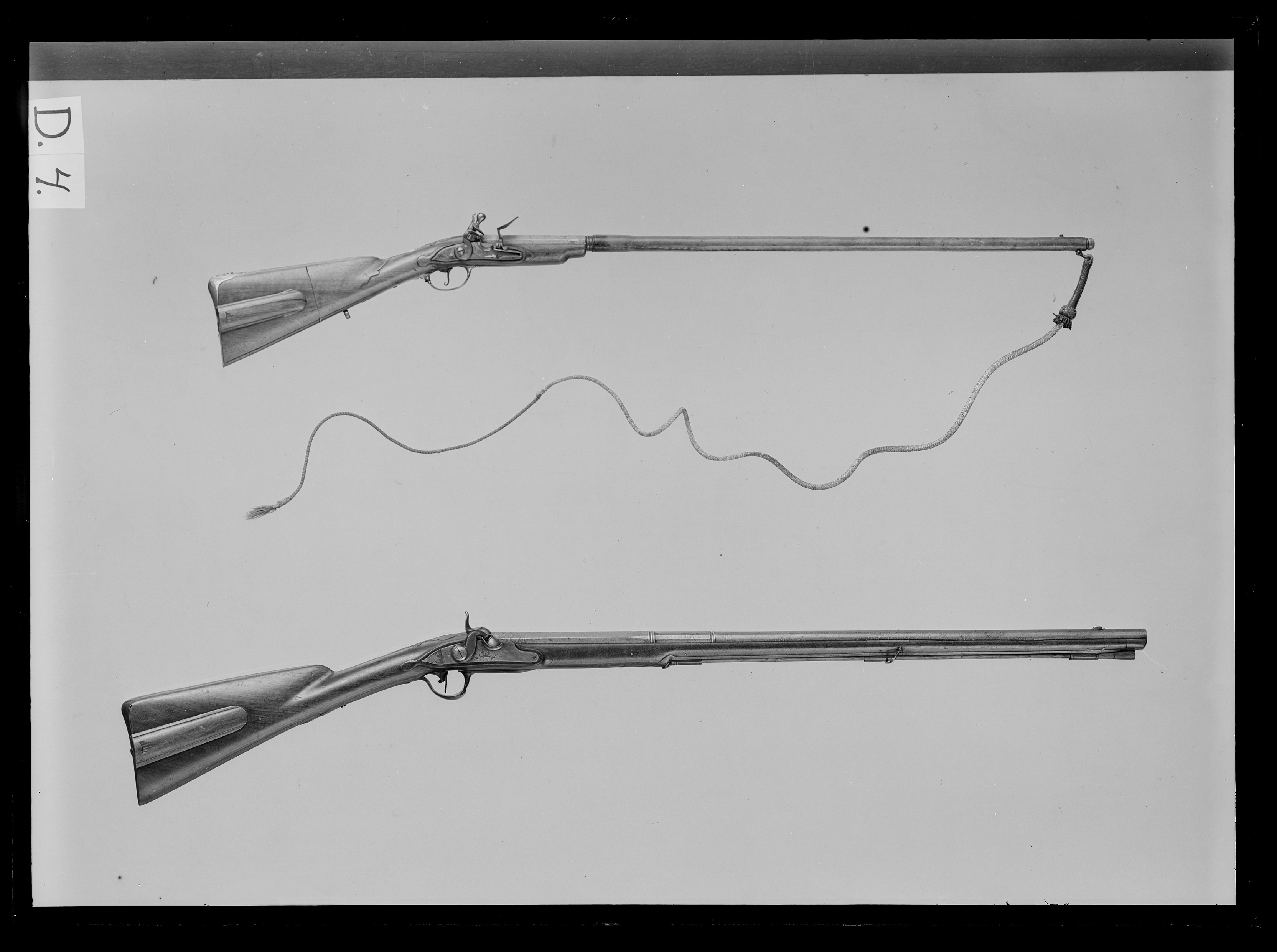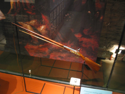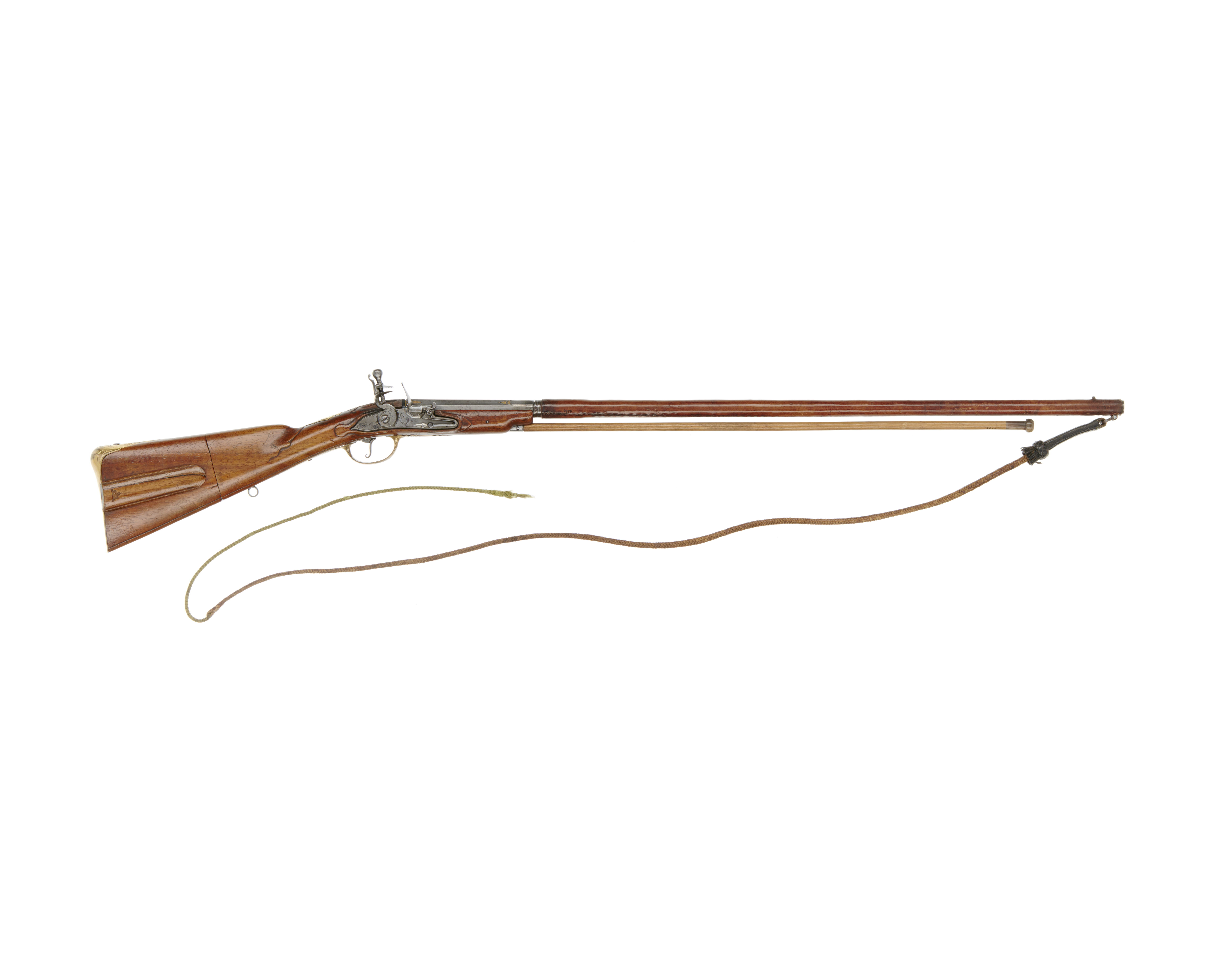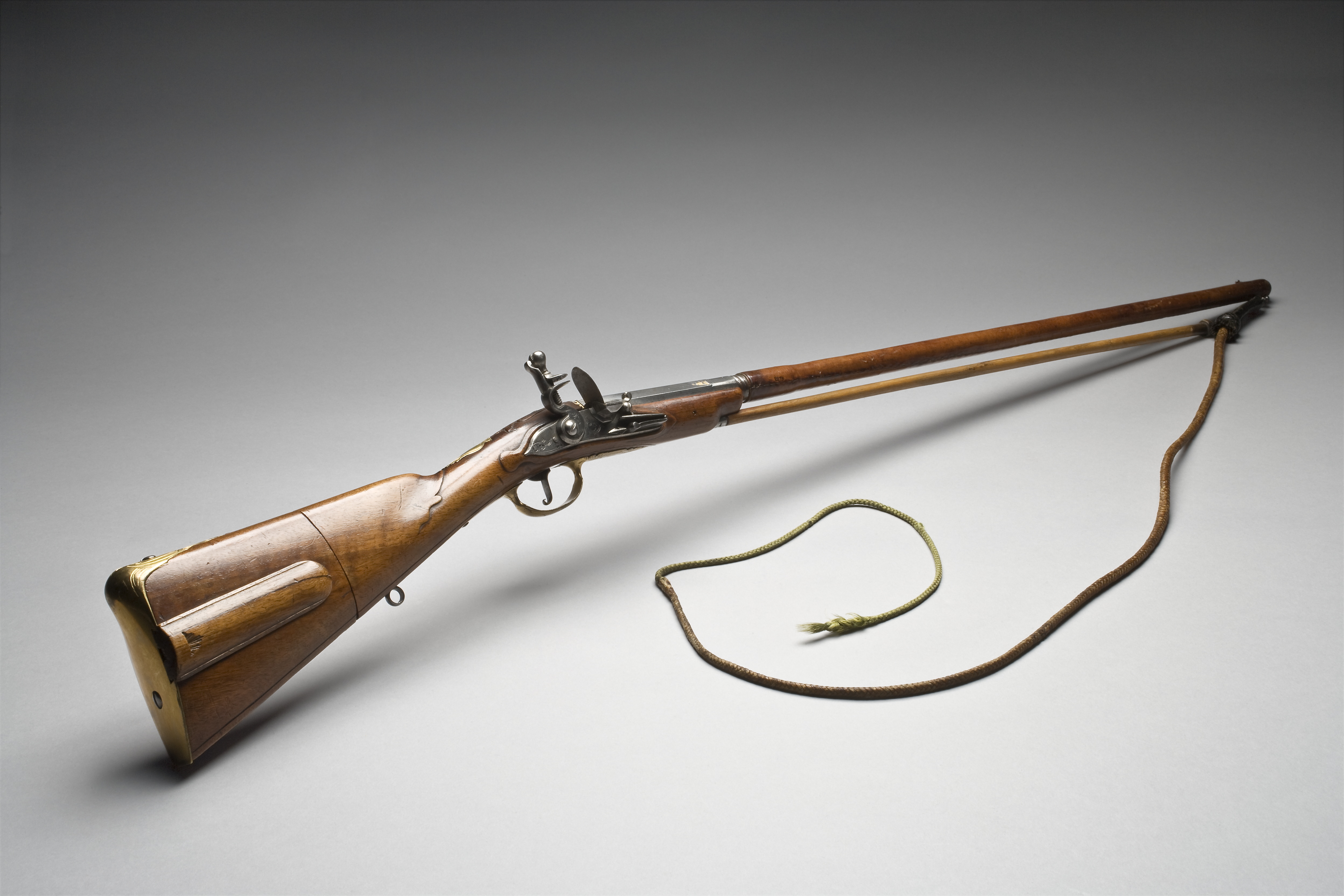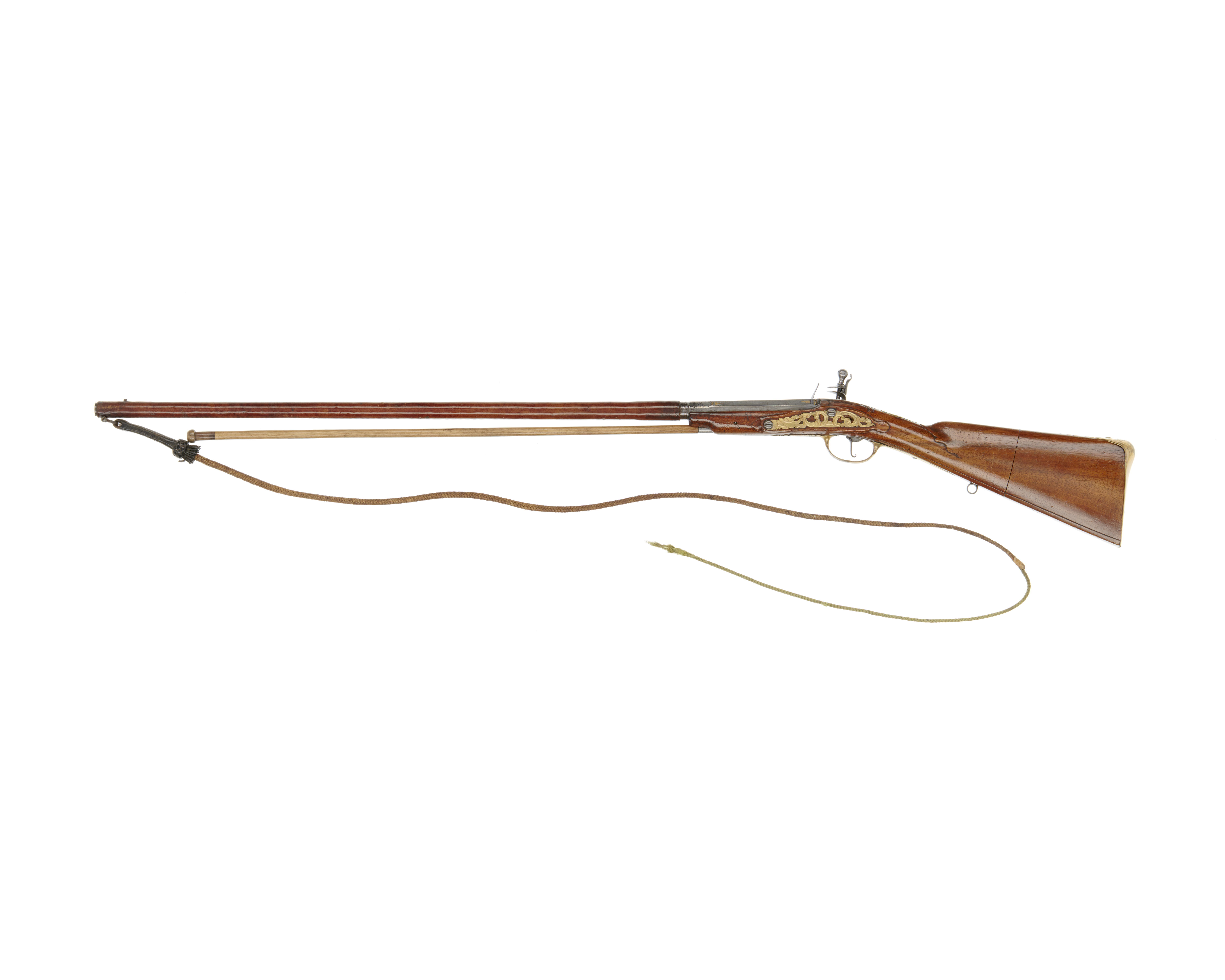 Pipa av stål i två delar, kammaren åttsidig med snidad, graverad och delvis förgylld dekor på svansskruvbladet, pipänden samt i ett band vid den andra änden. I framänden en gängad tapp för påskruvning av pipans främre del, kaliber 9,3 mm. Främre delen, l: 558 mm, rund och klädd med ljusbrunt skinn. I gängan i bakre änden kan skruvas en blånerad stålknapp med en blank nordstjärna, omgiven av blå strålar mot guldbakgrund (förvaras i kolvlådan). Pisksnärt, l: 1320 mm av grönt och vitt skinn samt grönt silke, liten tofs. Pisksnärten är fastskruvad i ögla på pipmynningens undersida. Förutom som hundpiska kan den också användas som bärrem till bössan. Flintlås med plant låsbleck, fasade kanter. Platt, s-formig hane med lös överkäke, motstöd på hanhalsen. Enkel, graverad dekor. Fästning: Två låsskruvar. Avtryckare med upprullad ände. Avtryckarbleck av stå., Halvstock av fransk typ med kolvlåda och enkel, snidad dekor. Kolven i två delar, den bakre delen avskruvbar. Ovanför kolvlådan skrivet med sepia (?): "No 18". Beslag av förgylld mässing. Bakplåt med graverad dekor på tungan. Varbygel med lång bakre och främre arm, graverad dekor. Kartuschformig tumplåt, genombrutet, graverat sidbleck. Bakom varbygeln är en ögla för pisksnärten-bärremmen inskruvad. Tillbehör: Laddstock, l: 555 mm med knopp av horn samt spiralvriden krats av stål, inskruvbar i laddstocksrännan. Karl XV:s samling nr 967. Hör troligen till Rosersbergssamlingen, inv. 1854 nr 12: "Bössa äfven gjord att begagnas såsom pistol eller piska, har tillhört drottning Ulrika Eleonora och af henne brukad på åkerhönsjakt."Bilaga DII:33