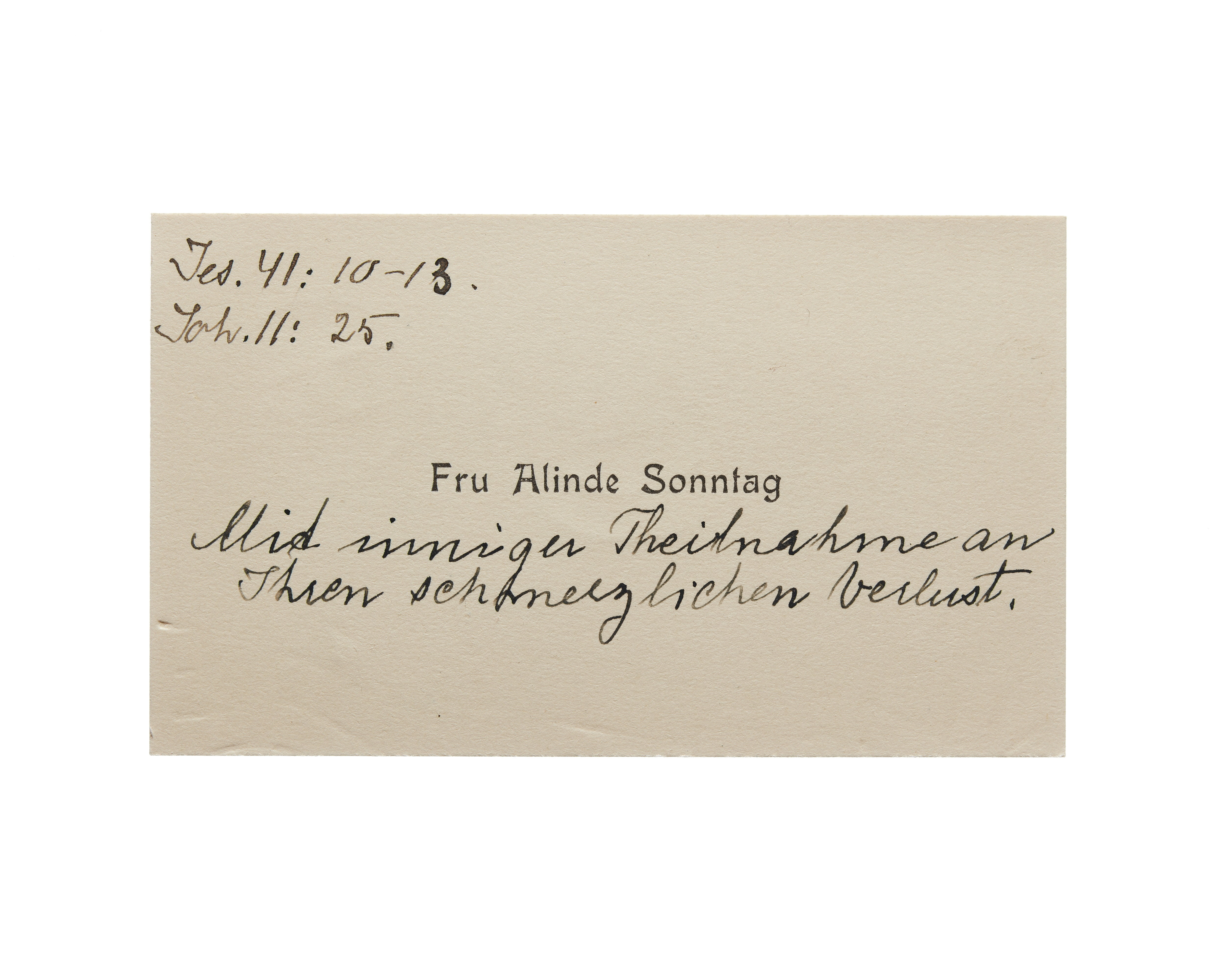 Ett visitkort från Fru Alinde Sonntag, daterat 1921. Handskrift "Jes. 41:10-13. Joh. 11:25. Mit inniger Teilnahme an Ihren [oläsligt] verlust".