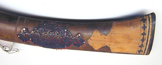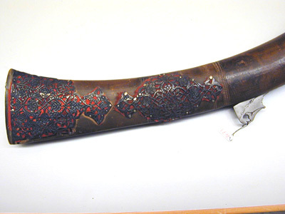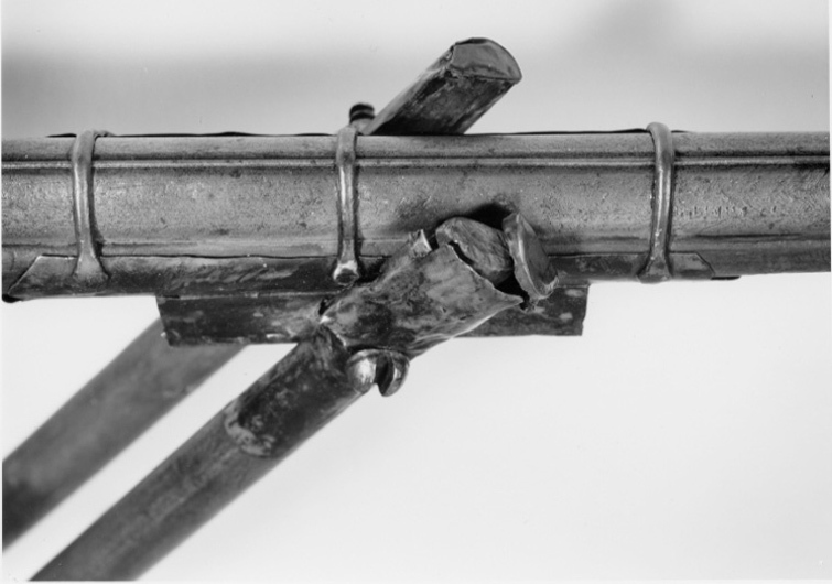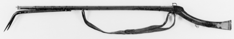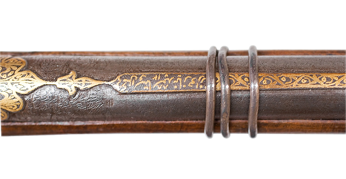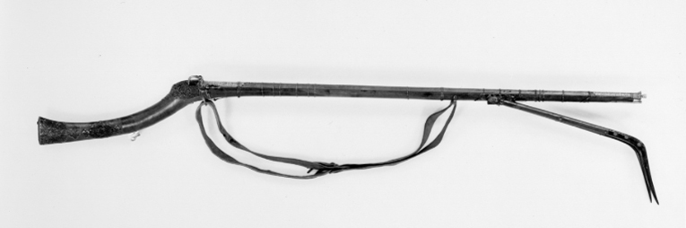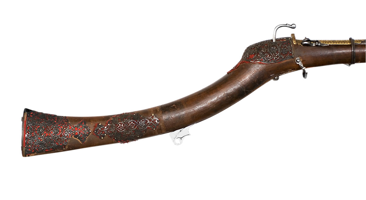 Rund, räfflad pipa av damaskerat stål med sex räfflor, vidgad mynning. Plana bommar. svansskruvblad och pipans bakre del med yttäckande ornering av påslaget guld i form av växtornament, ribba med likadan dekor samt inskrift av påslaget guld (enl.kat.kort persisk skrift: Aamale oosta Seyed Nigazé Khaarazmee 1288 - gjord av Seyed Nigazé Khaarazmee 1875 c). Ribban övergår i smal ås längs pipan. På främre delen av pipan åter yttäckande växtdekor av påslaget guld. Sikte i form av hål genom en baktill. Då pipan uppstående spetsig skiva av stål med dekor av påslaget guld. Knoppkorn av mässing. Fängpanna av stål fäst vid pipan, horisontalt rörligt fängpannelock, välvt och beslaget med mässing, knoppformig avslutning. Pipan fäst med krysskruv underifrån samt med 17 smala stålband, det främsta med genombrutet silverbeslag på undersidan. Invändigt luntlås av indisk typ med hane av stål, kluven till luntklämma med runt tvärsnitt. Hävstångsavtryckare av stål, stort fingergrepp med tvärgående, runt hål. Brun helstock av trä med lång, smal, kraftigt nedåtsvängd kolv med något vidgad ände med spetsovalt tvärsnitt. Plan bakplåt av horn. På kolven och kolvnacken genombrutna, ciselerade silverbeslag i form av växtrankor, röd tygbotten (ylle). På kolven punsade band. Under fängpannan en bygel och däri fäst rensnål nr 9601, på motsatt sida en stålbygel med en ring. På kolvens undersida en lång, öppen ränna för avtryckaren. Ca 320 mm från pipans mynning är gaffeln, nr 9602 fäst i silverbeslag, fäst vid stocken med tre band av stål. På framstocken två stålbyglar med filad dekor för gehänget.