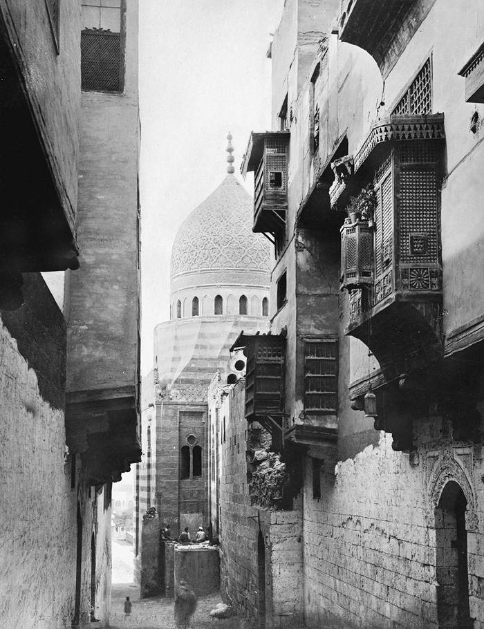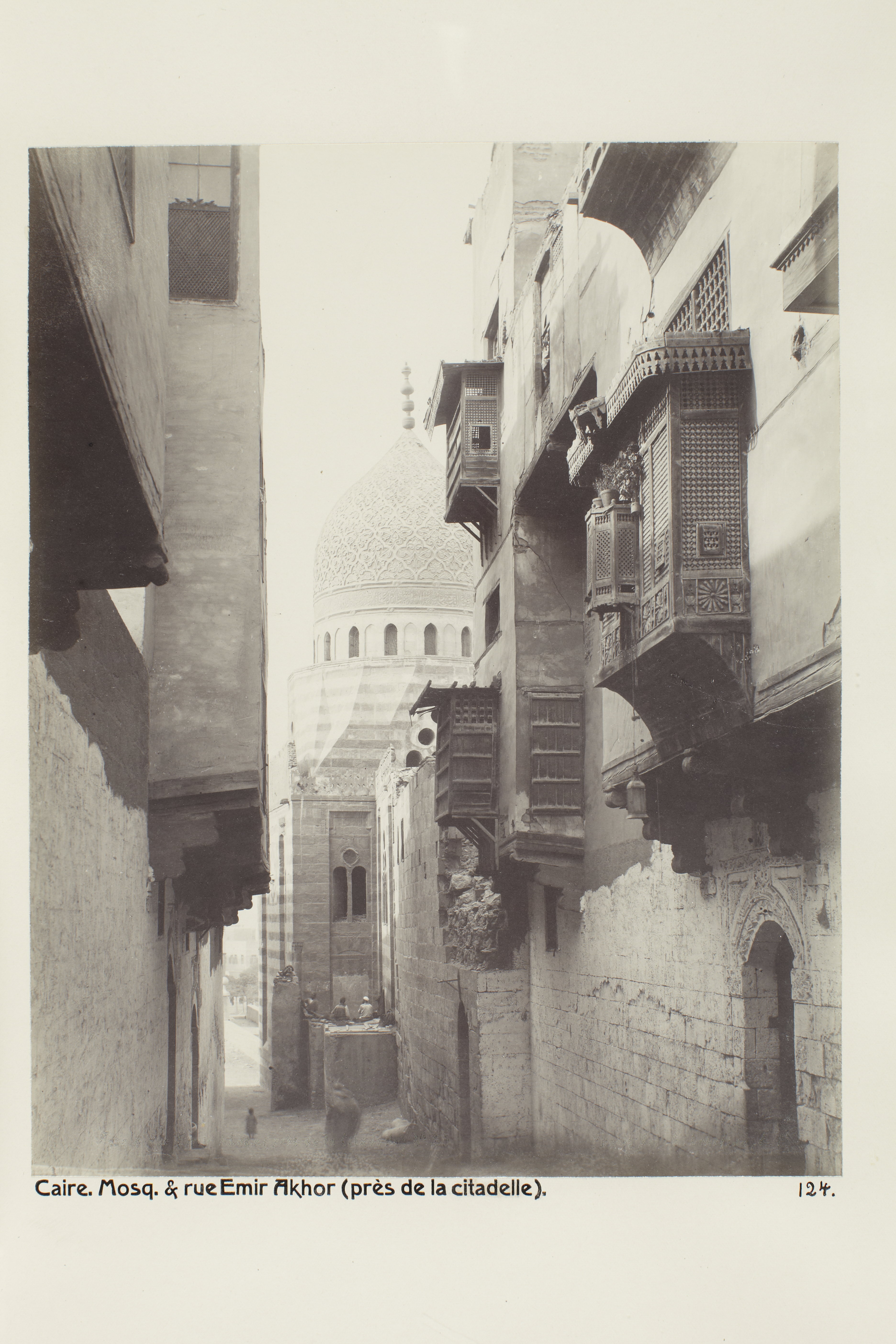 Moské och Emir Akhor-gatan (nära citadellet). Kairo, Egypten. Text på fotografiet: Caire. Mosq. & rue Emir Akhor (près de la citadelle). Fotografierna LXVI:M.01.- 201. kommer från resan till Egypten och Sudan som Wilhelmina och Walther von Hallwyl gjorde vintern 1900-1901. De lämnade Sverige den 5 november 1900 och fortsatte från Egypten till Palestina den 28 mars 1901. Med på resan var döttrarna Ellen med maken Henric de Maré och Irma med maken Wilhelm von Geijer. Wilhelminas sällskapsdam, fröken Ida Uhse reste också med. Under en del av resan anslöt sig ledamoten av Internationella domstolen i Kairo, assessorn Otto Conrad Waldemar Cedercrantz med makan Anna Elisabeth. Vid resan uppför Nilen hade Walther von Hallwyl hyrt ångfartyget Columbia med besättning. Båtresan startade i Kairo 27 december 1900, gick ända till Wadi Halfa varifrån man reste vidare med tåg till Khartum och tillbaka till Wadi Halfa. Båten vände åter i riktning mot Kairo, men det verkar som att sällskapet tog tåg sista biten, från Luxor. Henric och Ellen de Maré samt fru Cedercrantz lämnade båten redan då de passerade Luxor första gången. Resten av sällskapet återvände till Kairo den 1 mars. Fotografierna LXVI:M.01.-120. togs av resenärerna själva, de största av Ellen de Maré, de mellersta av Wilhelmina von Hallwyl och de minsta av Wilhelm von Geijer. Resten köptes av professionella fotografer i Kairo, de flesta från Studio Photogr. Artistique G. Lekegian & Cie. Alla uppgifter kommer från Ida Uhses reseanteckningar. Inköpt hos studio Photogr. Artistique G. Lekegian & Co’.