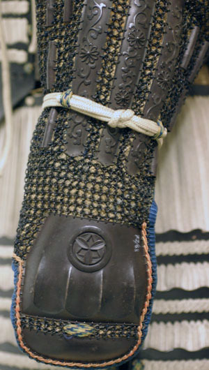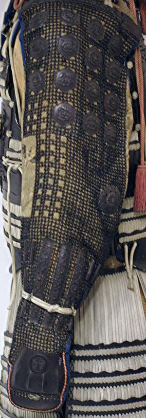 Ärm av mönstervävt gult siden med detaljer i blått och guld. Kantband av blått siden, b 8 mm. Upptill över axeln rundat avslut med i bakkant ett utskjutande parti inåt ryggen. Ärmens insida delad och sammanhållen av vitt snöre med upptill knapp och hyska av snöre. Runt handleden ett genom två band löpande snöre, på insidan fästat med oval knapp av horn. På ärmens utsida fastsytt ett tunnt ringpansar som avslutats upptill över axeln med en svagt välvd med relief dekorerad skena. I skenans ändar en mindre skena, förbunden med ett gångjärn format likt en fjäril. Från övre kanten och 200 mm ner är 15 sexhörninga mon, diam 38 mm, av tre olika typer placerade. Nedanför dessa en rund blomma omgärdad av blad, diam 46 mm. Över handleden tre större , l 134 mm, reliefdekorerade metallskenor, på var sida om dessa fyra mindre skenor, l 32 mm, liknande bambubitar. Handskydd av två metallplattor den större formad efter handens knogar och med mon - Maru ni sasa no maru (bambublad lagda i ring), använd av familjen Fukuoka (Ströhl nr 134 sid. 106). På handskyddets utsida ett orange förgat kantband av siden. Insidan fodrad med blått tyg. Öglor av siden för tummen och ett finger.