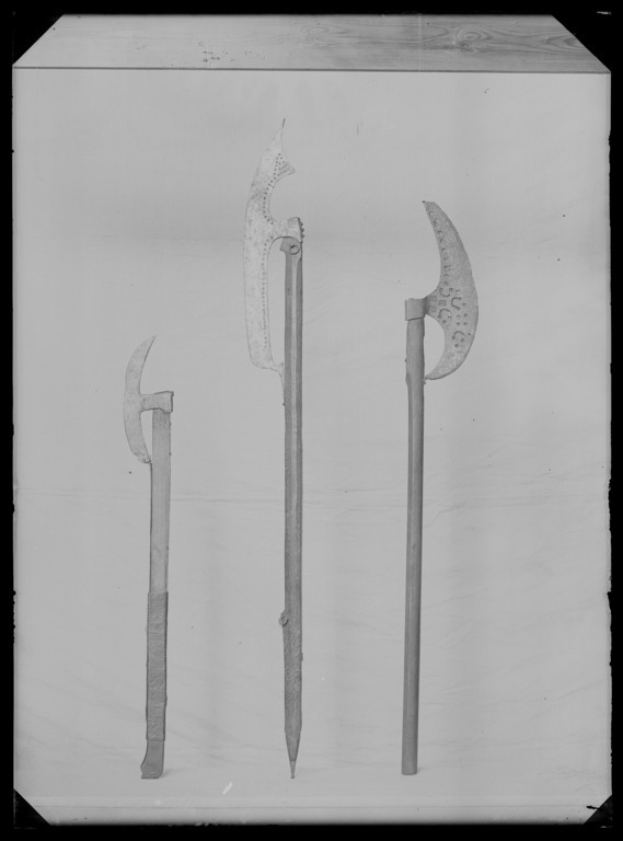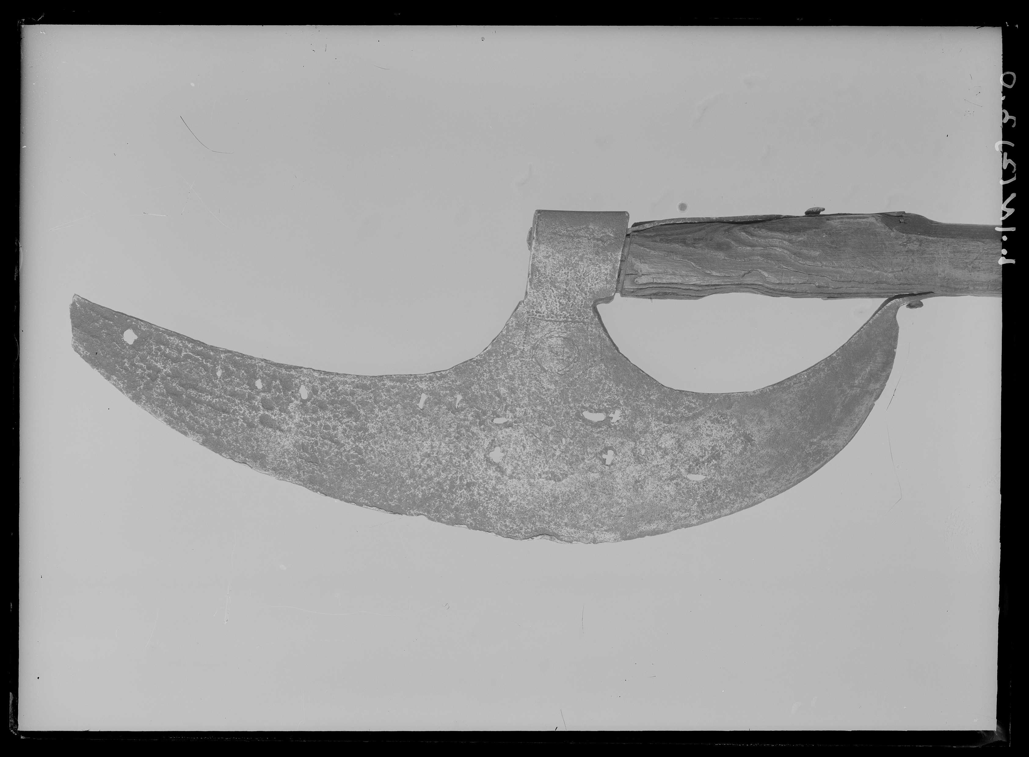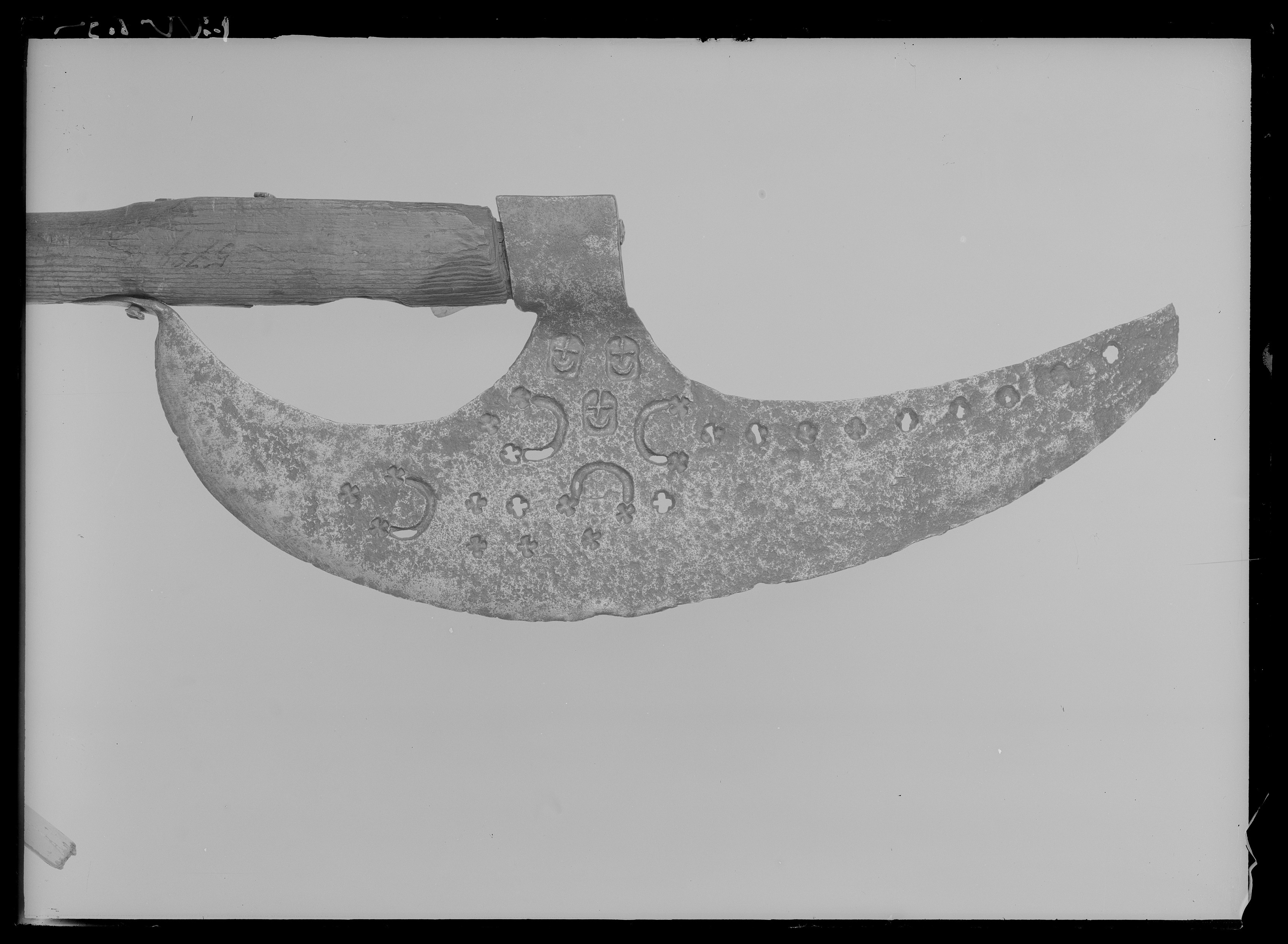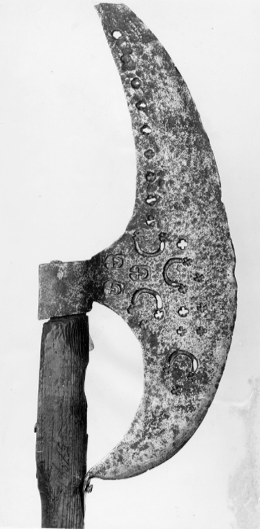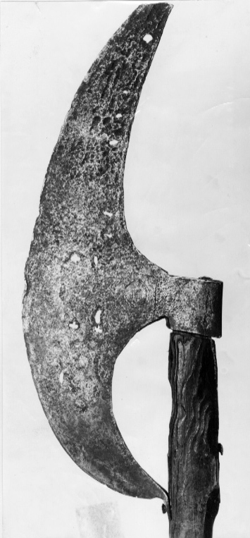 Halvmånformigt blad, starkt rostskadat. Bladets nedre spets böjd och fastspikad vid skaftet. övre spetsen avbruten. På bladets ena sida stämplad dekor, vid skafthylsan tre ggr med rektangulär stämpel med kors och halvmåne. Därutanför fyra ggr halvcirkel med fyrbladig blomma på spetsarna, tre av dem halvcirkelformigt placerade runt de tre första stämplarna, den fjärde placerad på nedre halvan. Den fyrbladiga blomman dessutom stämplad nio ggr utefter övre halvans ryggkant samt åtta ggr på mittpartiet. Flera av stämplarna har gått igenom bladet. På motsatt sida punsad, sköldformig figur, i skölden cirkel runt kvadrat med punkt, över skölden fem "plymer". På sidorna av skölden bokstäver H L (?). Trekantig skafthylsa. Skaft av trä, 1:1085 mm, främre kanten rundad. bakre kanten i tre faser. Skaftet bränt mellan hylsan och bladets nedre fäste, dessutom på framsidan avfasning samt två spikhål, nedre spiken avbruten i hålet. Funnen i den s.k. Grims kula eller håla på Verkö i Blekinge vid mitten av 1700-talet. Fanns i början av 1800-talet i landshövding Gustaf Anton af Brinkmans samling (landshövding i Blekinge 1813) och förvärvades därifrån 1817 av löjtnant Carl Daniel Pettersson, samlingen inlöst 1848 av Vitterhetsakademien. Deponerad i Livrustkammaren 1887.