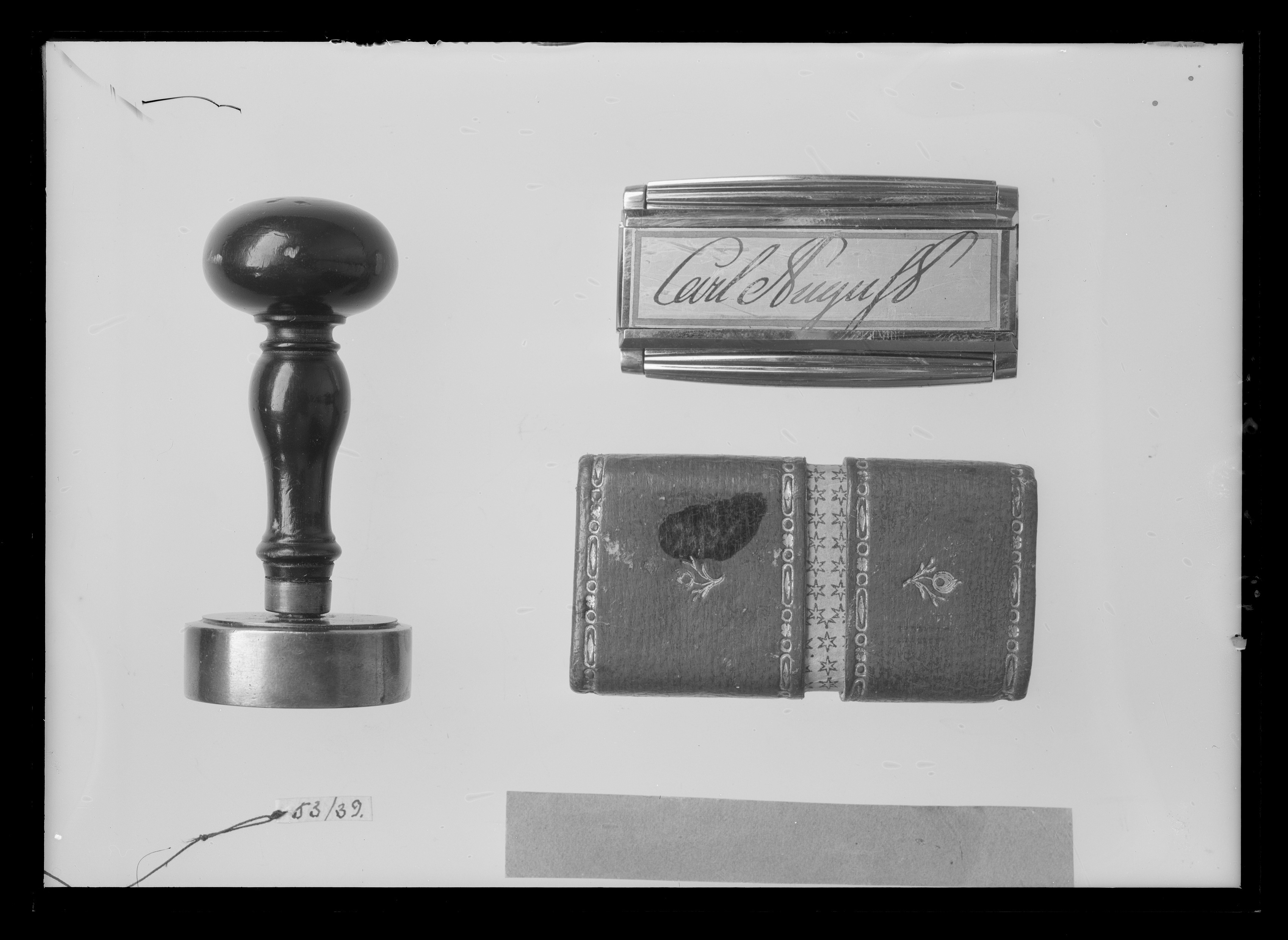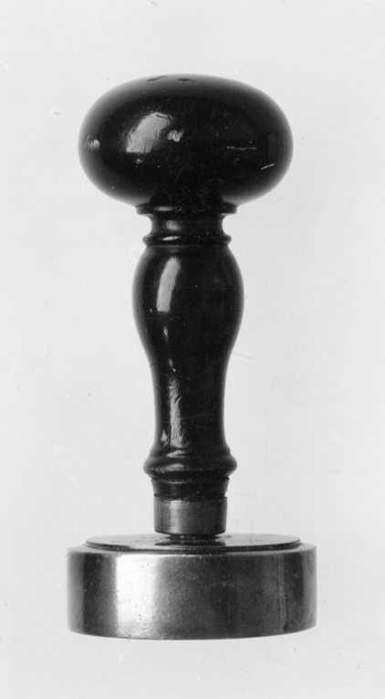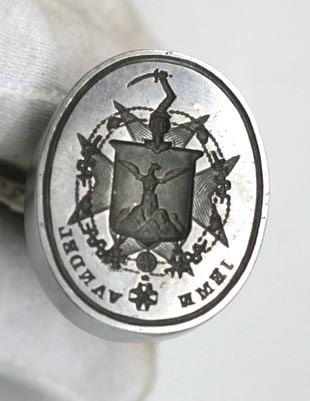 Oval, cylindrisk platta, h: 14 mm. Graverat vapen, skrafferade färgangivelser. Sköld lagd på malteserkors, i skölden örn med lyftade vingar, sittande på bergstopp, uppskjutande ur vatten. Hjälm med hjälmprydnad pansarklädd arm med sabel. Skölden omgiven av Svärdsordens kedja med kors (KmstkSO 1831), tre nedhängande tecken med band, i mitten Guldmedalj för tapperhet i fält (1814), dexter Svärdsorden, sinister ryska S:ta Annas orden 2 kl (1815). Nedanför vapenskölden valspråk, spegelvänd text: "IEMN VANDEL". Svarvat, balusterformigt, svartmålat träskaft med rund, uppifrån tillplattad knopp.