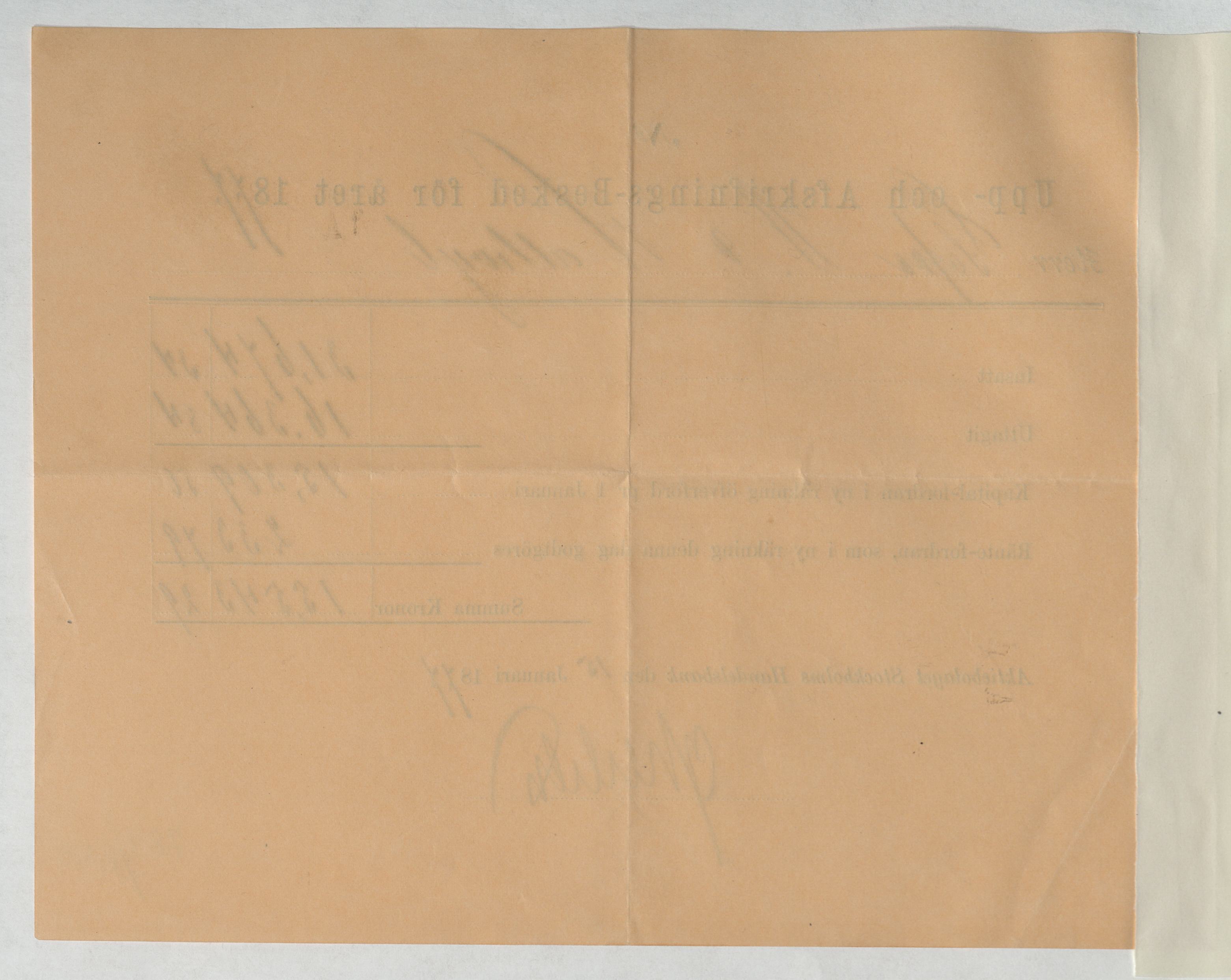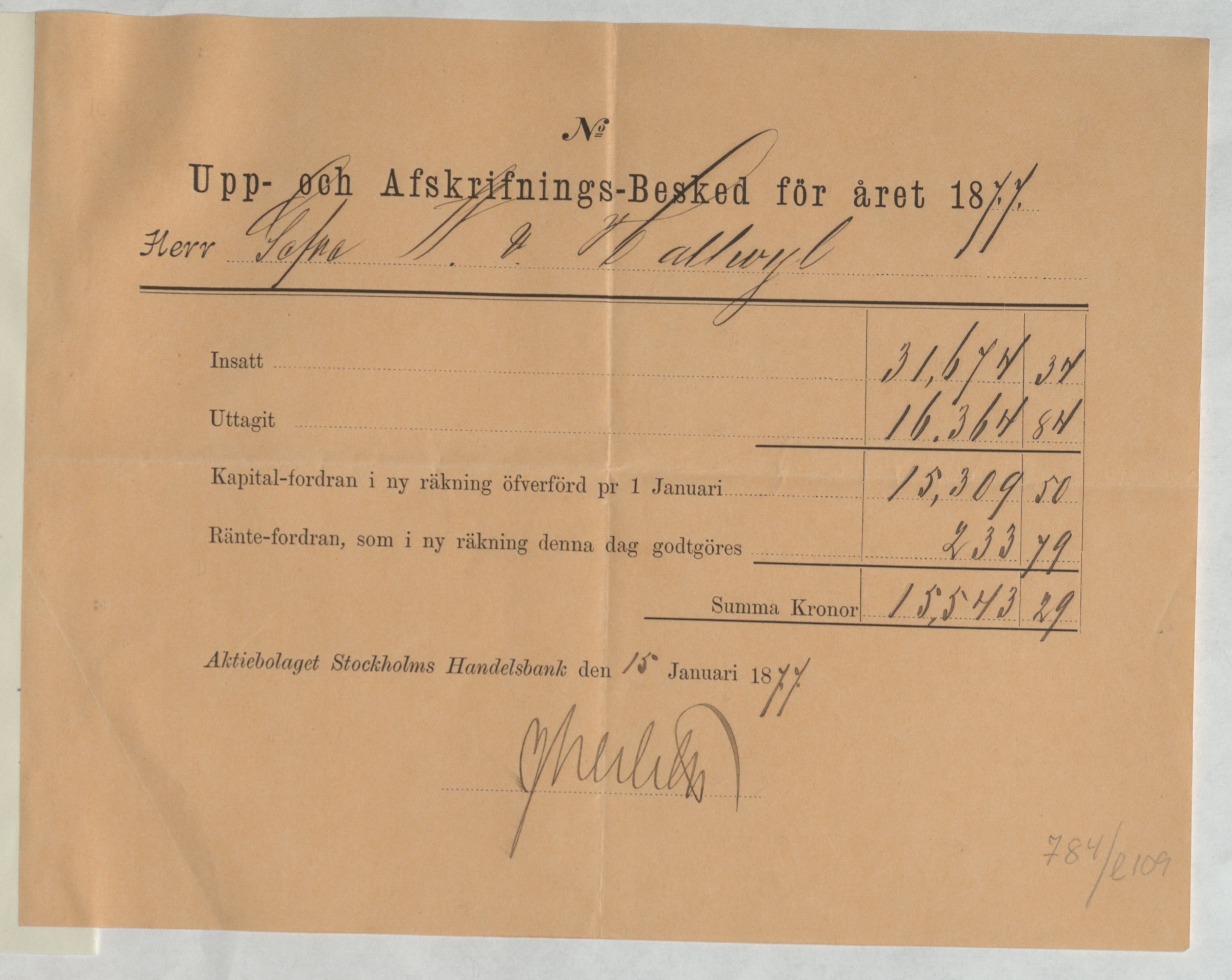 Kvitto från Aktiebolaget Stockholms Handelsbank rörande Upp- och Afskrifnings-Besked för året 1877