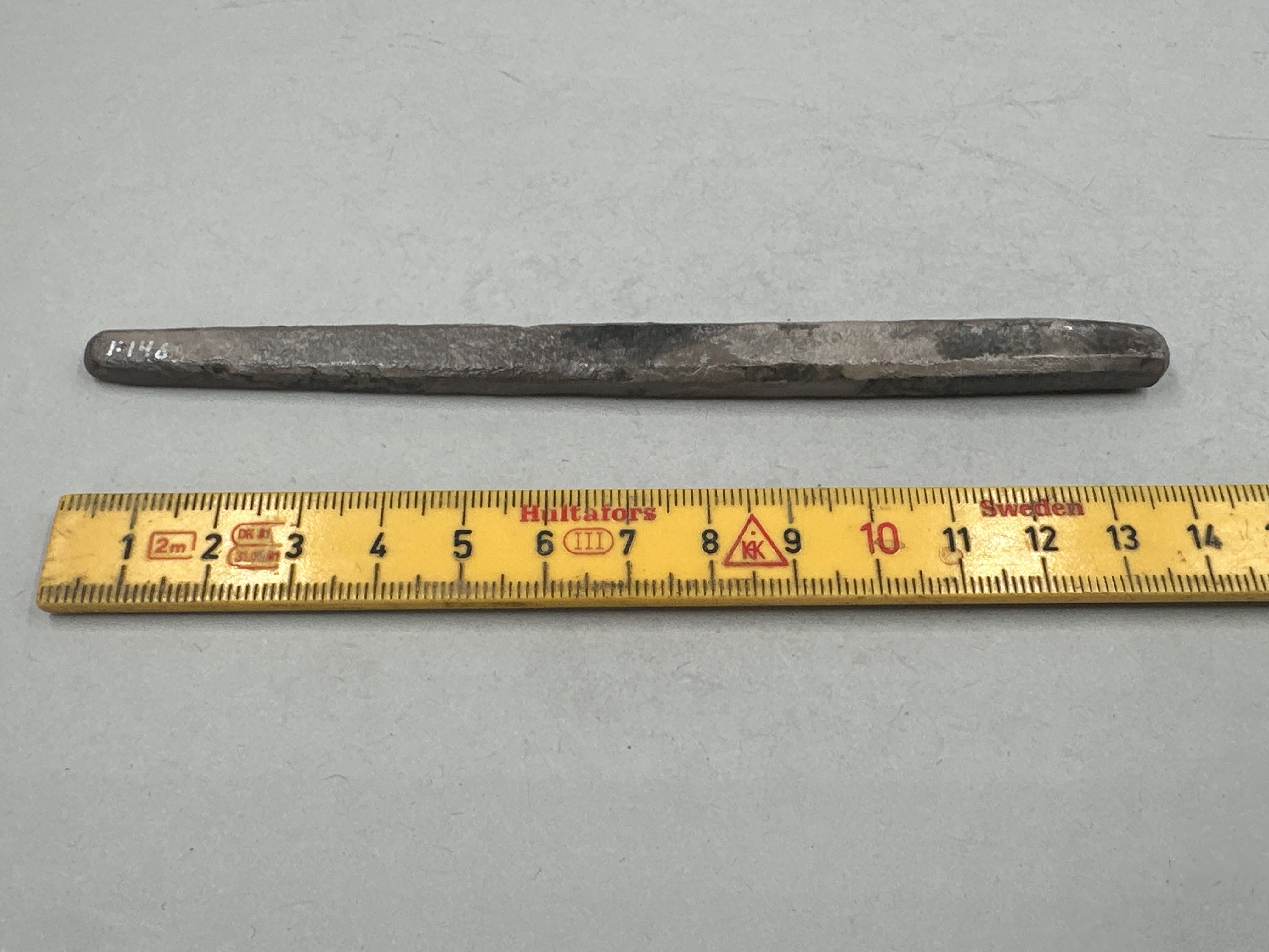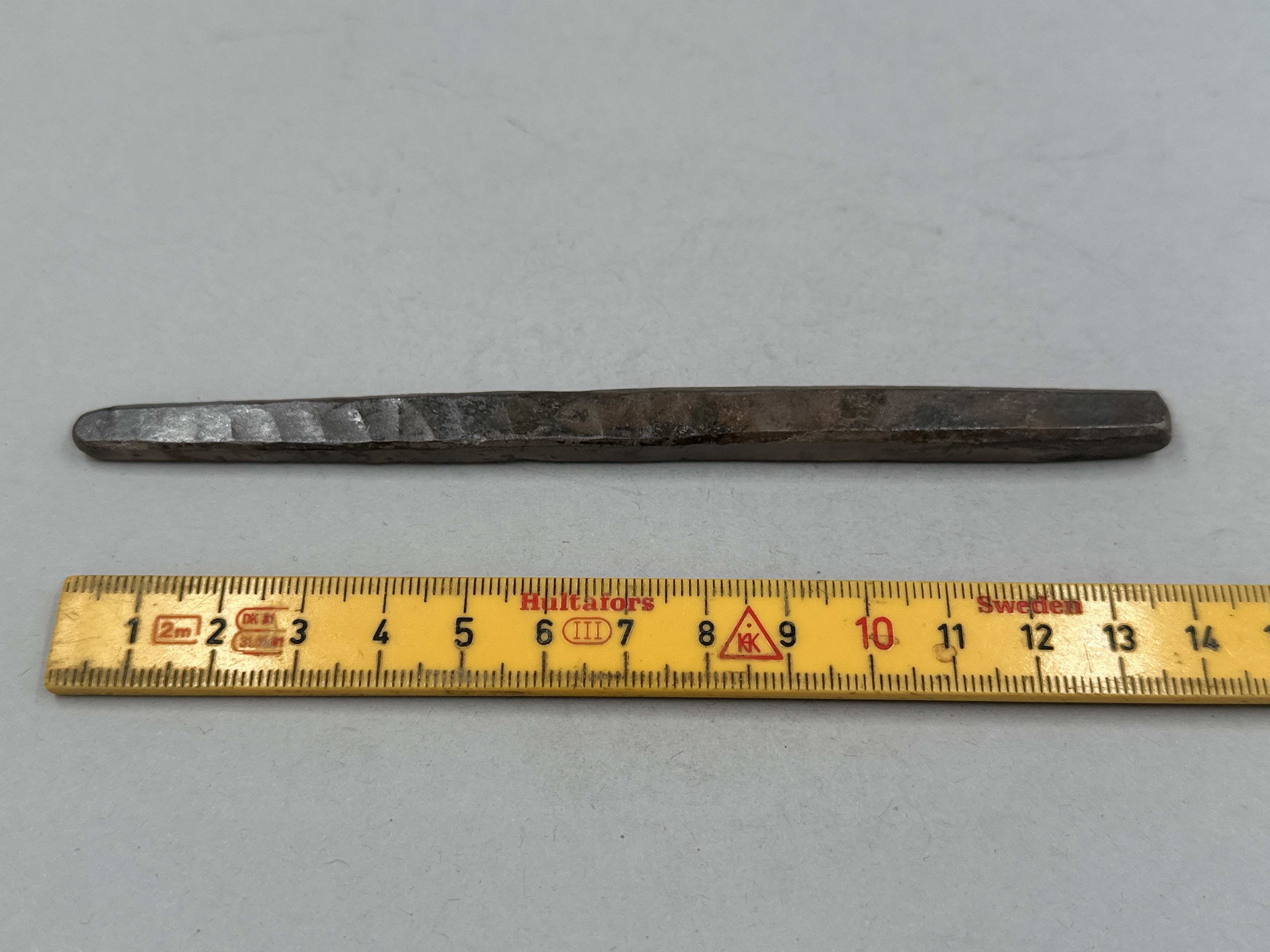 Rektangulär ten med avfasade kanter. Något tjockare i ena änden.