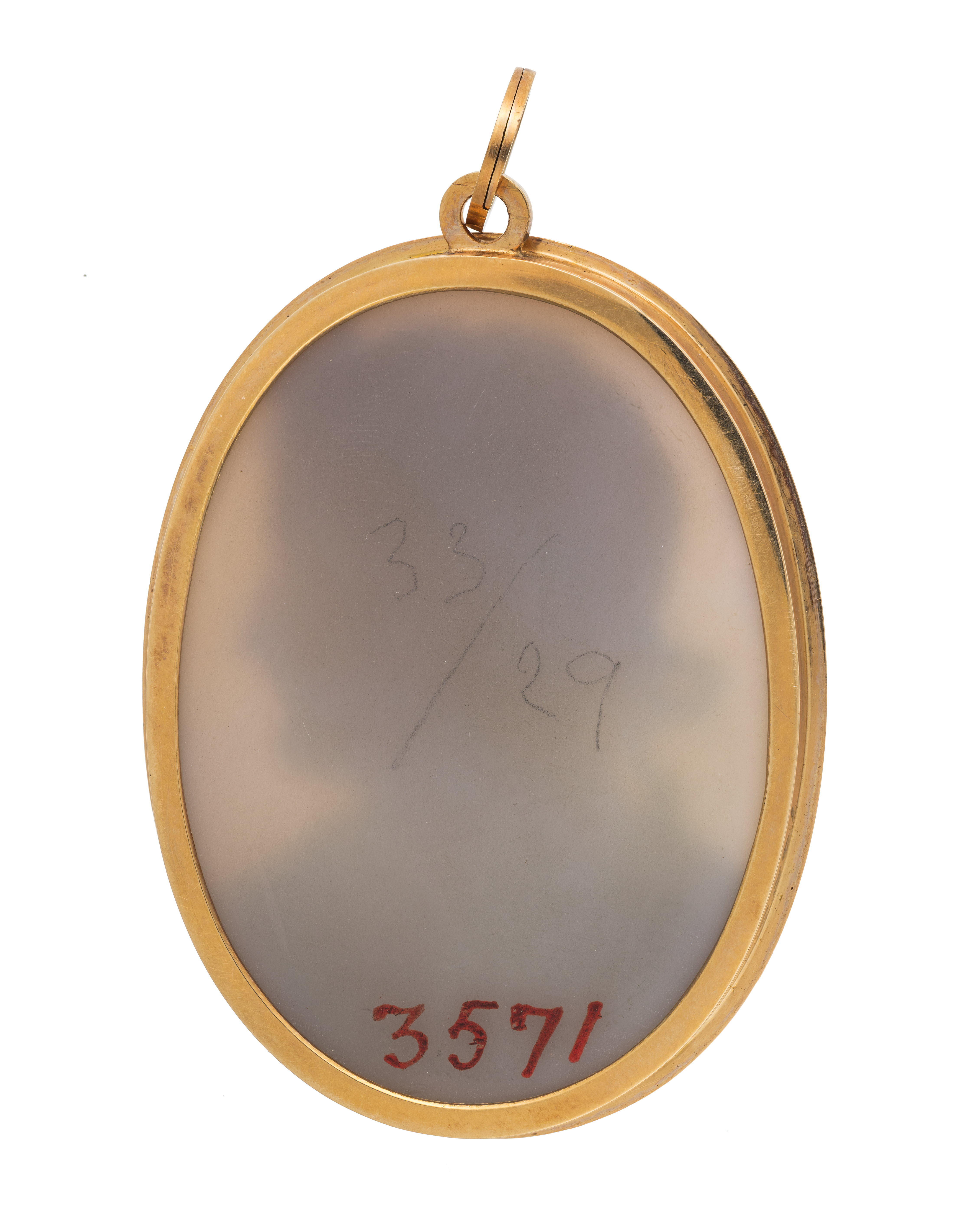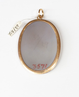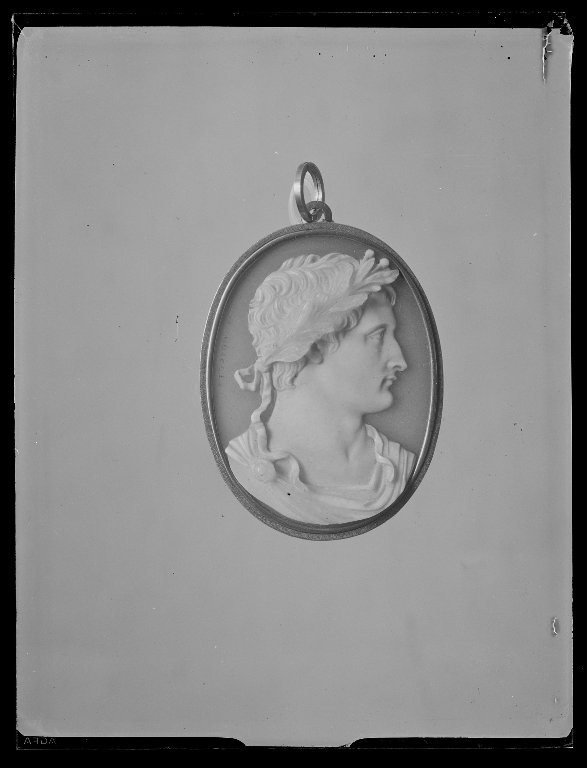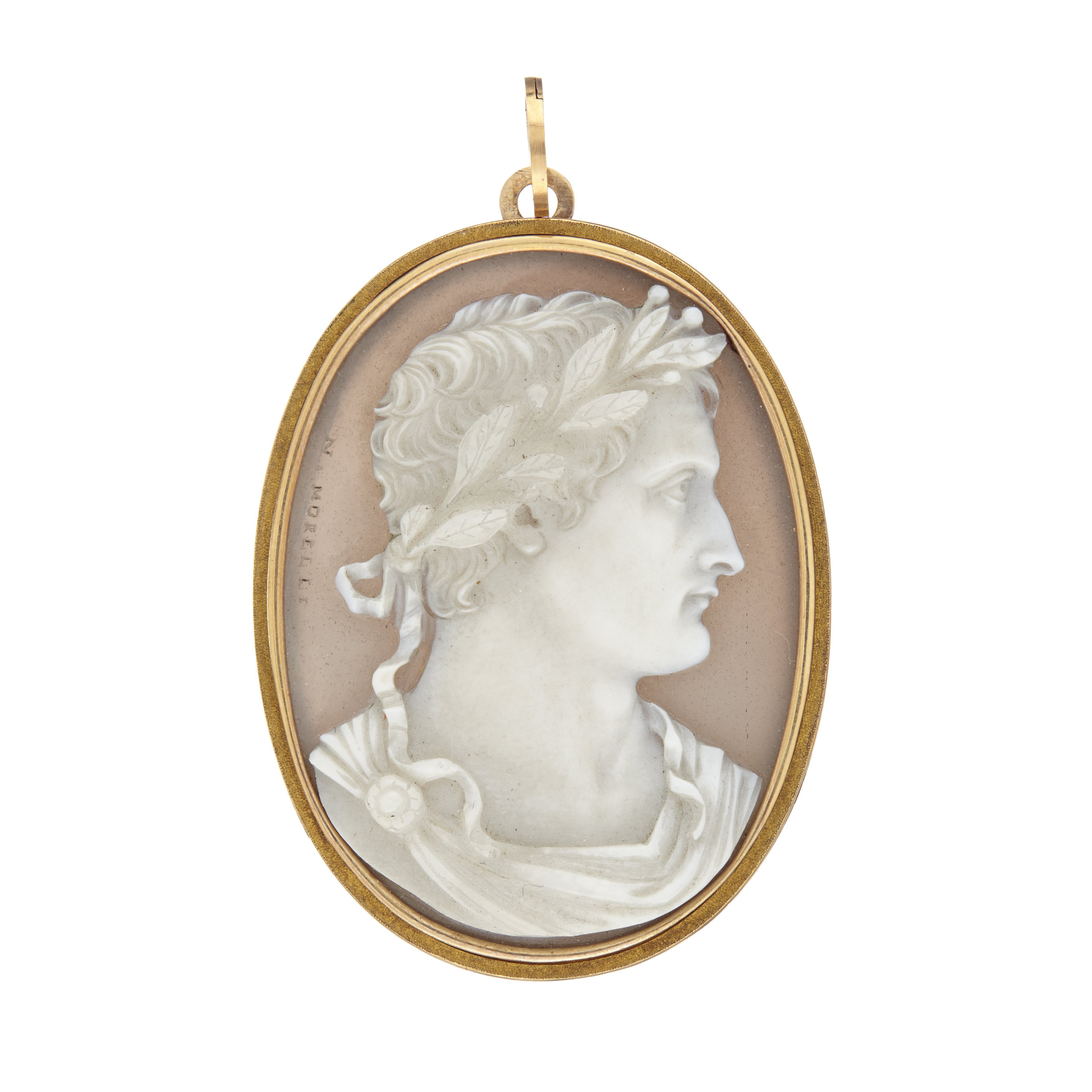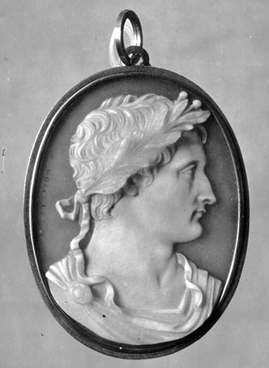 Relief skuren i gråviolett agat, vit relief, halsbild, profil h, romersk dräkt, lagerkrans. Graverad signatur vid v.kant: "N.Morelli" (Nicola Morelli, Rom 1799-1838). Guldinfattning à jour, slät kant runt stenen och därutanför punsad krage, upptill en kantig ring och däri fäst en spiralformig, kantig, rund ring.