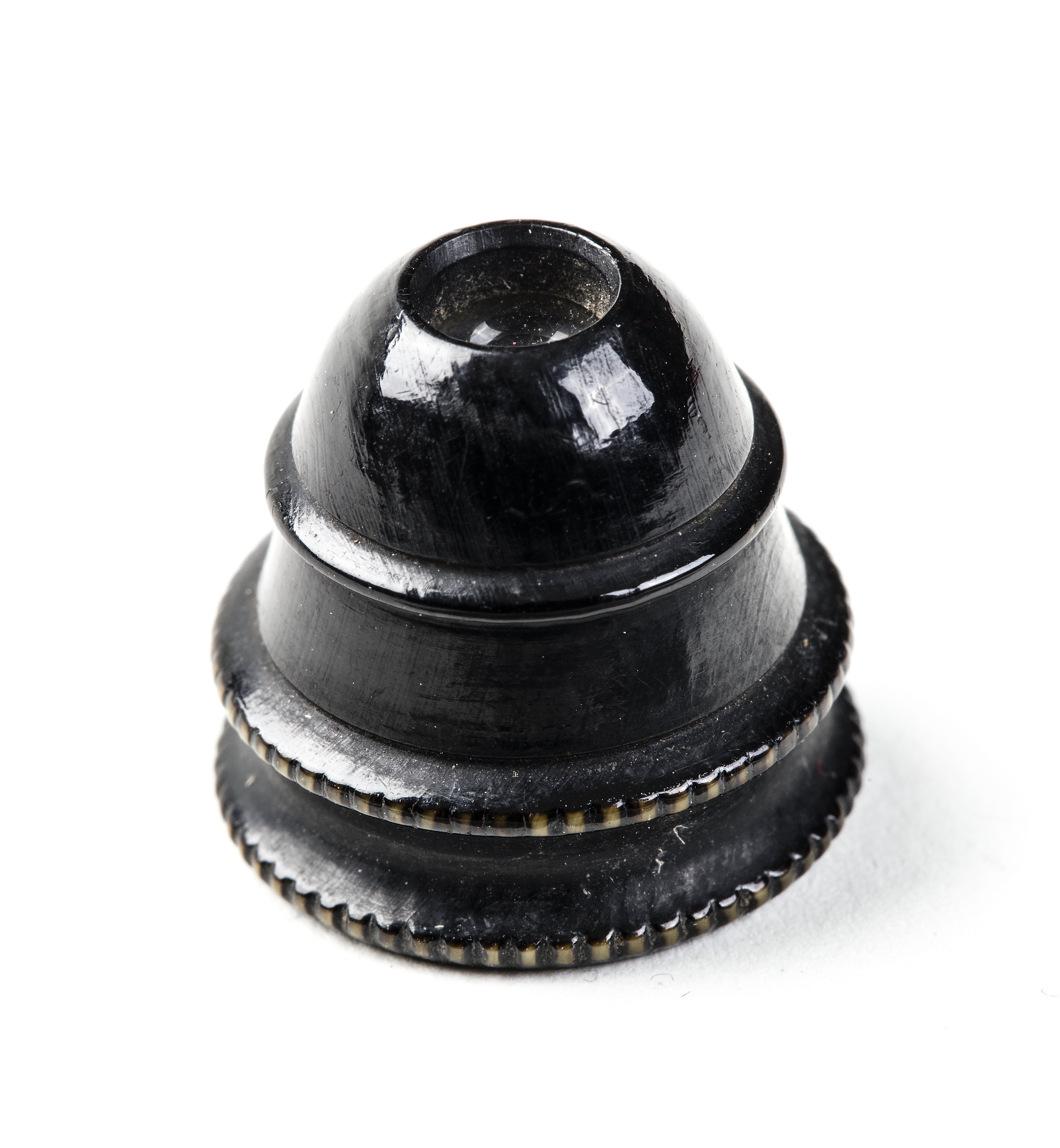 Hus tillskuret i svartmålat horn el. ben? Konisk form med nertill två räfflade ringar och upptill rundat lock med centrerat titthål. Hus och lock gängade. I den breda änden skuret två streck och två punkter. Under locket en konvex lins.