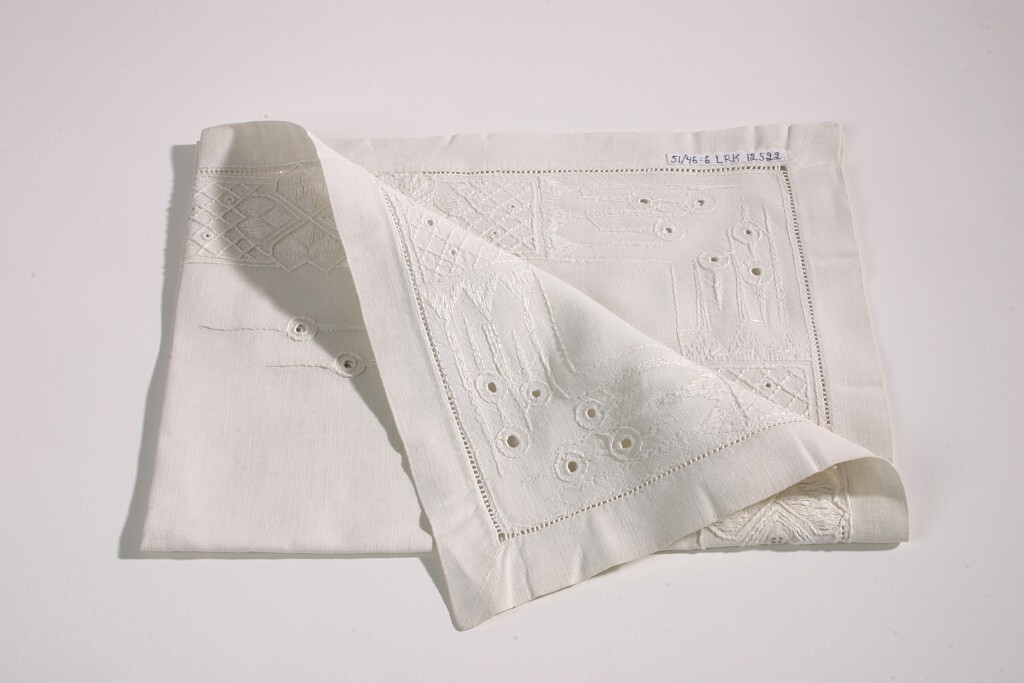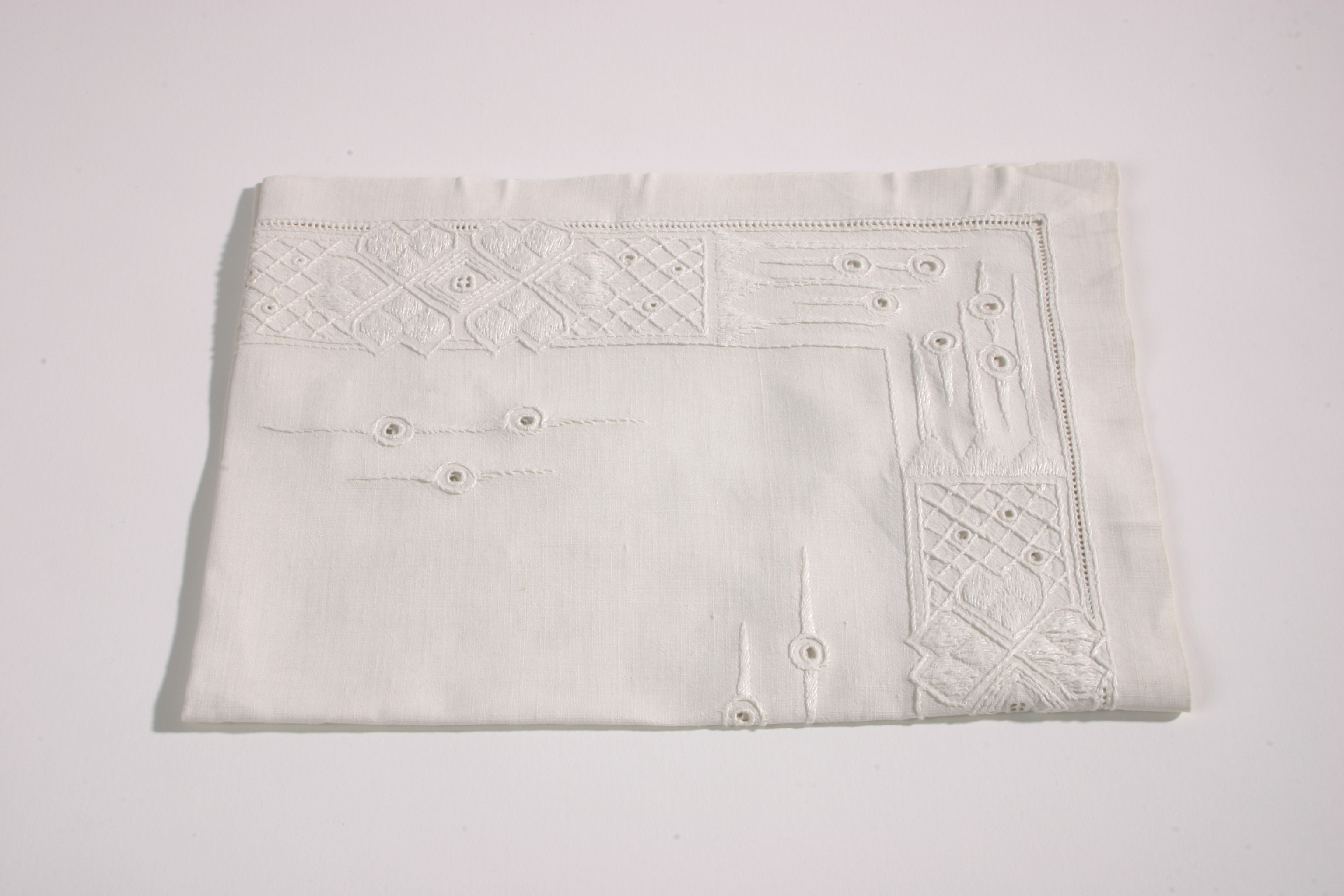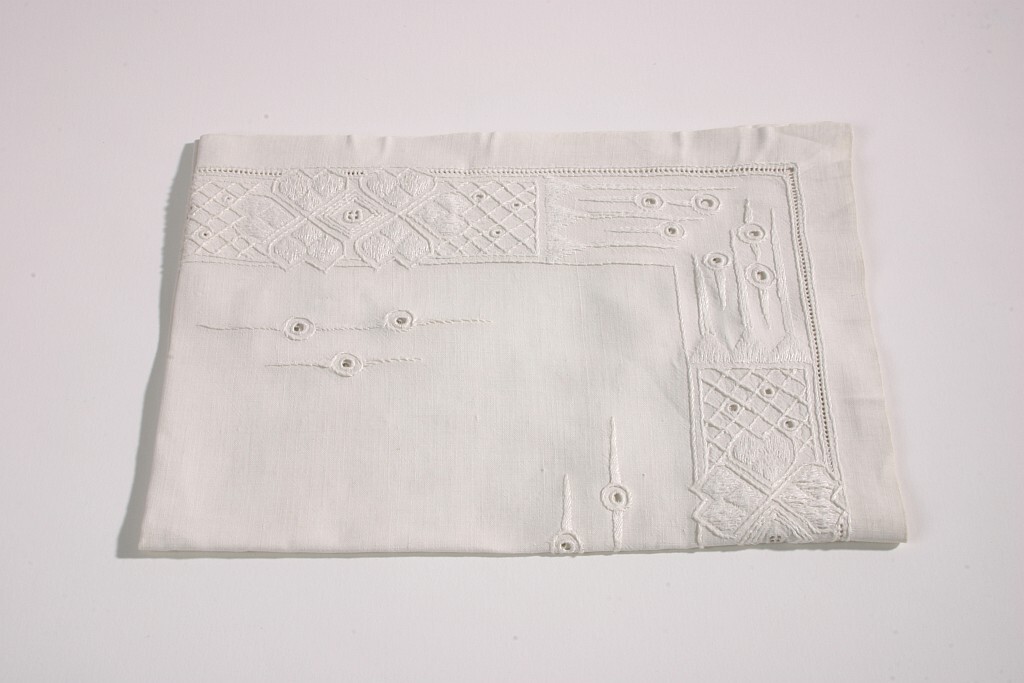 Vit, fyrkantig linneduk med vitbroderi, hålsöm, kedjesöm och plattsöm, med bård utefter kanterna.