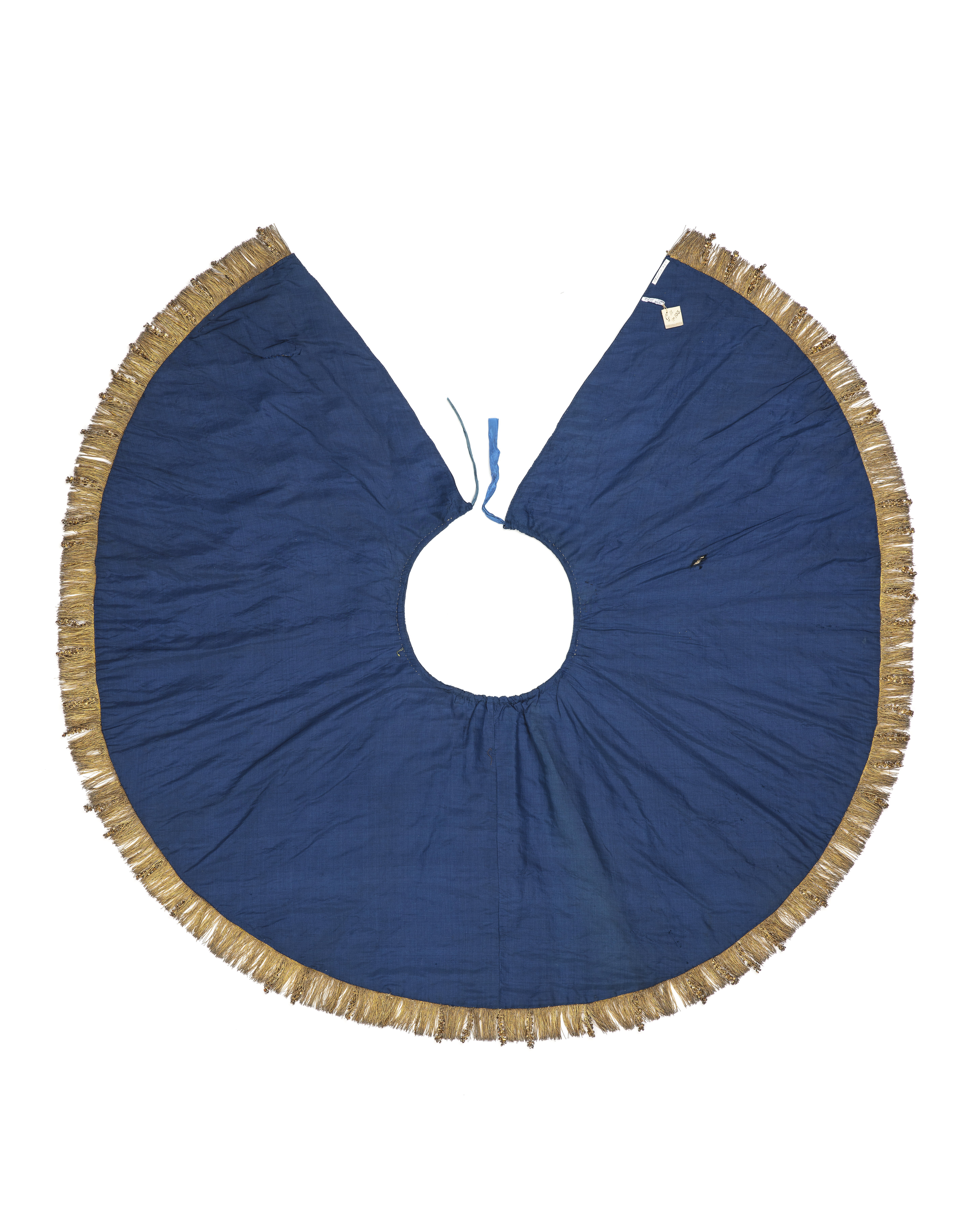 Skört i blå sidensatin med applicerade guldkronor och guldfrans. Skörtet är klippt i två stycken med söm mitt bak, tyget består av ovanligt breda våder, minst 70 cm. Skörtet är nästan helcirkelformat, midjan är cirkelrund och framkanterna pekar snett utåt så att det bildas en öppen kil, cirka 70 cm bred, bildas i ytterkanten nedtill. Längs hela ytterkanten finns en tät guldfrans. Med ca 5 cm mellanrum sitter crepiner som gjorts av några fransar som tvinnats ihop och i dessa har crepinblommor fästs. Mellan varje crepin finns två buljoner som också gjorts av fransarna som tvinnats ihop till tjockare spiralformer. Ovanför fransen, på tyget sitter en knypplad spets i guldtråd. Spetsen är gjord av guldlan och olika sorters tråd, partierna med guldlan bildar solfjädersknippen som växelvis vänder sig nedåt respektive uppåt. Däremellan upprepas ett vågformat mönster. Fransen sitter fastsydd något överlappande ovanpå spetsen. Tillsammans bildar frans och spets ett brett parti glänsande i guld. Kronorna är sydda på en botten, ibland i gult ibland i blått tyg. På skörtet är 66 guldbroderade kronor fastsatta och 20 st saknas, där de suttit fast syns en mörkare markering på tyget. Med även dessa nu saknade kronor på plats skulle kronorna sitta jämt fördelade över skörtet. Flertalet av de saknade kronorna har suttit på skörtets vänstra sida, värjsidan. Foder av blå tät varprips i siden. Vådbredd minst 70 cm. Foder i två stycken med söm rak mitt bak. Fodret fastsytt kant i kant med yttertyget. Två hål finns: ett på vänster framsida mitt på skörtet, rakt igenom, möjligen för värjan. Det andra hålet finns på vänster fram något nedanför mitten, ej igenom yttertyget. Skörtet är förstärkt med ett mellanlägg. Spår av stygn för utställning eller äldre ?? är synliga. Guldfrans: längd 380 cm och bredd 7 cm, 53 hela buljoner bevarade samt några med endast en blomma. Guldspets: längd 495 cm och bredd 6-7 cm. Äldsta inventarieuppgift är från 1790, s. 49, där skörtet har nr 118 och beskrivs enligt följande: "En vapenkjortel af mörkblått atlasch med brodderade guldkronor med ägta pärlor -samt en bred guldspets och frans med crepiner nedomkring"