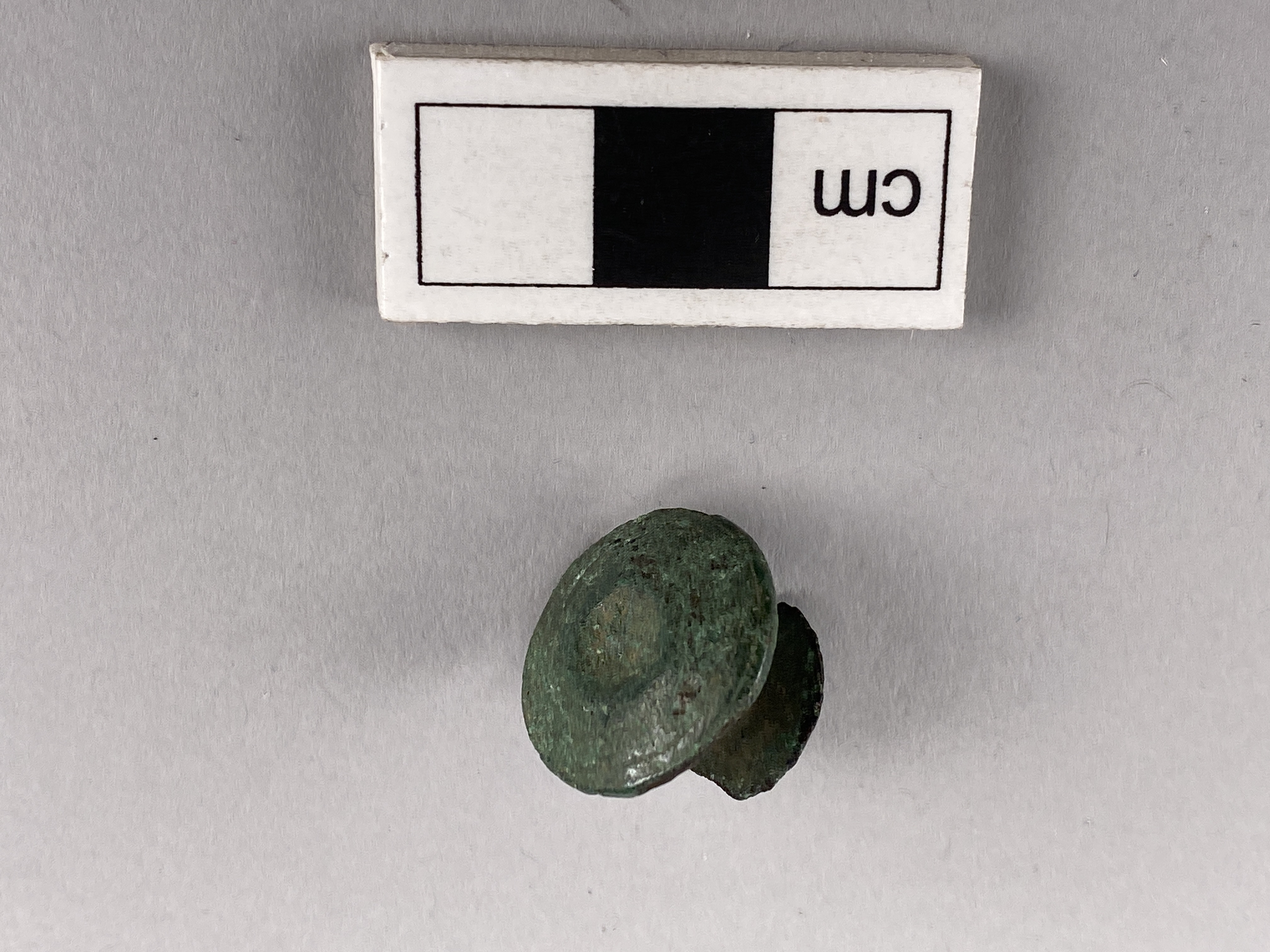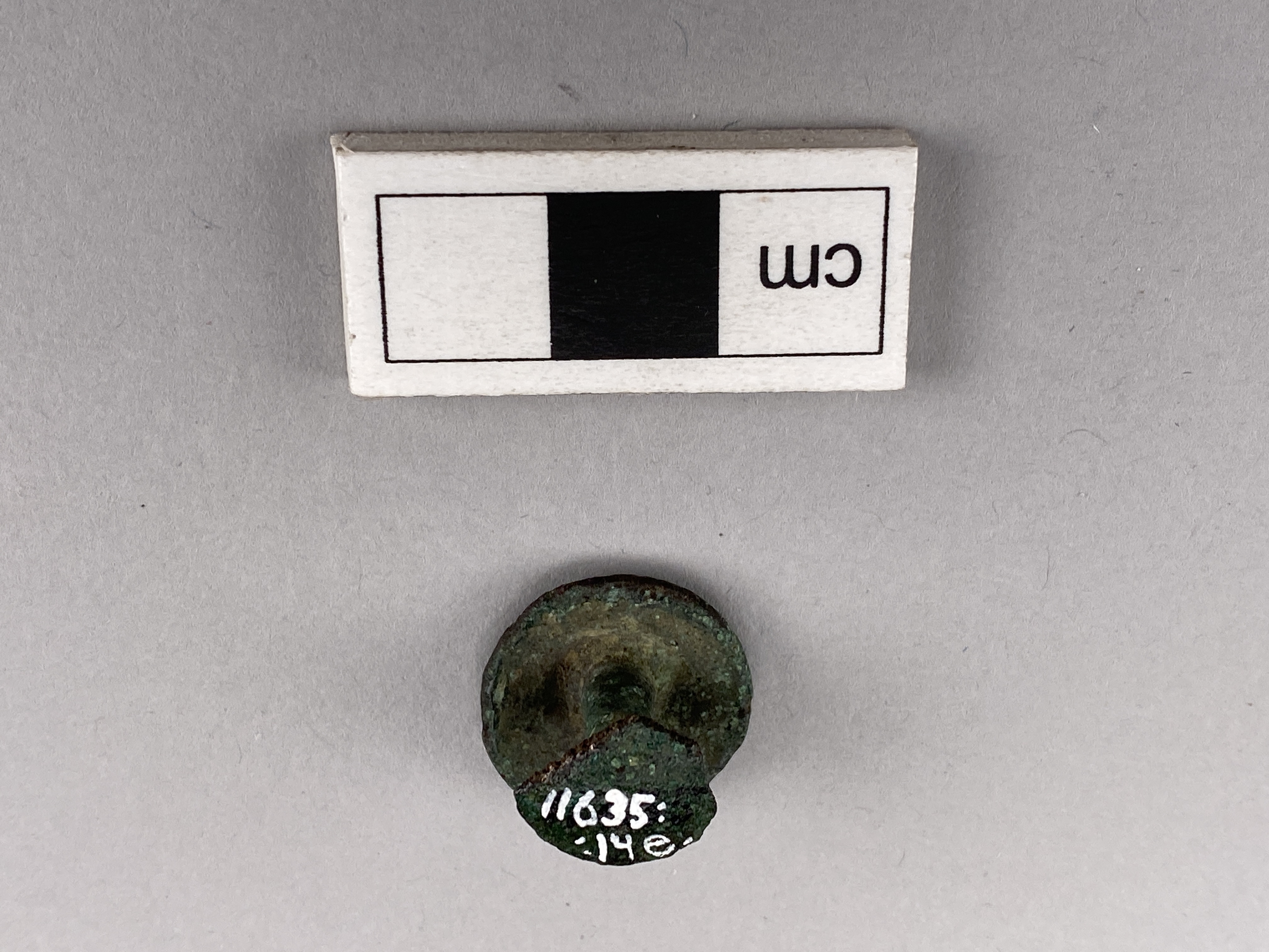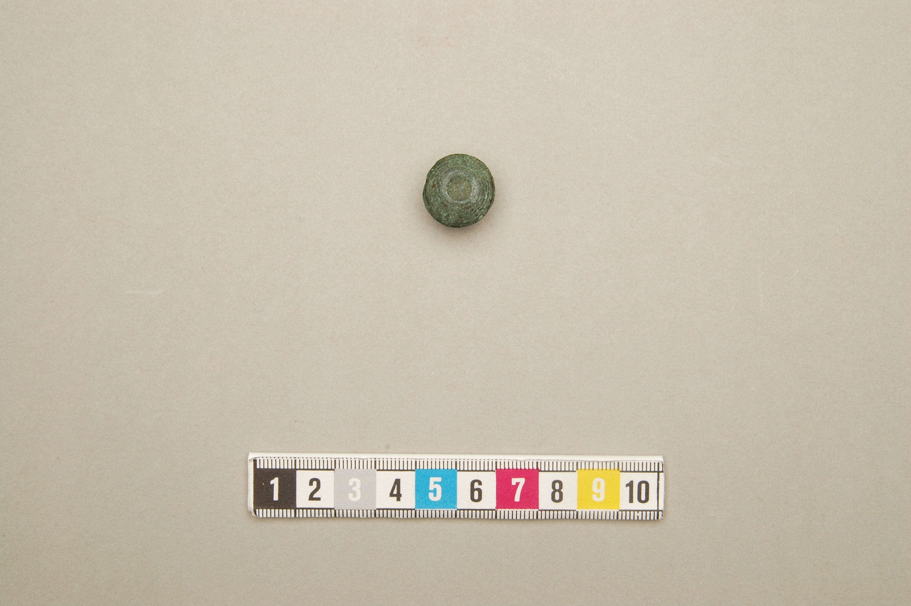 Dubbelknapp av brons med något välvt huvud och fem försänkta koncentriska cirklar kring en konkav mittfördjupning.