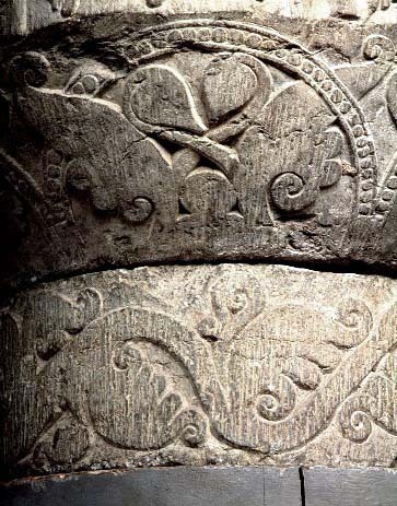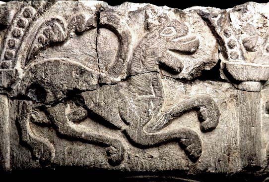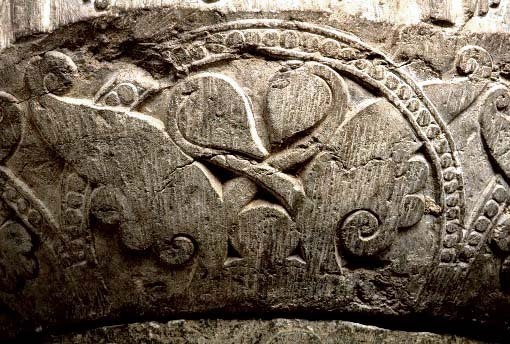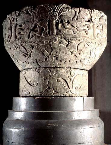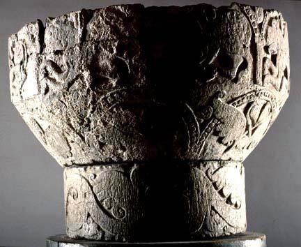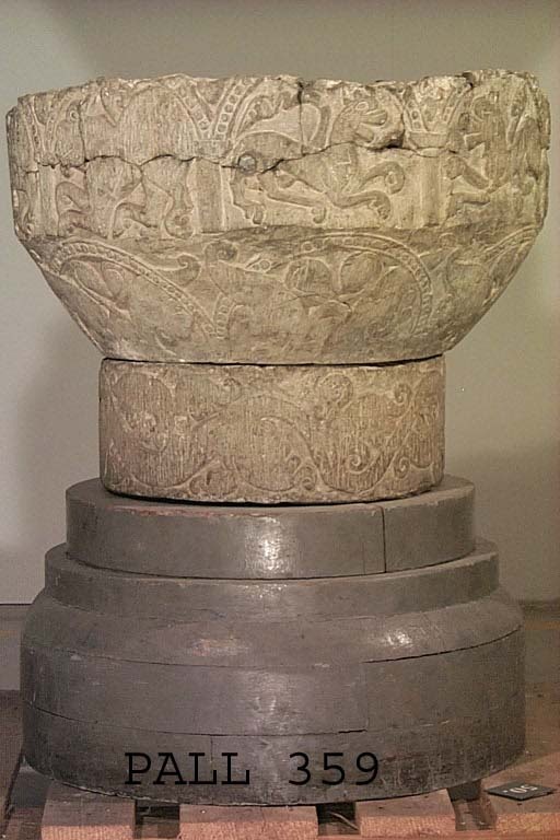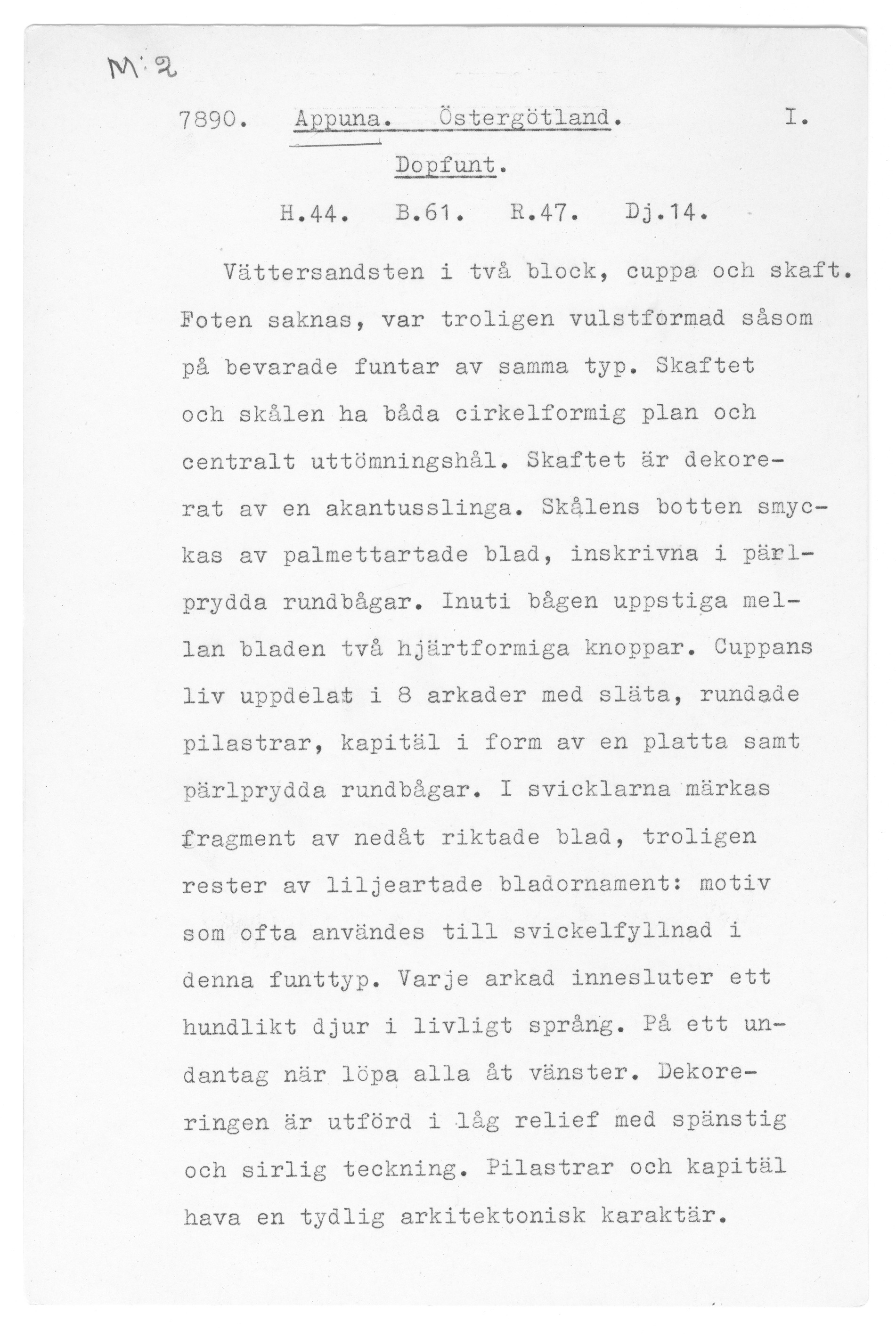 Kondition: cuppans övre del bortfläkt och förlorad; foten saknas helt men ett kort skaft är bevarat. Färg: delar av cuppan har varit täckta med kalkbruk.