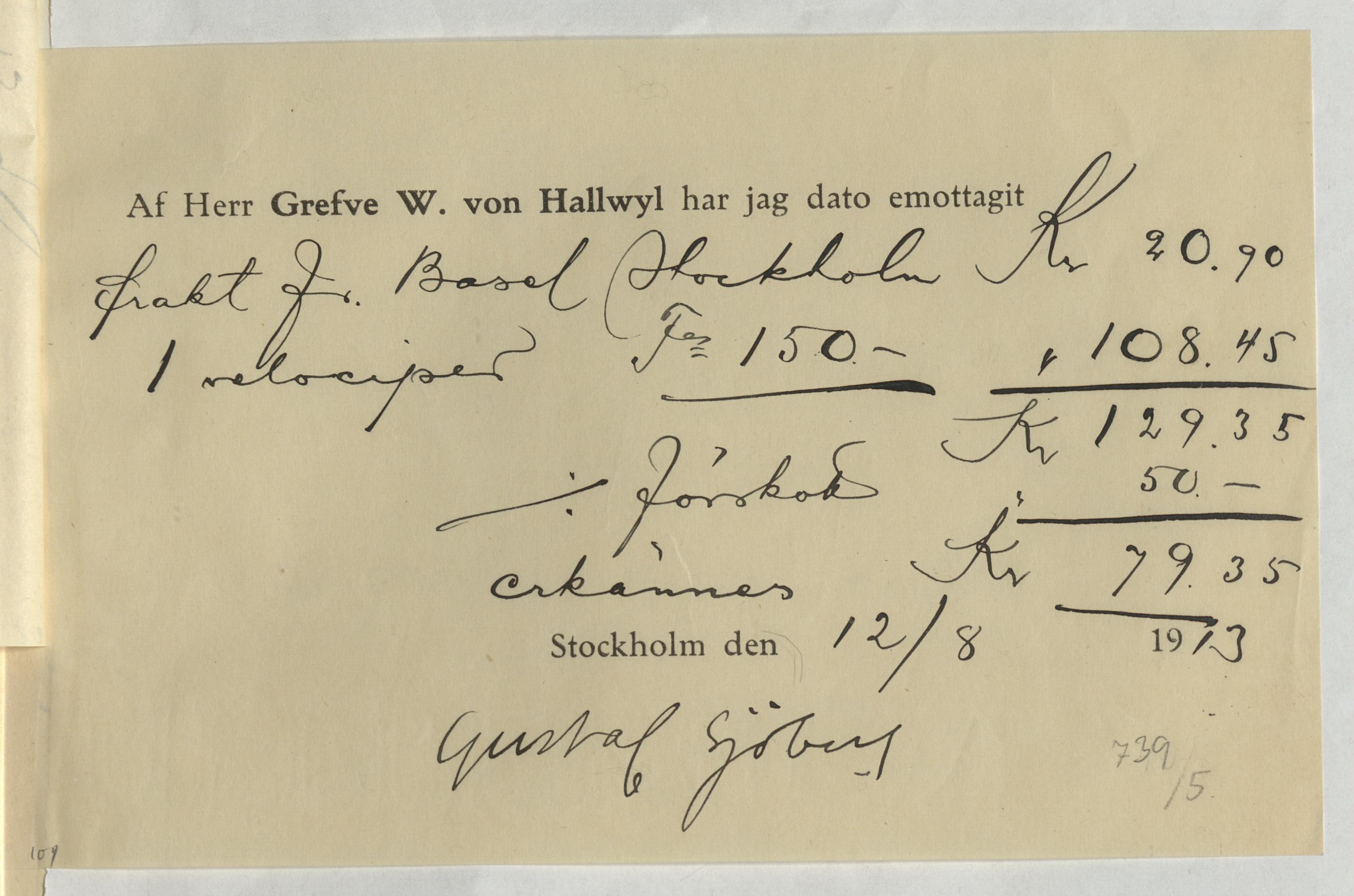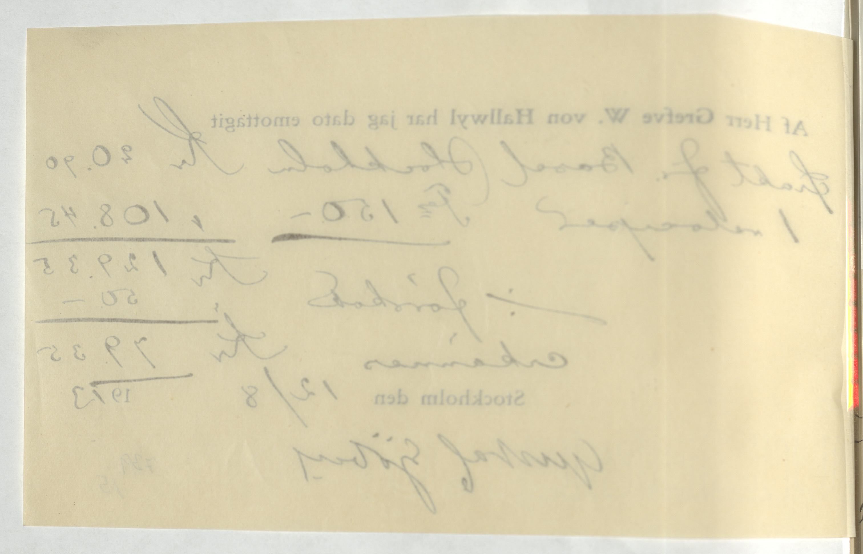 Kvitto från Gustaf Sjöberg. Stockholm, 1913.