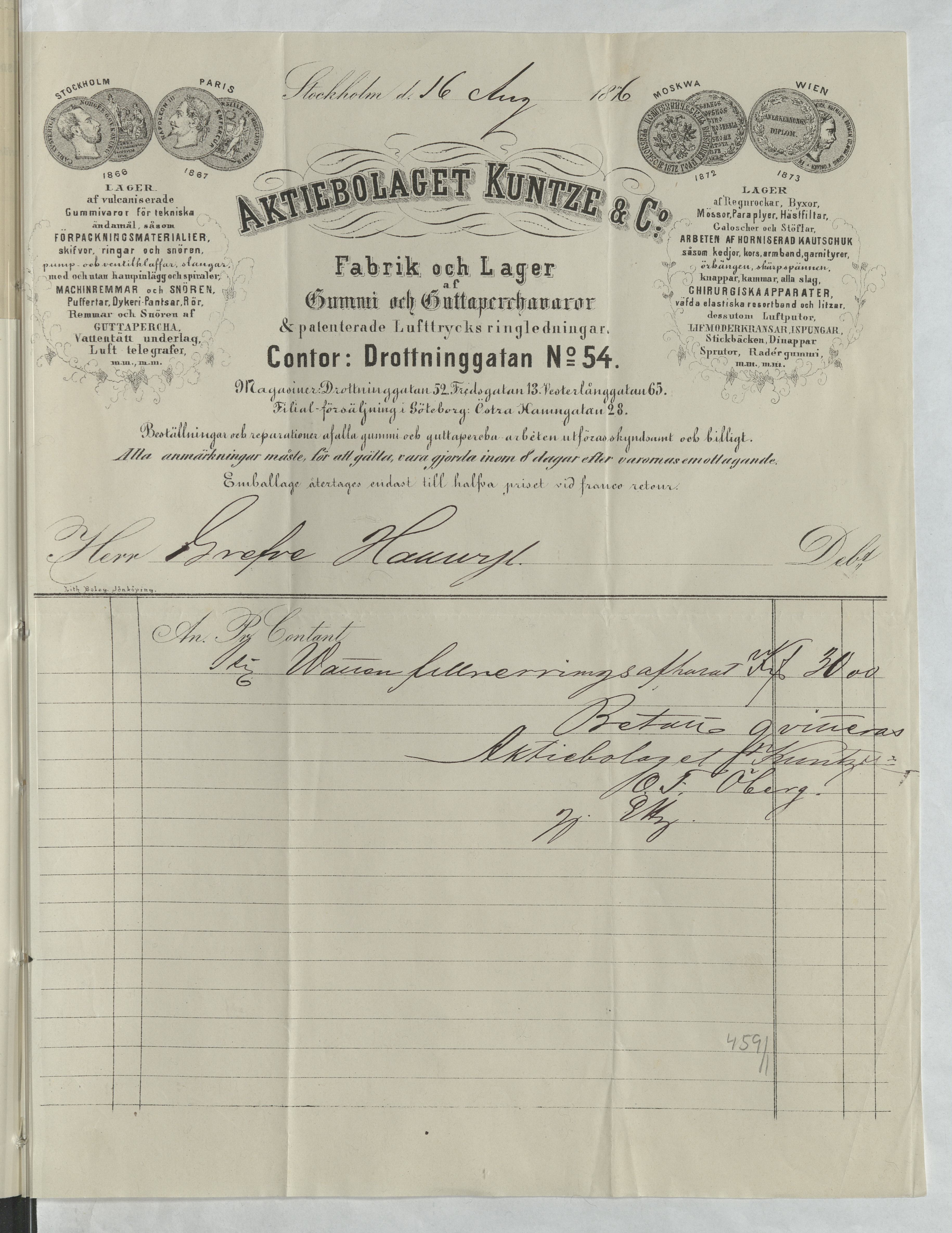Kvitto från Aktiebolaget Kuntze & C:o, Fabrik och Lager af Gummi och Guttaperkavaror. Stockholm, 1876.