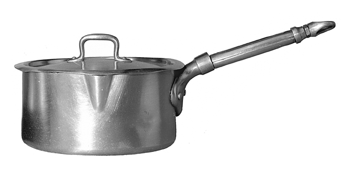 KASTRULL med lock. Av aluminium. Cylindrisk, med rundad bottenkant och plan botten, liten snås och snett utstående skaft. Snåsen till vänster om skaftet, kort och avspetsad nedåt. Skaft av mässing, ovalstavigt och svagt spolformigt, på översidan och undersidan en längdgående insänkning; skaftet med en genom detta gående tånge, på vars ytterände en avlång ögla av aluminium, rörlig kring en i tången ingängad skruv av mässing med en sexsidig mutter innanför öglan; på inre änden en rund hylsa av aluminium, från vilken utgående en rombisk tjock platta, fäst med tre nitar. Höjd: 7,4 cm.; diameter: 14,3 cm. Skaft, längd: 15 cm. Lock: Lågt, svagt kupigt, kring kanten en rakt uppstående fals med rakt utstående kantfläns; på mitten ett avlångt flackstavigt handtag med nedböjda ändar och rakt utstående, något utvidgade ytterändar, fästa vardera med en nit. Höjd:1 cm.; diameter: 15,6 cm. Fransk tillverkning, Tournus i departementet Saône-et-Loire.