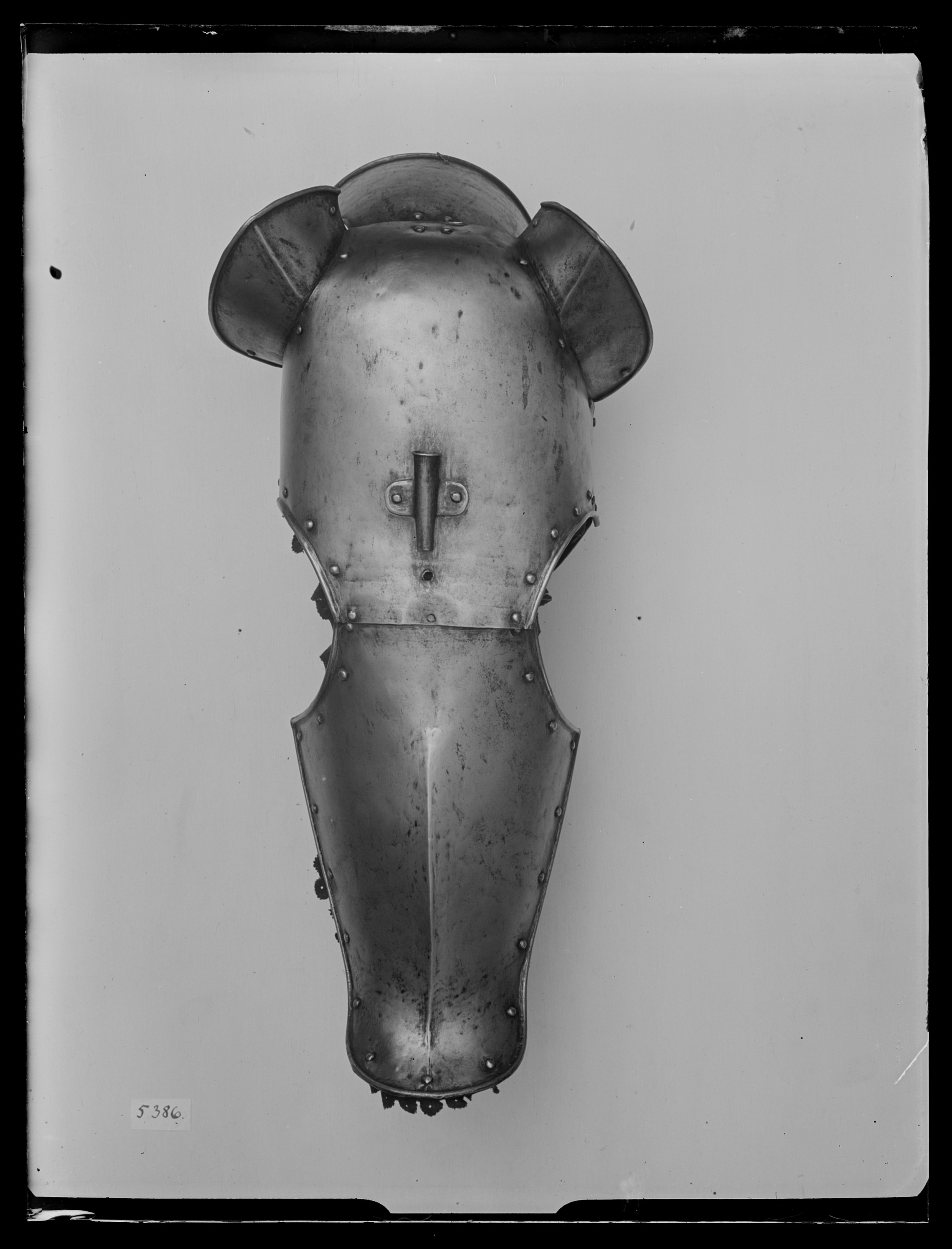 Häststjärna av smitt stål, ursprungligen troligen svärtad, sammansatt av sju delar. Av samma utförande som häststjärna 23365 och 23367, men med pann- och nosdel gjord i två delar. Nackplåten är nitad i ett gångjärn, övriga delar nitade vid varandra. På nosplåten en driven ås. Denna är något skarpare än på de övriga två. Ovanför detta ett hål för en spets samt en plymhållare. Urtagningar för ögon och för öronplåtar med svagt markerad ås och på insidan fastnitad läderrem. Från nackplåten går en 20 mm bred läderrem (käkrem) till öglor på kindplåtarna och tillbaka nackplåten där den fästs i en rem med ett spänne. Nosgrimma finns också. Samtliga ytterkanter, undantaget sidan på nackplåten, inåt omvikta och rundsmidda. Innanför den omvikta kanten en rad med nitar, vilka på insidan fäster ett kypertvävt rött vågformigt band av kläde. Bandet löper som en dekor längs med huvudplåtens ytterkant. Häststjärnan har invändigt foder av sämskskinn. Detta gäller även nackplåten där det har limmats direkt på plåten (hänger numera delvis löst).