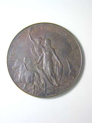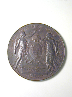 Dekor och text i relief, på ena sidan ovalt vapen för den ungerska riksdelen av Österrike-Ungern, hjärtsköld Ungern, i huvudskölden Dalmatien, Kroatien, Slavonien, Siebenbürgen samt obekant vapen, skölden omgiven av rullverkskartusch, krönt av Stephanskronan, stående på rektangulär kartusch med text: "SVED KIR.UDV.MUZEUMNAK STOCKHOLM" (till Kunglig Livrustkammaren, Stockholm eg. till Kungl.hovmuseet). Vapnet flankerat av två kvinnofigurer, den ena med trumpet och palmblad (Fama), den andra med ymnighetshorn, omgivande text: "MILLENNIUMI NAGY EREM KIVALO ERDEMEKERT" (Tusenårsminnets stora förtjänstmedalj?). På den andra sidan Hungaria med svärd och sköld, krönt av Stephanskronan, stående i stridsvagn, dragen av tre hästar, bakom vagnen svävar ängel med fackla, till höger om Hungaria signatur(?): "BECK Ö FYLÖP", omgivande text: "1896-iki EZREDEVES ORSZAGOS KIALLITAS" (1896 års nationella tusenårsutställning(?) ).