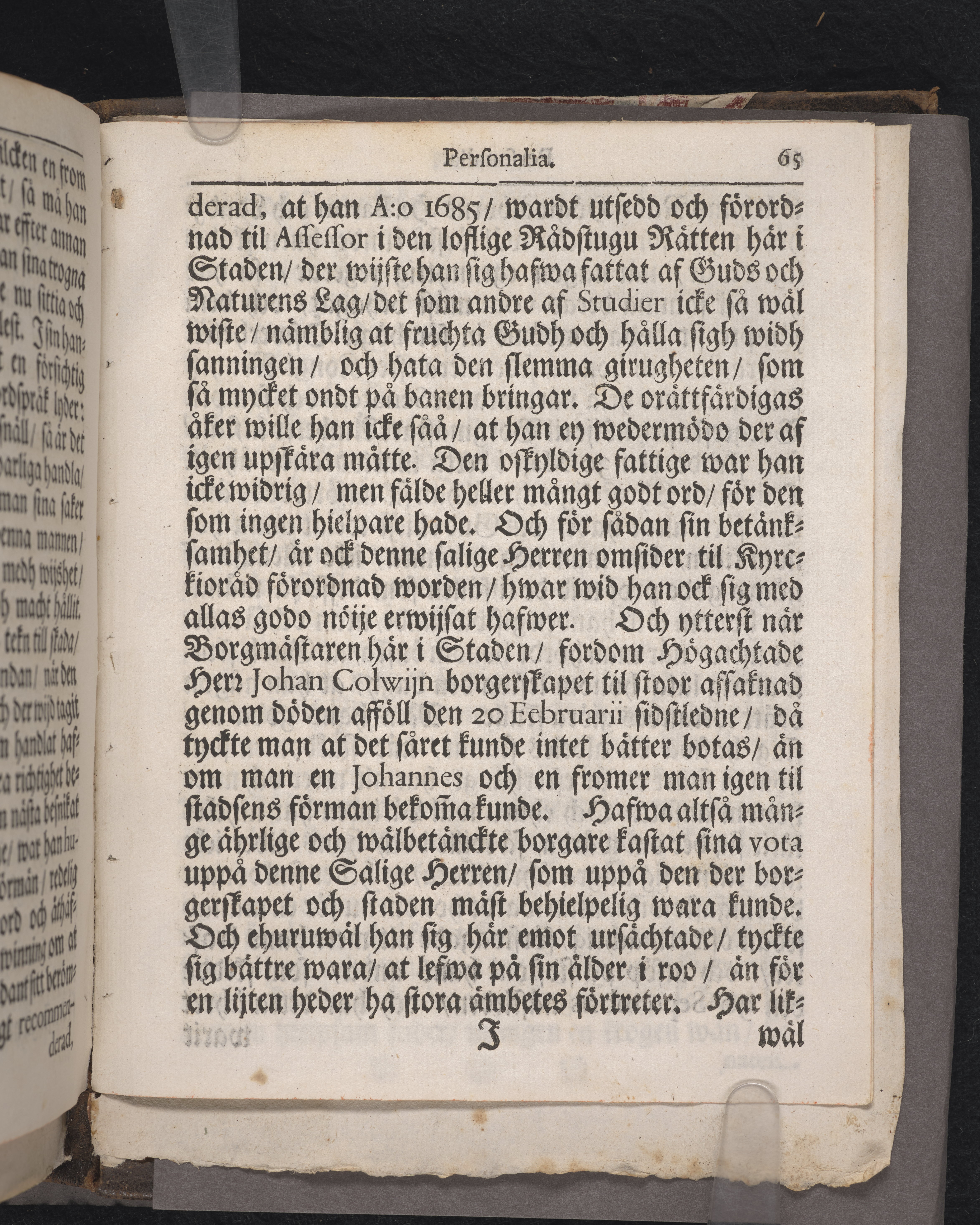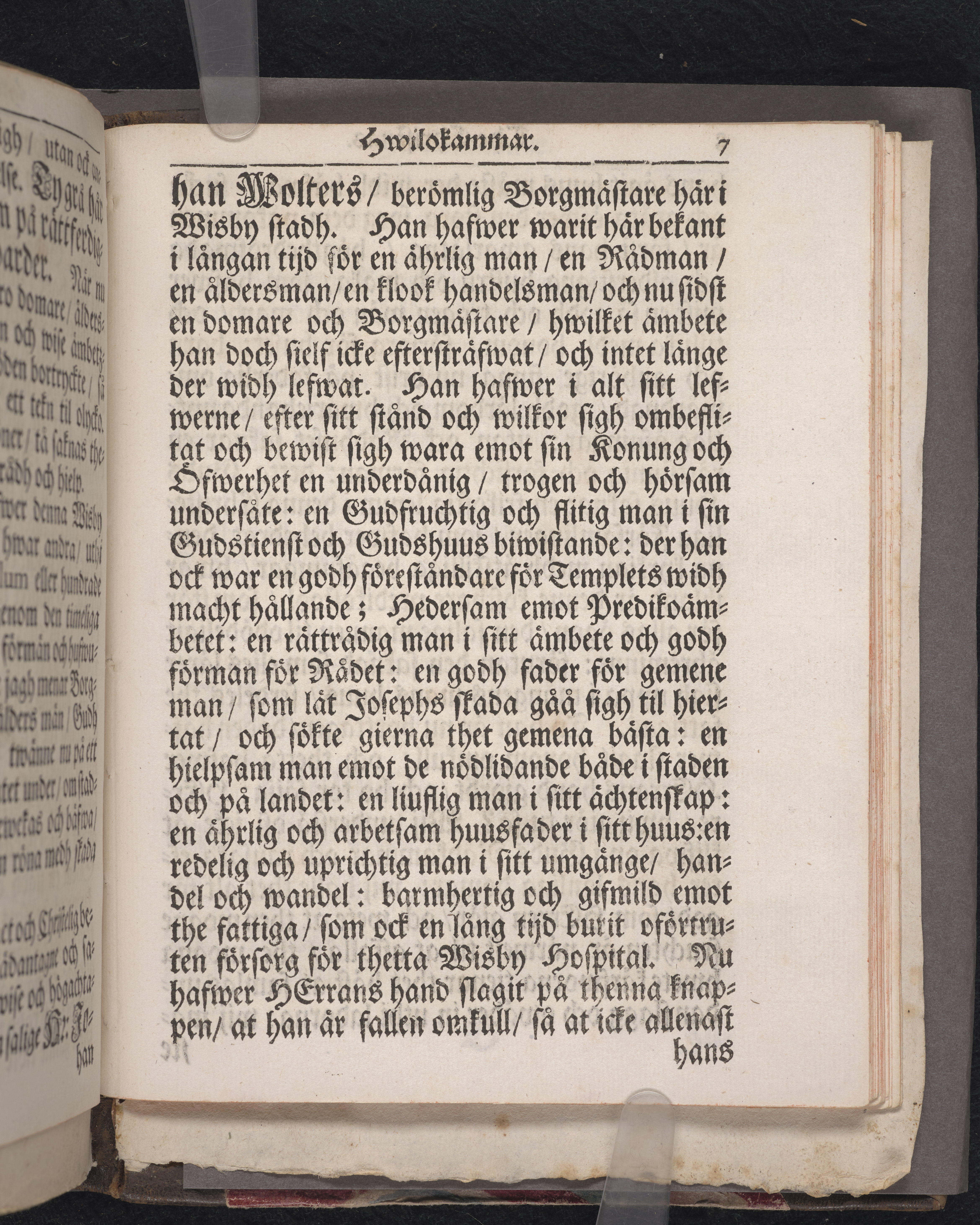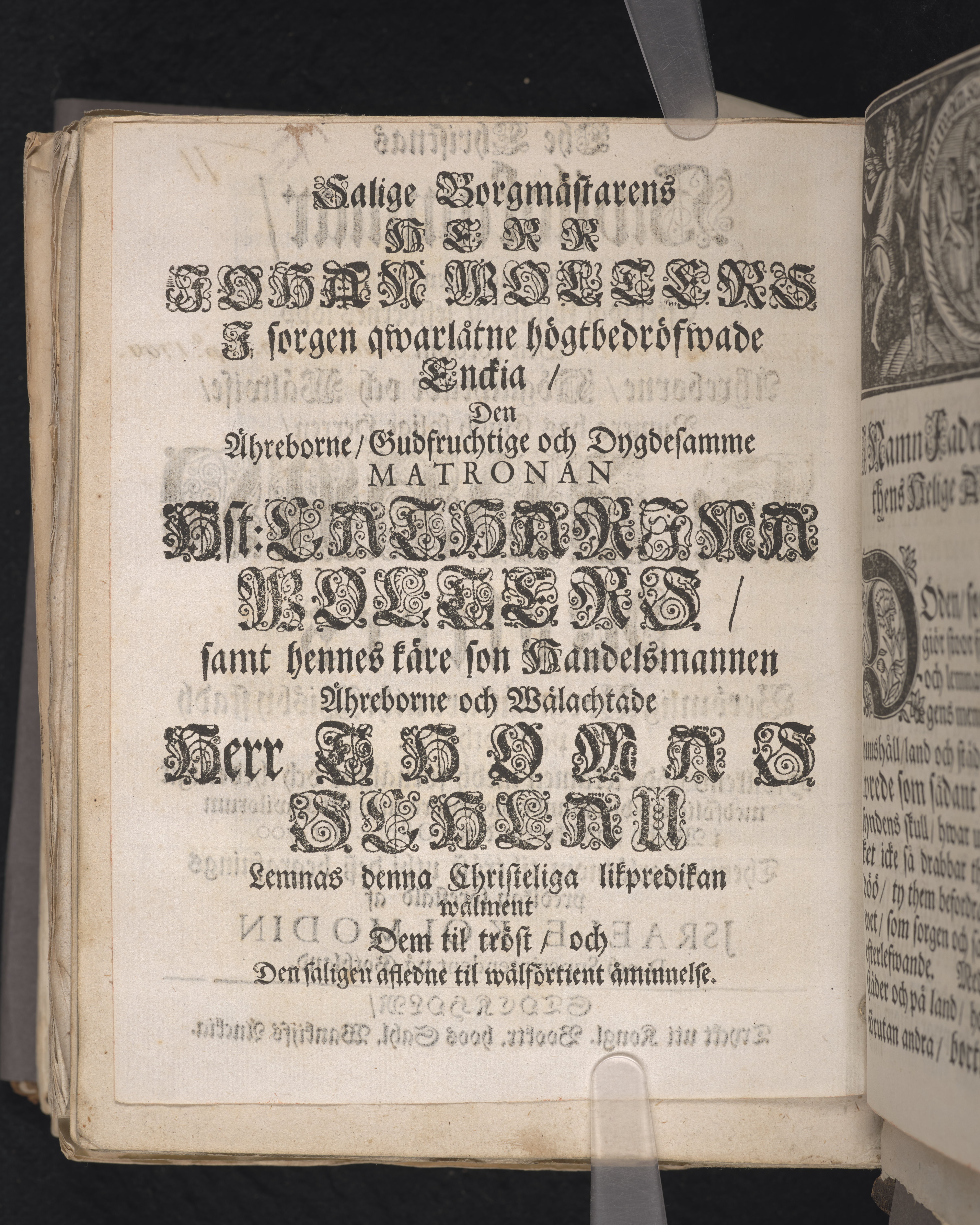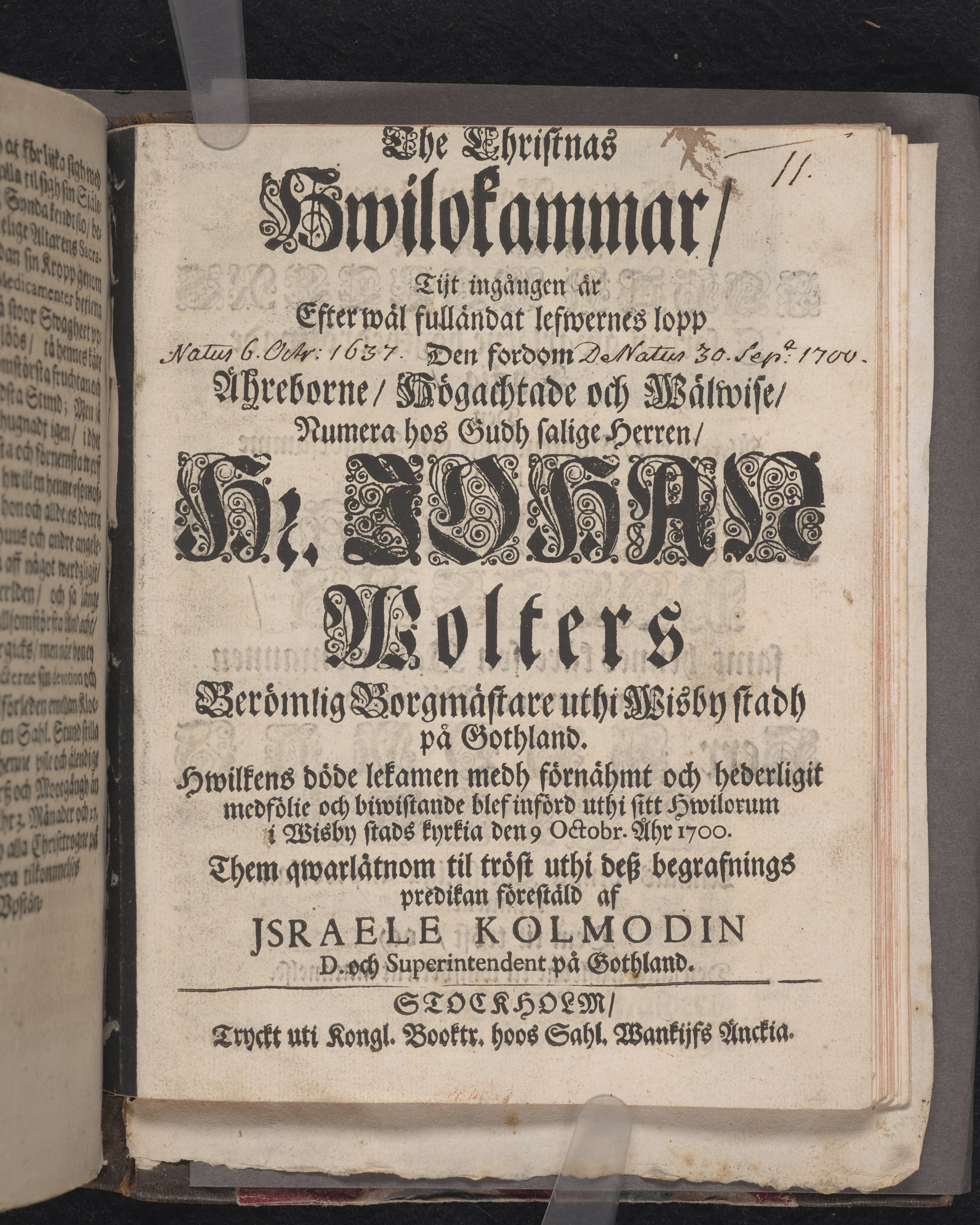 The christnas hwilokammar, tijt ingången är efter wäl fulländat lefwernes lopp den ... numera hos Gudh salige herren, hr. Johan Wolters berömlig borgmästare uthi Wisby stadh på Gothland. Hwilkens döde lekamen medh förnähmt och hederligit medfölie och biwistande blef införd uthi sitt hwilorum i Wisby stads kyrkia den 9 octobr. åhr 1700. Them qwarlåtnom til tröst uthi desz begrafnings predikan förestäld af Jsraele Kolmodin ... Stockholm, tryckt uti kongl. booktr. hoos sahl. Wankijfs änckia.