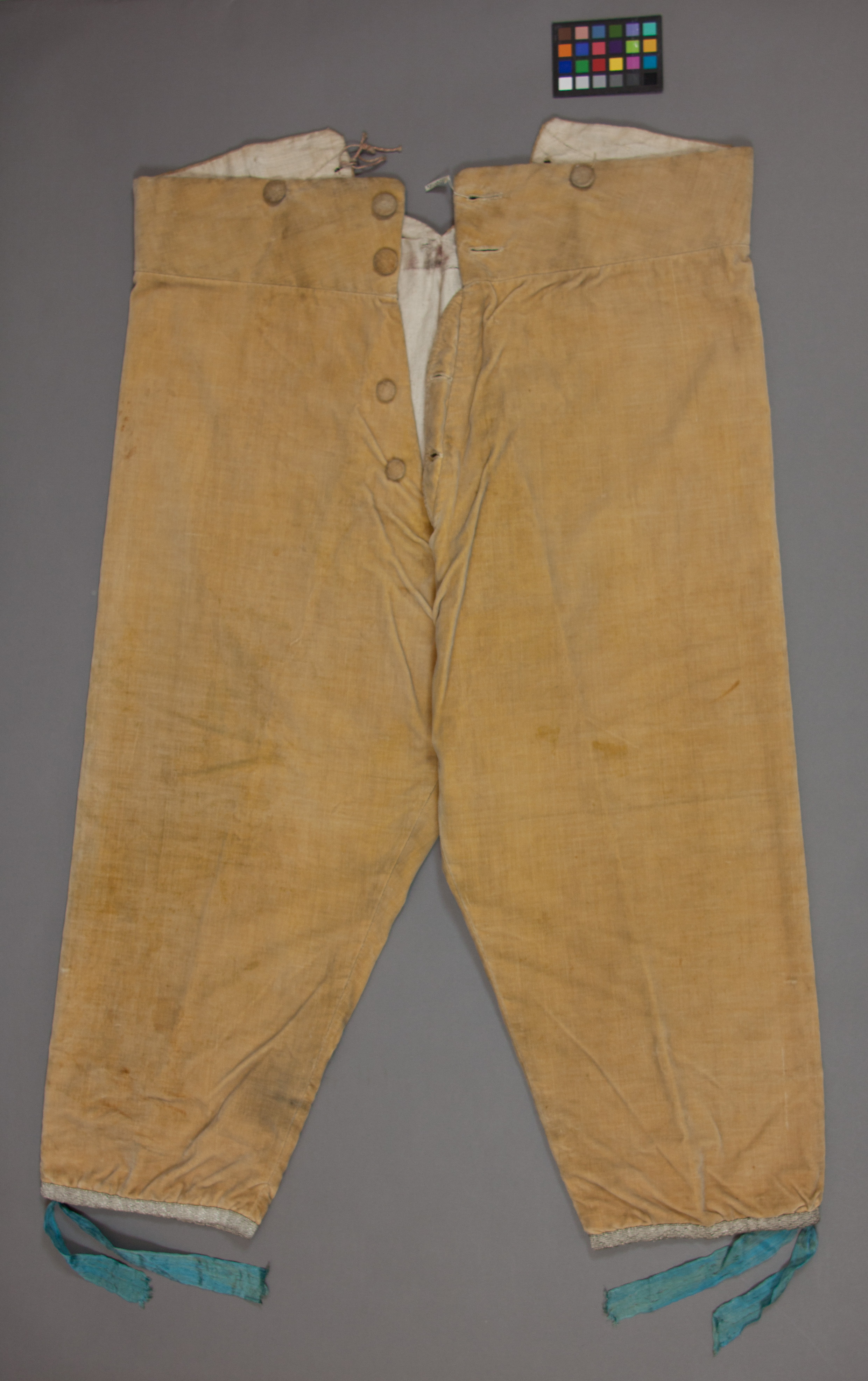 Knäbyxor i gul sammet som har knappgylf fram. Byxorna är fodrade med ofärgad linnelärft. Gylfen knäpps med fyra knappar fram, de två översta är större än de två nedre. Knapparna är klädda med samma material som byxorna i övrigt. På vardera sida av gylfen sitter på ovansidan av midjelinningen en knapp (se ovan). Byxorna slutar strax nedanför knäet. Bensluten har dekorerats med silvergaloner som fungerar som en dragsko med ett blått sidenband. På ryggen av midjelinningen sitter det enn v-format sprund med ett sydda hål på vardera sida. Genom dessa hål dras band för att kontrollera midjevidden. På utsidan av dessa sitter det en knapp på vardera sida (se ovan).