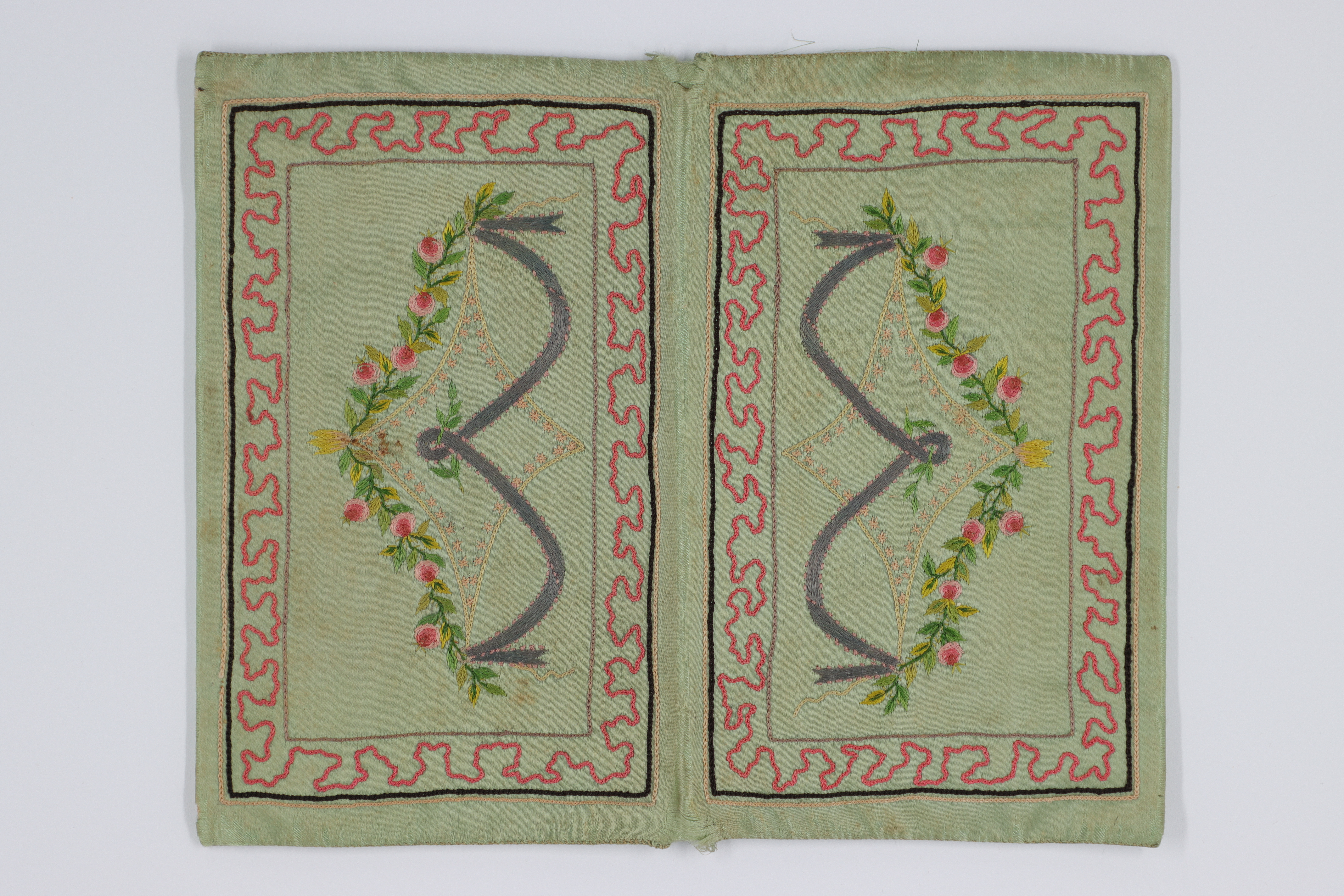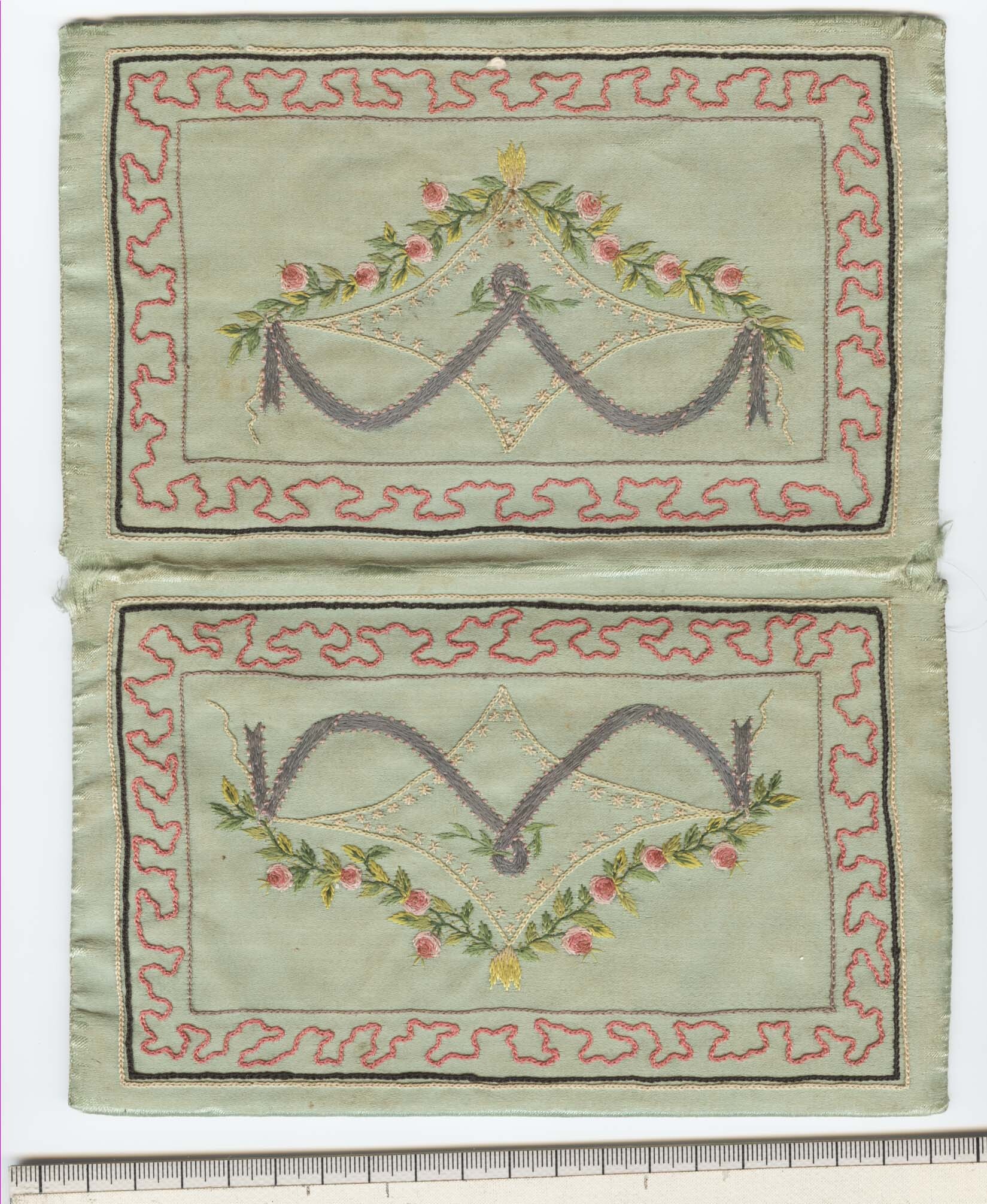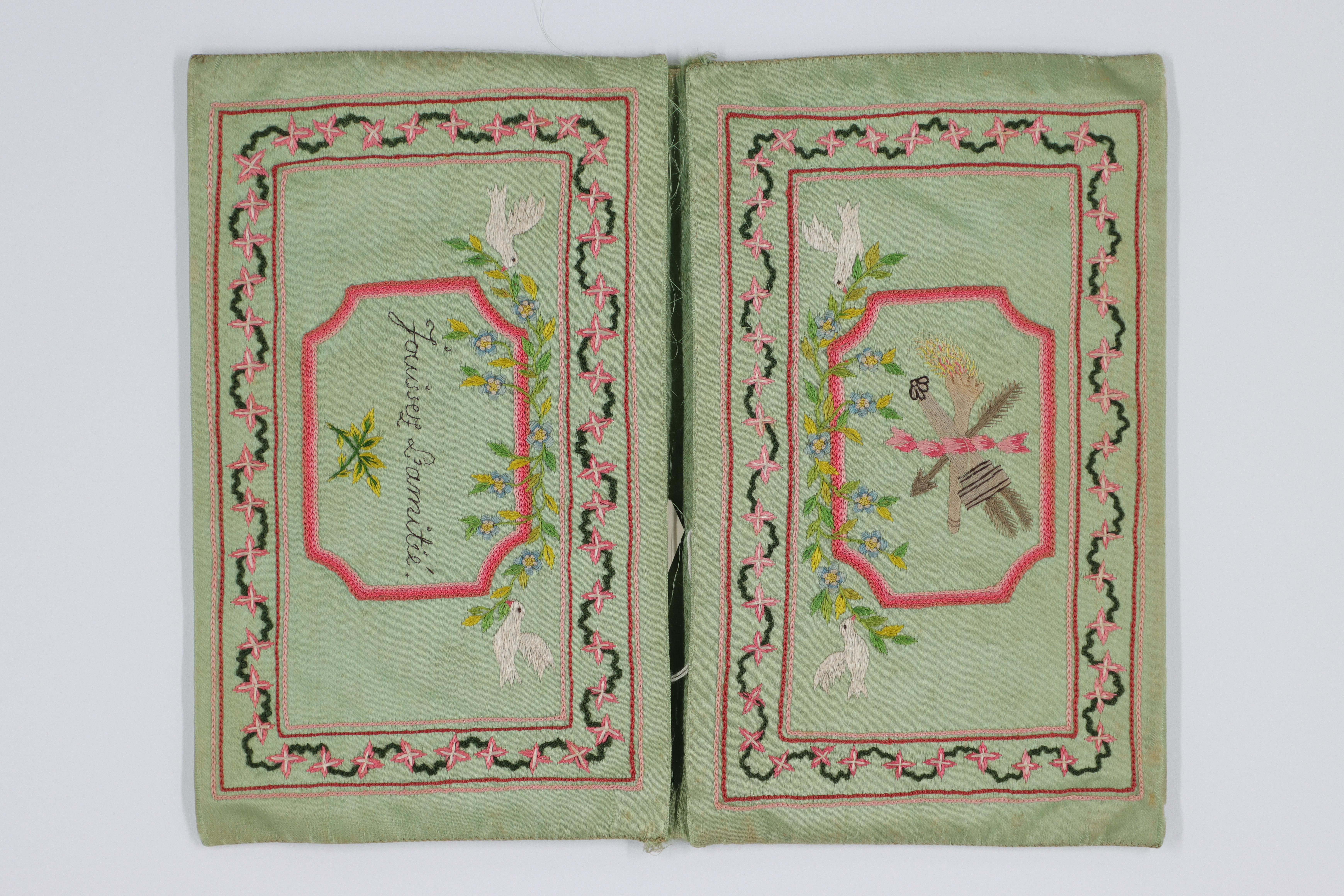 Plånbok av grönt atlassiden med broderier i tambursöm, schattersöm och knutsöm samt text sydd med själstygn. På utsidan rosor och girlander inom en ram. På insidans ena ficka ett symboliskt motiv inom en ram och duvor som håller i en blomgirland. På andra fickan texten "Jouissez L'amitié" inom en ram och likadana duvor.