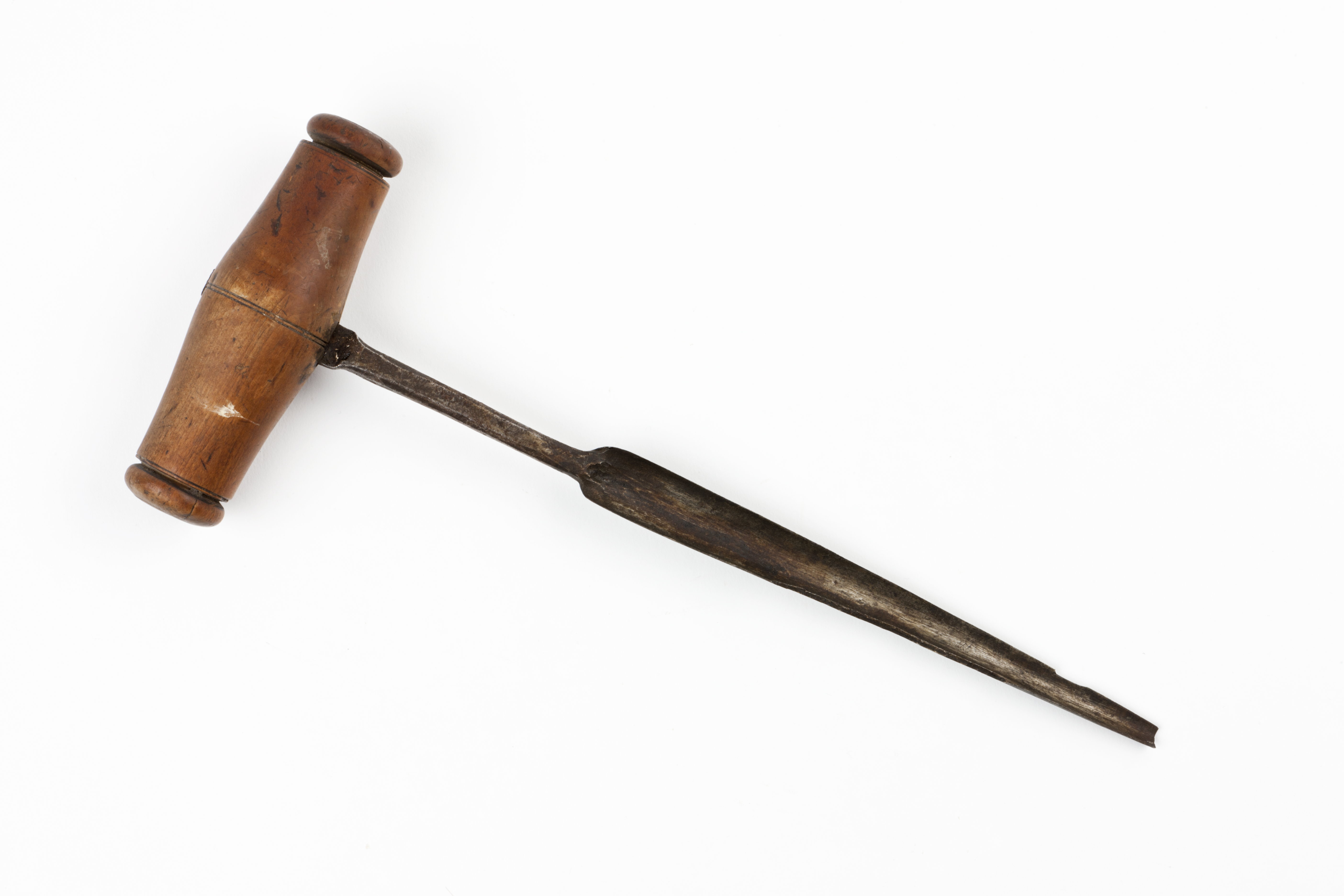 Fyrsidig med avfasade kanter och lång (185 mm) skålad borr avsmalnande nedåt. Svarvat, profilerat handtag av päronträ. Borren svartsmidd.