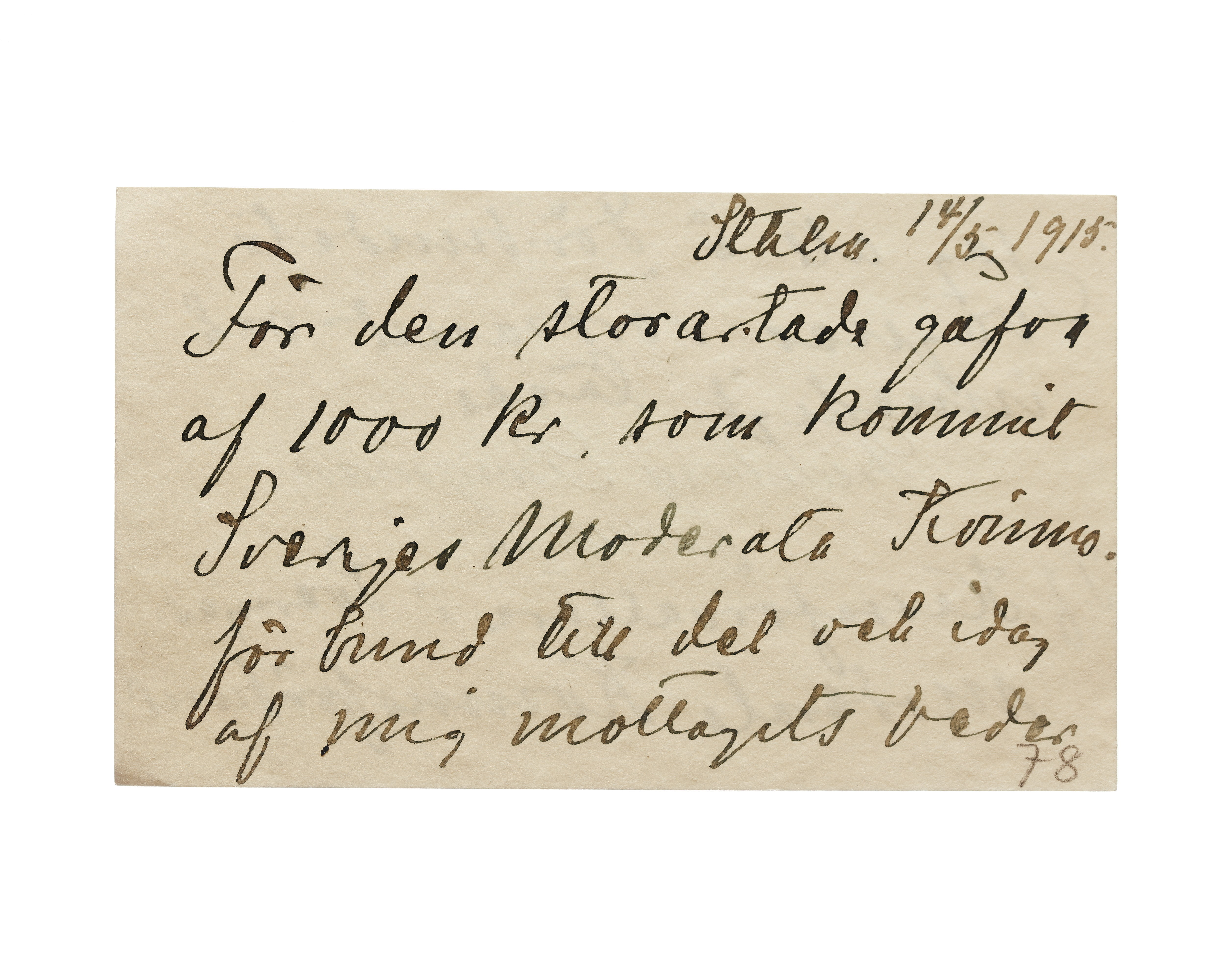 Ett visitkort från Frideborg Bergman f. Ullman. Daterat 14.5.1915. Handskrift "Sthlm 14/5 1915. För den storartade gåfva af 1000 kr. som kommit Sveriges Moderata Kvinnoförbund till del och idag af mig mottagits beder jag att å förbundets vägnar vördsamt och innerligt tacka (Frideborg Bergman, född Ullman) T.f. Kassaförvaltare i Sveriges Moderata Kvinnoförbund." Text på kuvert: "Moderata Kvinnoförbundet till W v H f. K. 1915/Kvitto"