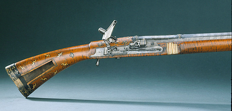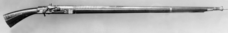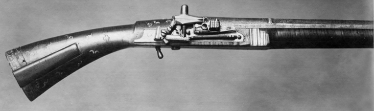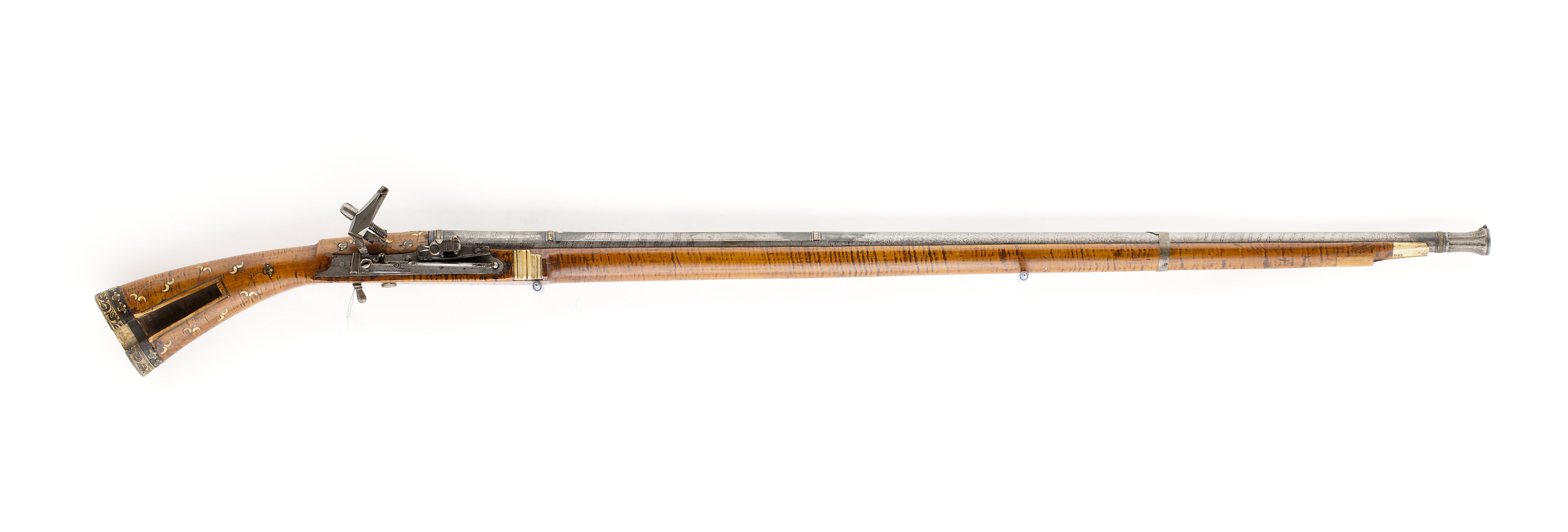 Rund, slätborrad pipa av damaskerat stål. Kammarstycket baktill runt, l: 113 mm, därframför åttsidigt, l: 264 mm med kanterna markerade av smala åsar. Bak på pipan och avgränsande det åttsidiga partiet ett tvärband av förgyllt(?) silver med filigrantrådar. På sidorna av det runda partiet en rankbård av påslaget guld (förgyllt silver?). På svansskruvbladet och kammarstyckets ovansida orientalisk rankdekor av påslaget silver. Från denna dekor utgår en smal ribba längs pipan ovansida fram mot mynningen, där övergående i rankdekor. Vid övergången till mynningspartiet ett silverband som på kammaren. Mynning med trumf och dekor av kannelyrer. Riktmedel: Laxning för sikte, knoppkorn av silver, inlaxad framifrån i trumfen. Fästning: Pipan fäst med krysskruv underifrån samt ett pipband av silver, på översidan bredare och konturerat med gravyr i form av blomornament. Snapplås av stål med plant låsbleck, l:179 mm. Rak hane med kraftiga, kantiga käkar, överkäken lös, hög, rundad käkskruv. Hankropp och hanfotens studel med filad dekor av sicksackband mm. Fängpanna med horisontellt rörligt lock med hålförsedd gavel med sicksackbård. Batteriet saknas. Utvändig slagfjäder med delvis fasade kanter. Fästning: Två låsskruvar. Rak, droppformig avtryckare. Helstock av tigrerat trä (lindat och bränt?) med nedåtsvängd, bakåt vidgad kolv med ovalt tvärsnitt. Kolvlåda med lock av trä. Bakplåt av ben, på sidorna graverad dekor i form av bladranka, inlagd med svart färg. Därframför ring av mörkt horn med inläggningar av vitt ben. På kolvens och framstockens bakre del inläggningar av ben i form av bladrankor, graveringen ifylld med svart färg. Rosettformiga låsskruvbrickor av ben, graverade som ovan. Beninläggningar runt avtryckare och krysskruv. På vardera sidan om framstockens bakre del en rektangulär, profilerad benplatta.