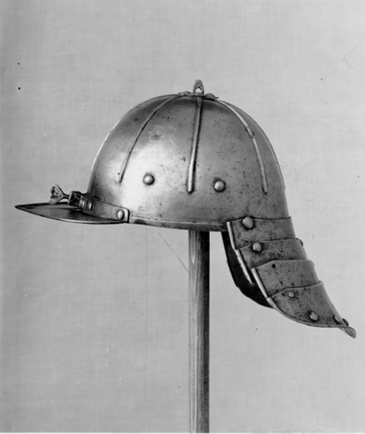 Sammansatt av klocka samt pann-och nackskärm. Oval, jämnt välvd klocka med åtta drivna, från mittpunkten utgående, v-formiga dekorlister, som slutar 40 mm från nederkanten, mellan de tre sidolisternas nederändar på vardera sidan två nitar med välvda huvuden (fästen för öronlappar?). Över mittpunkten en sexbladig blomma med drivna blad samt platt mittknopp med genomgående hål. Längs nederkanten en driven kantlist. Pannskärm, hjärtformig med kantlist på ovansidan, bakkanten uppvikt och fäst vid hjälmklockan med fyra nitar. Mitt på bakkanten en bygel för näsbärja, fäst med fyra nitar, justerskruv med hjärtformigt, platt huvud. Vid pannskärmens framspets ett runt hål, d: 10 mm. Pannskärmens l: 70 mm, b: 200 mm. Nackskärm, l: 150 mm, b: 235 mm, sammansatt av fyra lameller med kantlister, den yttersta utdragen i en liten spets. Lamellerna urspr. sammanhållna av läderremmar och stålnitar med stora, välvda huvuden, 15 st längs ytterkanten och fem längs mittlinjen, fyra nithuvuden saknas, en nit saknas helt.