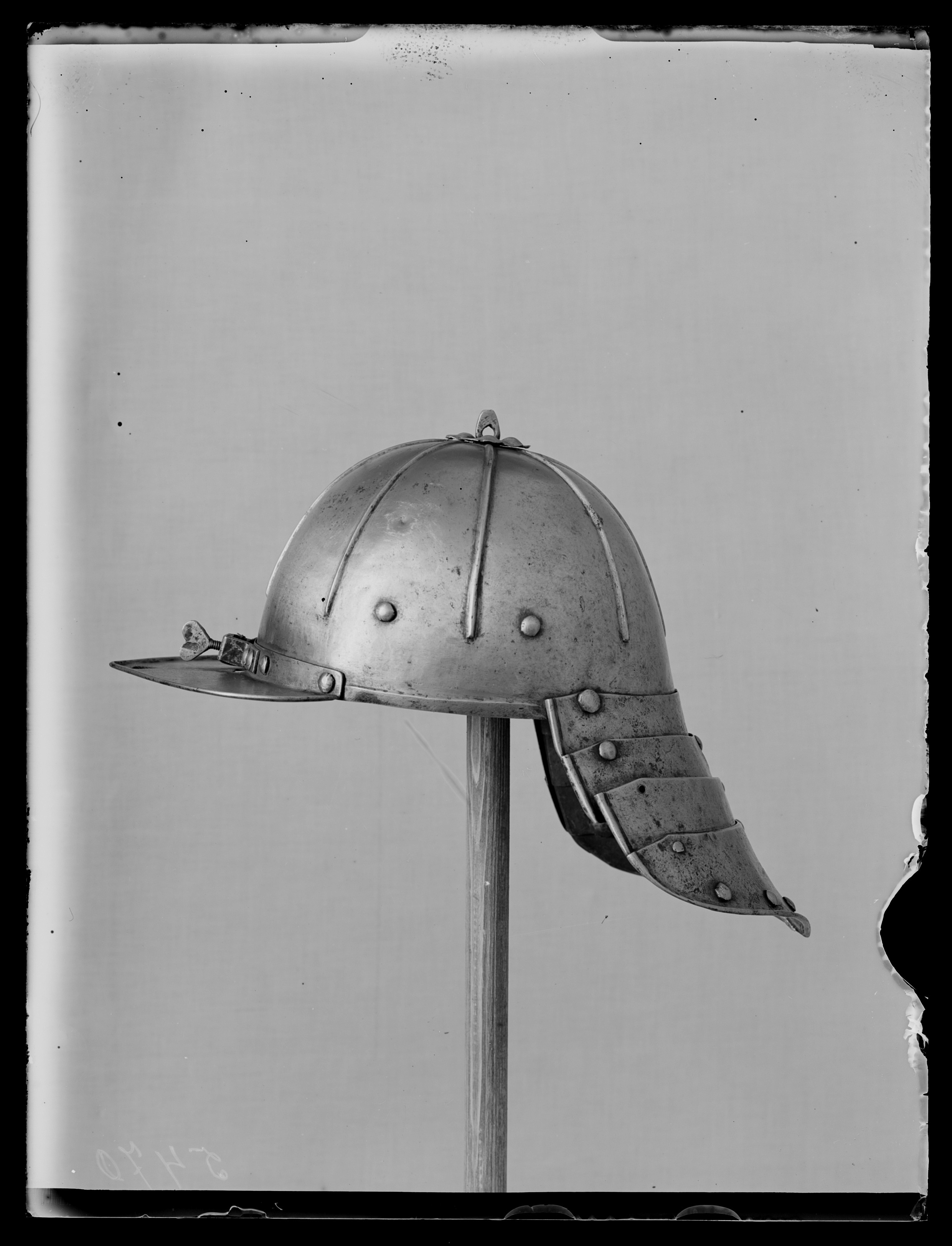 Sammansatt av klocka samt pann-och nackskärm. Oval, jämnt välvd klocka med åtta drivna, från mittpunkten utgående, v-formiga dekorlister, som slutar 40 mm från nederkanten, mellan de tre sidolisternas nederändar på vardera sidan två nitar med välvda huvuden (fästen för öronlappar?). Över mittpunkten en sexbladig blomma med drivna blad samt platt mittknopp med genomgående hål. Längs nederkanten en driven kantlist. Pannskärm, hjärtformig med kantlist på ovansidan, bakkanten uppvikt och fäst vid hjälmklockan med fyra nitar. Mitt på bakkanten en bygel för näsbärja, fäst med fyra nitar, justerskruv med hjärtformigt, platt huvud. Vid pannskärmens framspets ett runt hål, d: 10 mm. Pannskärmens l: 70 mm, b: 200 mm. Nackskärm, l: 150 mm, b: 235 mm, sammansatt av fyra lameller med kantlister, den yttersta utdragen i en liten spets. Lamellerna urspr. sammanhållna av läderremmar och stålnitar med stora, välvda huvuden, 15 st längs ytterkanten och fem längs mittlinjen, fyra nithuvuden saknas, en nit saknas helt.