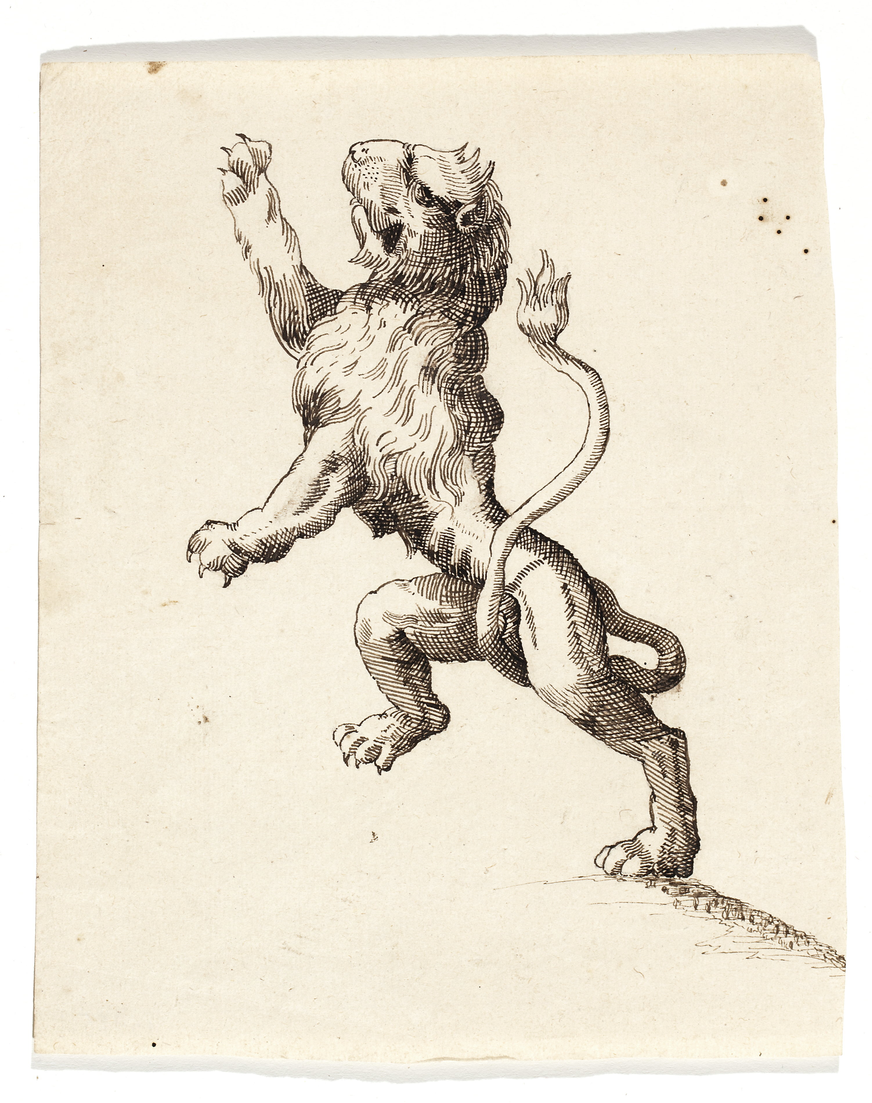 Två teckningar av uppresta lejon i profil. 15985:1: Vänstervänt, 15985:2: Högervänt. Tecknade med brunsvart bläck, som slagit igenom till baksidan. Nedtill på 15985:2 har lejonhuvud tecknats med blyerts.
