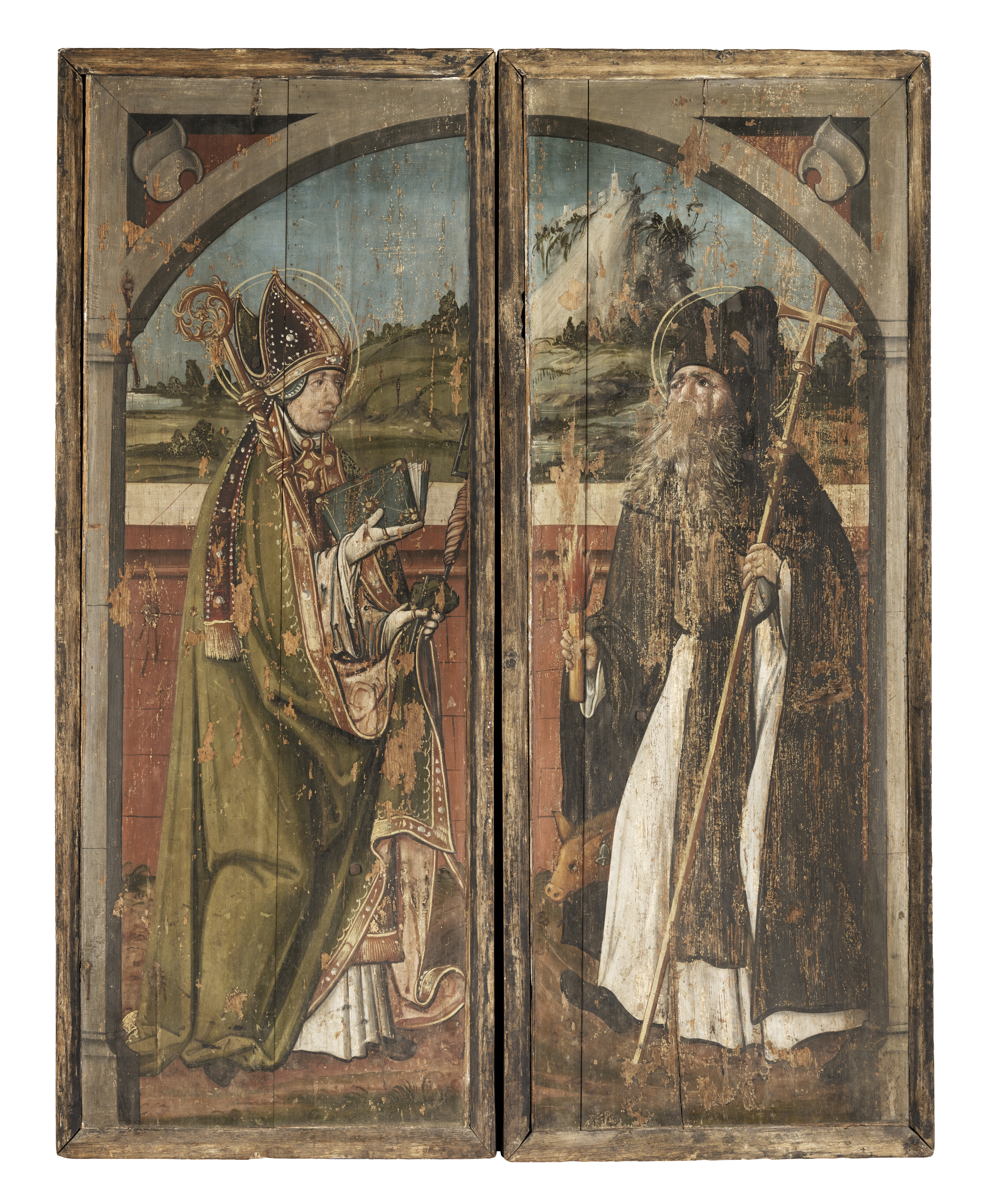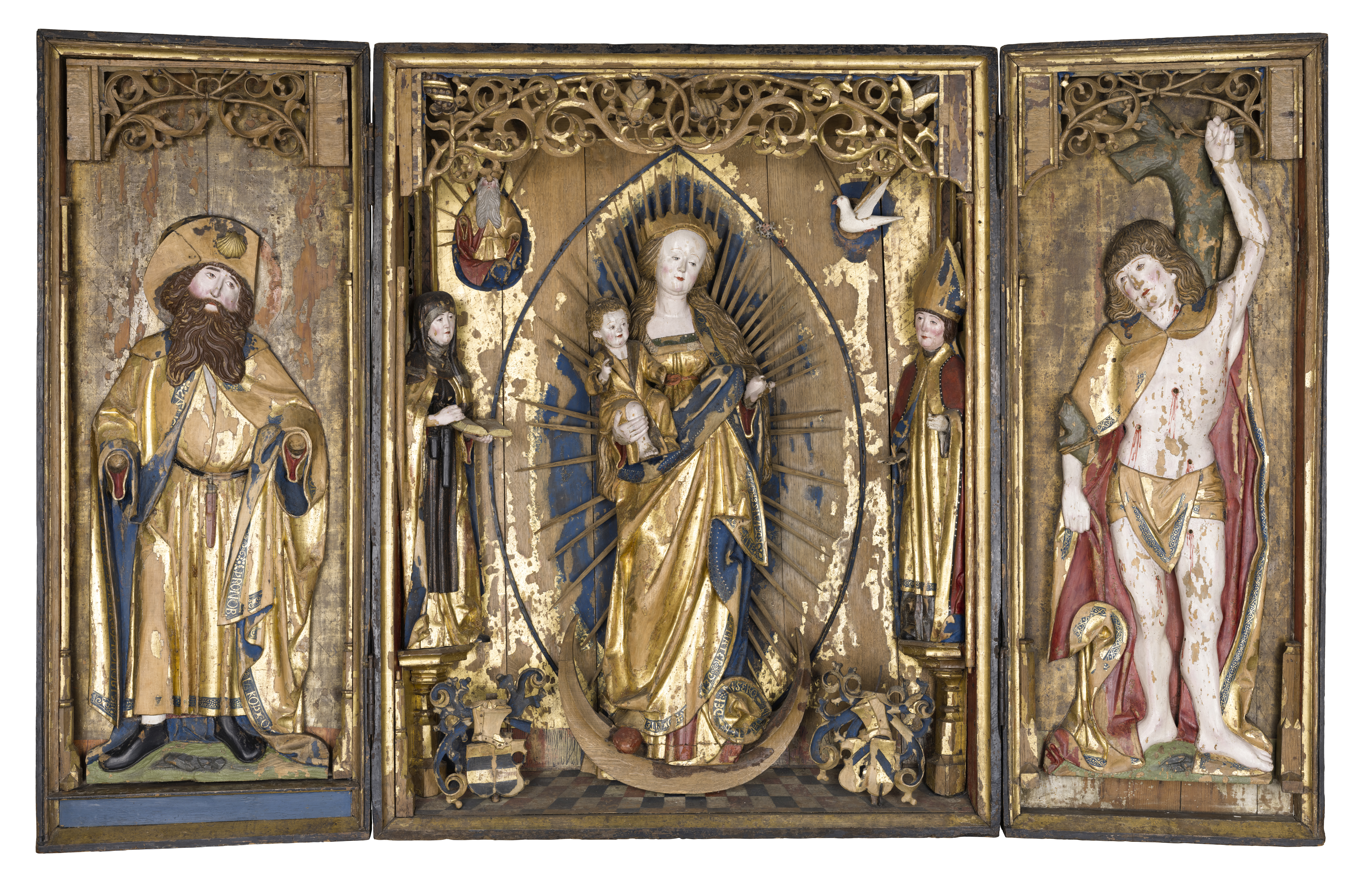 skulptur av lövträ, skåp av ek, furu. Kondition: god, några händer och attribut bortfallna. Färg: betydande partier av den ursprungliga polykromin bevarad men flagnande.