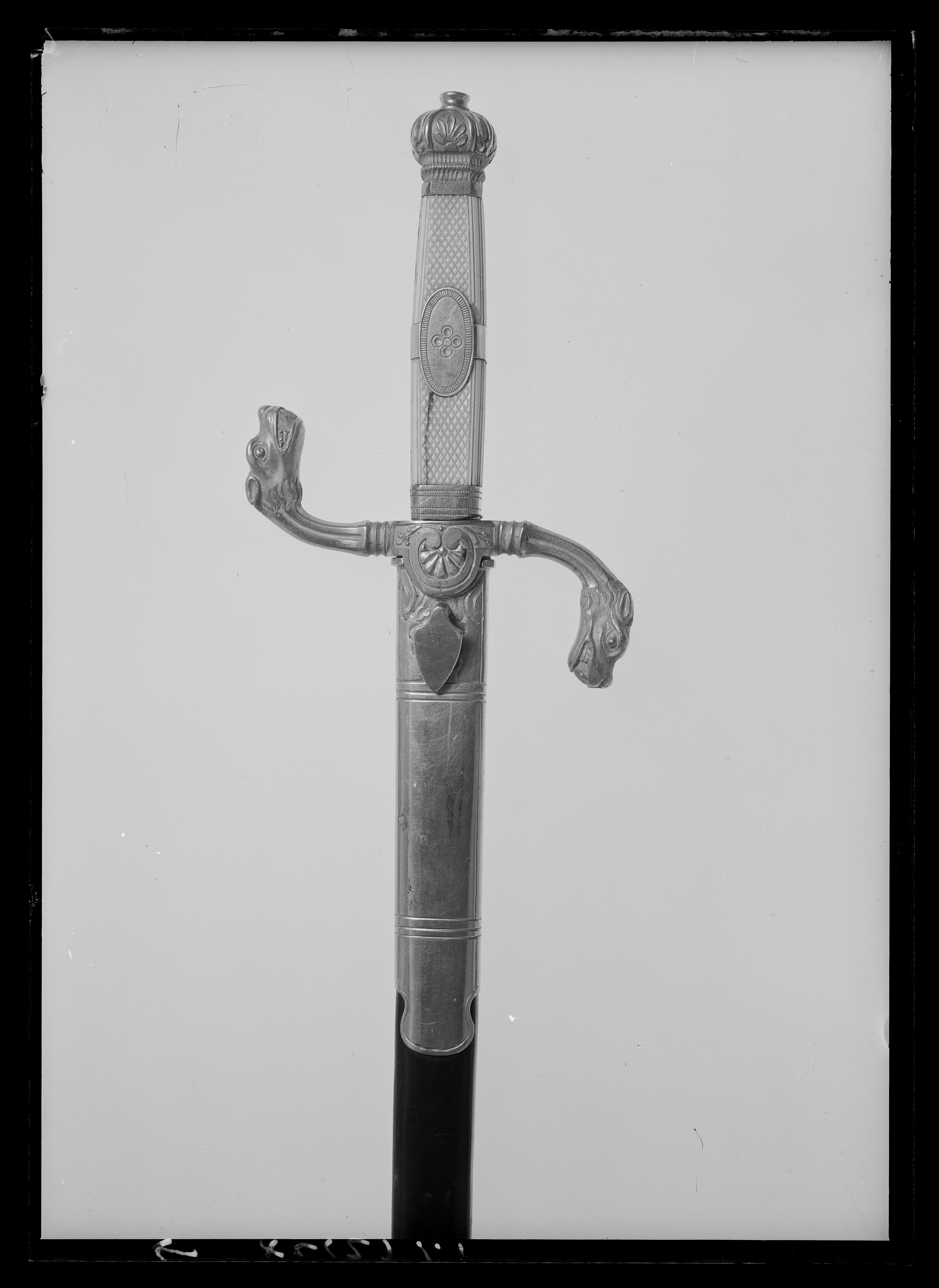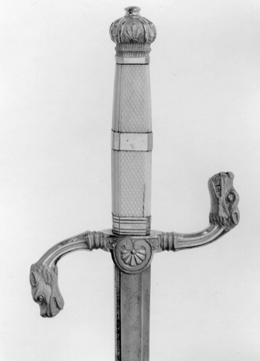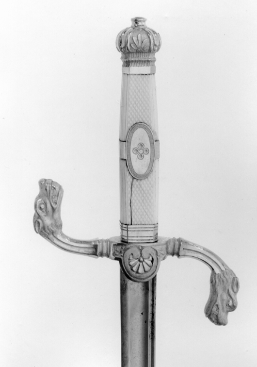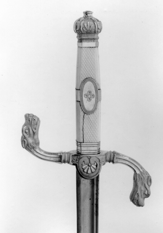 Svärdsfäste av förgylld mässing. Knappen rundat åttsidig med ciselerade palmetter. Tillplattad, rund nitknapp. S-formigt böjda, åttsidiga parerstänger, avslutade med drakhuvuden. Krysset med halvrund nedre styrskena med palmett i relief. Kavel av rutmönstrat elfenben med förgylld ring mittpå, oval medaljong på utsidan. Klinga rak, eneggad till spetspartiet som är tvåeggad och flackslipat. Längs ryggen en mindre hålkäl och intill denna en bred, grund hålkäl. På klingans rygg intill basen stämpel: "GIERSTAD", därefter graverad inskription: "Christiania 1839". Har tillhört Karl XIV Johan, nr 538 i Karl XV:s samling, 1872 förvarad i Adjutantsrummet på Stockholms slott. Avbildad på Kiörboes ryttarporträtt av Karl XIV Johan, 1843-1844.