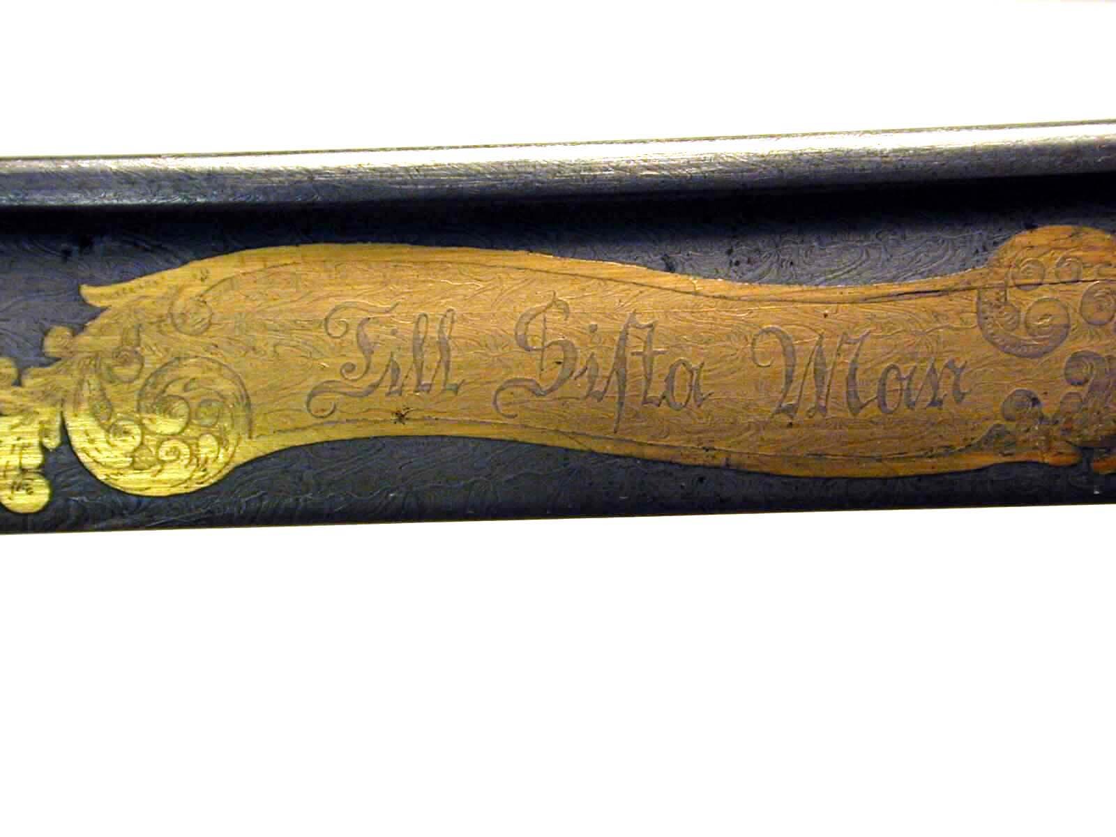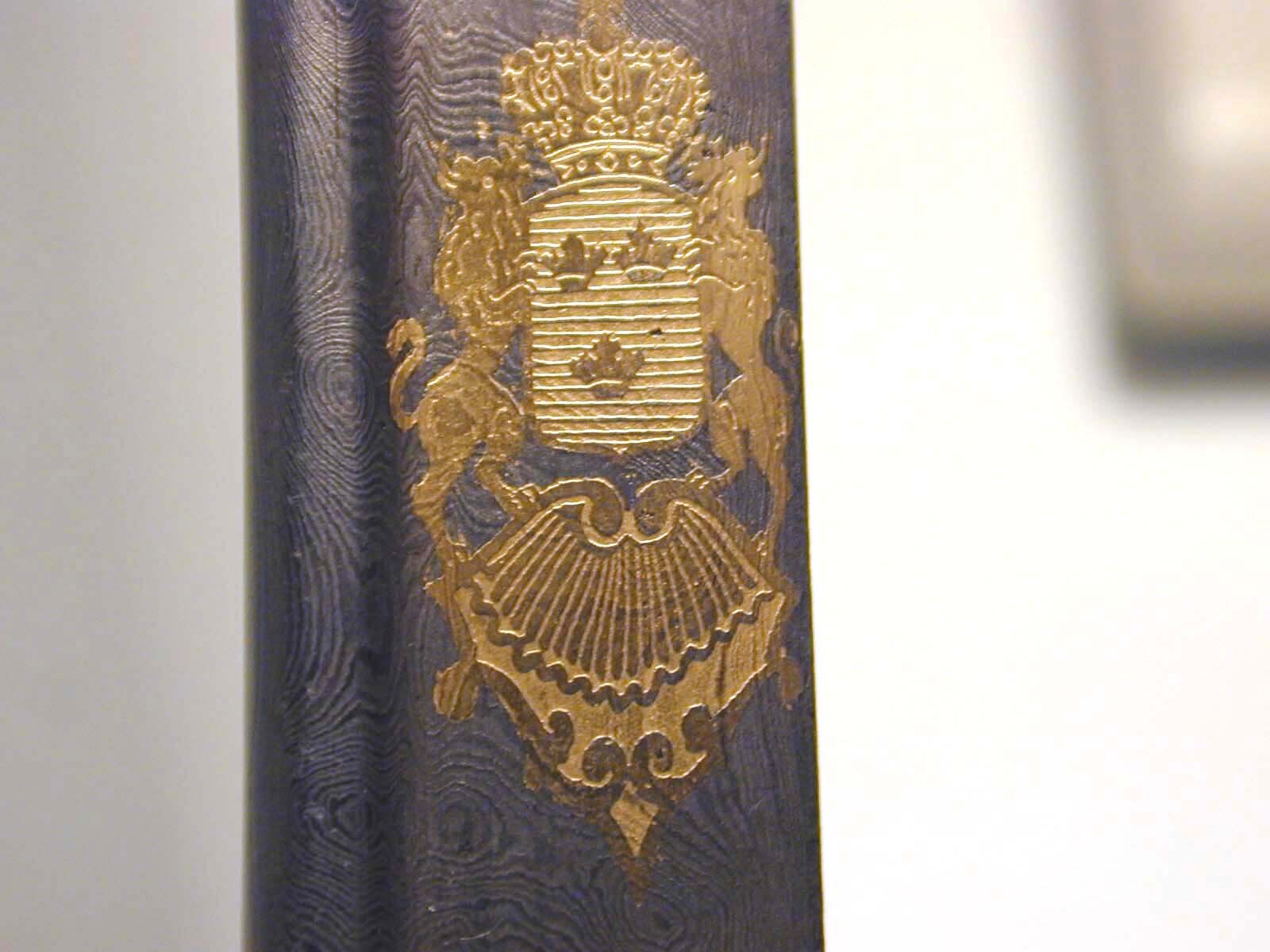 Fäste av förgylld mässing, parerplåtarna med gjuten, ciselerad reliefornering, delvis genombruten. Kappa framåtböjd, belagd med ett lejonhuvud (döljande tångens nithuvud) och baktill övergående i ryggskena. Handbygelns överdel är intappad i kappans framdel, bågformigt böjd och ca 35 mm från intappningen övergående i en stor, skålformigt böjd, nedåt vidgad parerplåt, som medelst en slät list är symmetriskt delad i en yttre och en inre hälft. Parerplåtens ornering består av: på yttre hälften ett av kunglig krona krönt spegelmonogram C, omslutande XV. Monogrammet på sidorna omgivet av kraftiga, genombrutna akantusrankor; på inre hälften ett med kunglig krona krönt trekronorsvapen i en konturerad, nedtill breddad sköld med stående lejon som sköldhållare, trekronorsvapnet på sidorna omgivet av kraftiga, genombrutna eklövsrankor med ekollon. Bakre parerstången kort, tvådelad, böjd nedåt-inåt. Kavel klädd med svärtat fiskskinn och med en längsgående rad av tre nitar med tämligen små, kupiga, släta och förgyllda nithuvuden. Klinga något böjd, eneggad med en ca 297 mm lång jelman, välld damaskering. Ryggsidan stavformig, stavformen fortsätter som en list över jelmanen fram till udden. På starka delens utsida etsad och förgylld ornering i form av ett språkband med texten: "Till Sista Man"; på insidan, likaledes etsat och förgyllt, ett förhållandevis litet, krönt trekronorsvapen med lejon som sköldhållare.