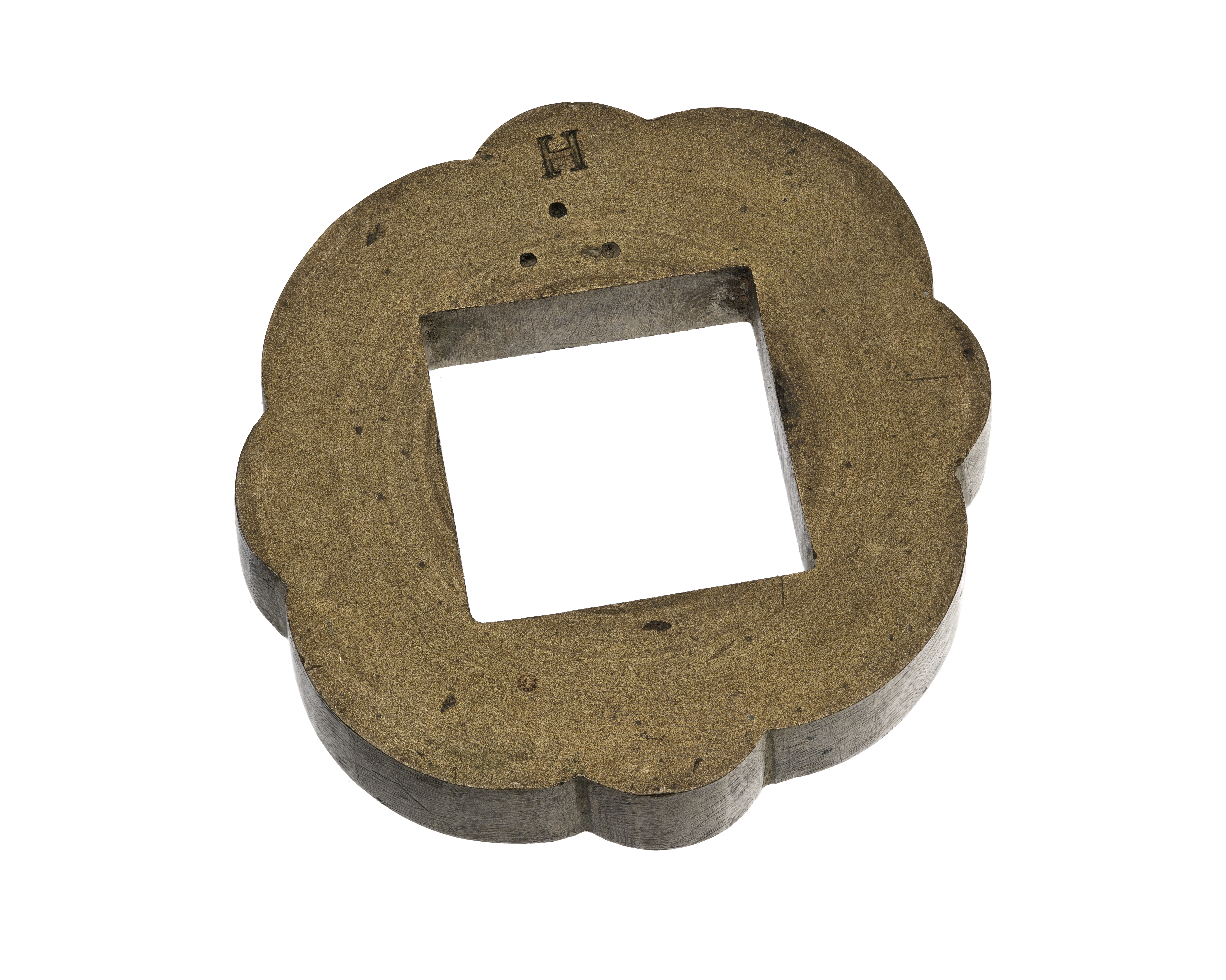 Kvadratiskt hål med 2,5 mm sida. Stämplad på ena sidan med tre punkter och "H", på andra sidan med en punkt.