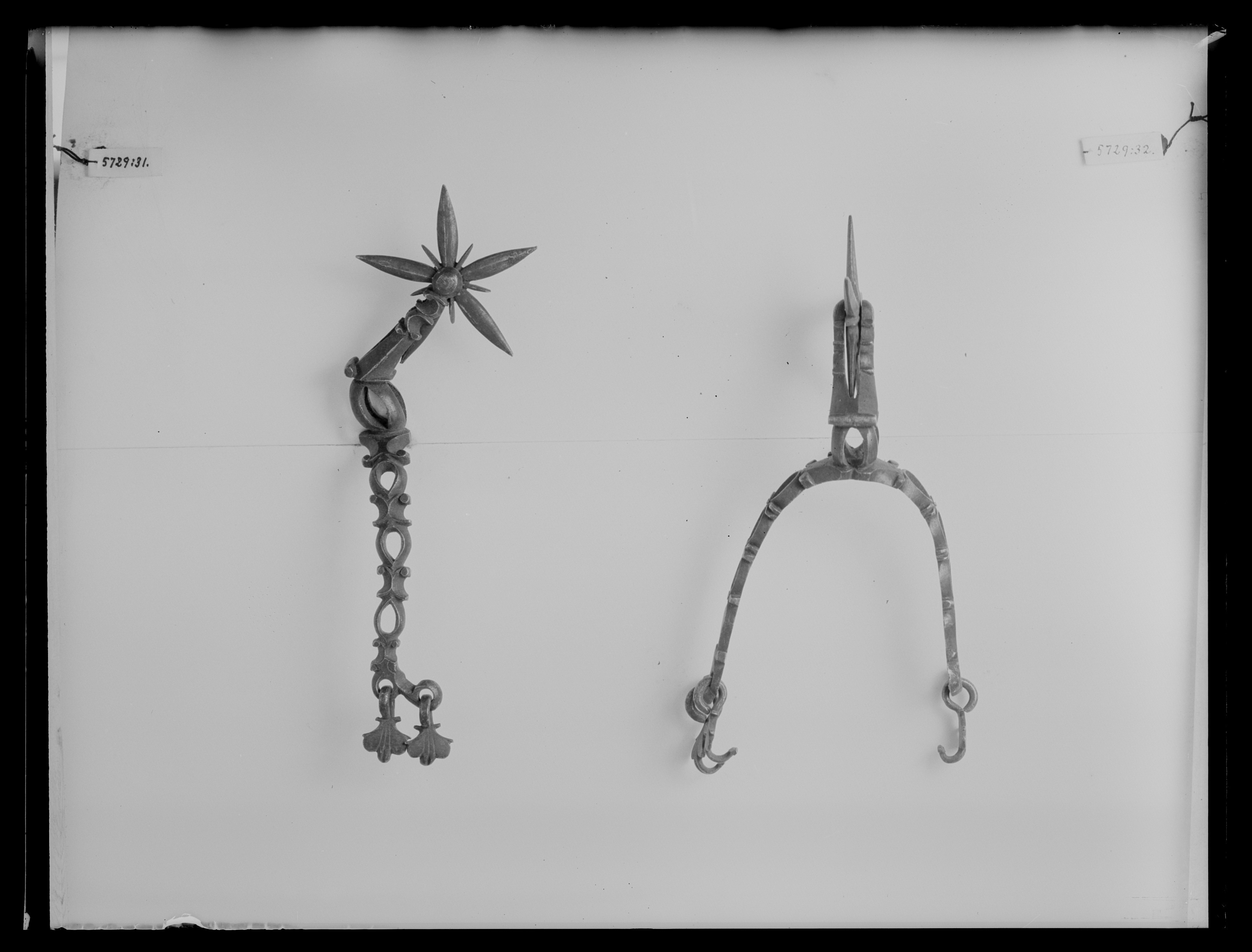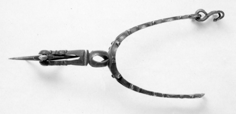 Sporre av stål. U-formade en aning böjda skänklar, genombrutna och ciselerade, ändarna böjda med två hål, vari ena änden två hakar. Hals, l: 54 mm, böjd i vinkel genombruten och ciselerad. Femuddig klinga, d: 52 mm, med fem små uddar i mitten.