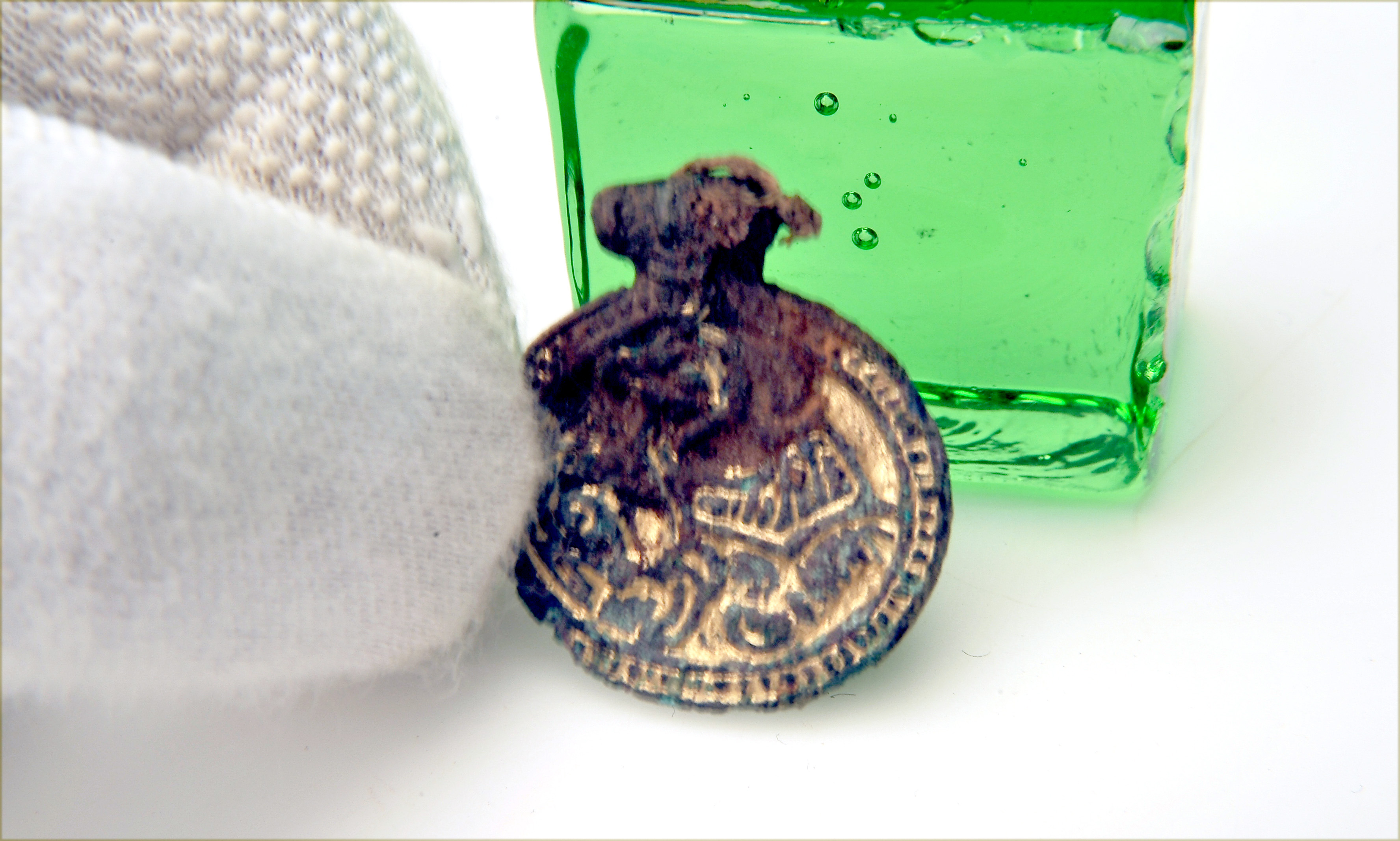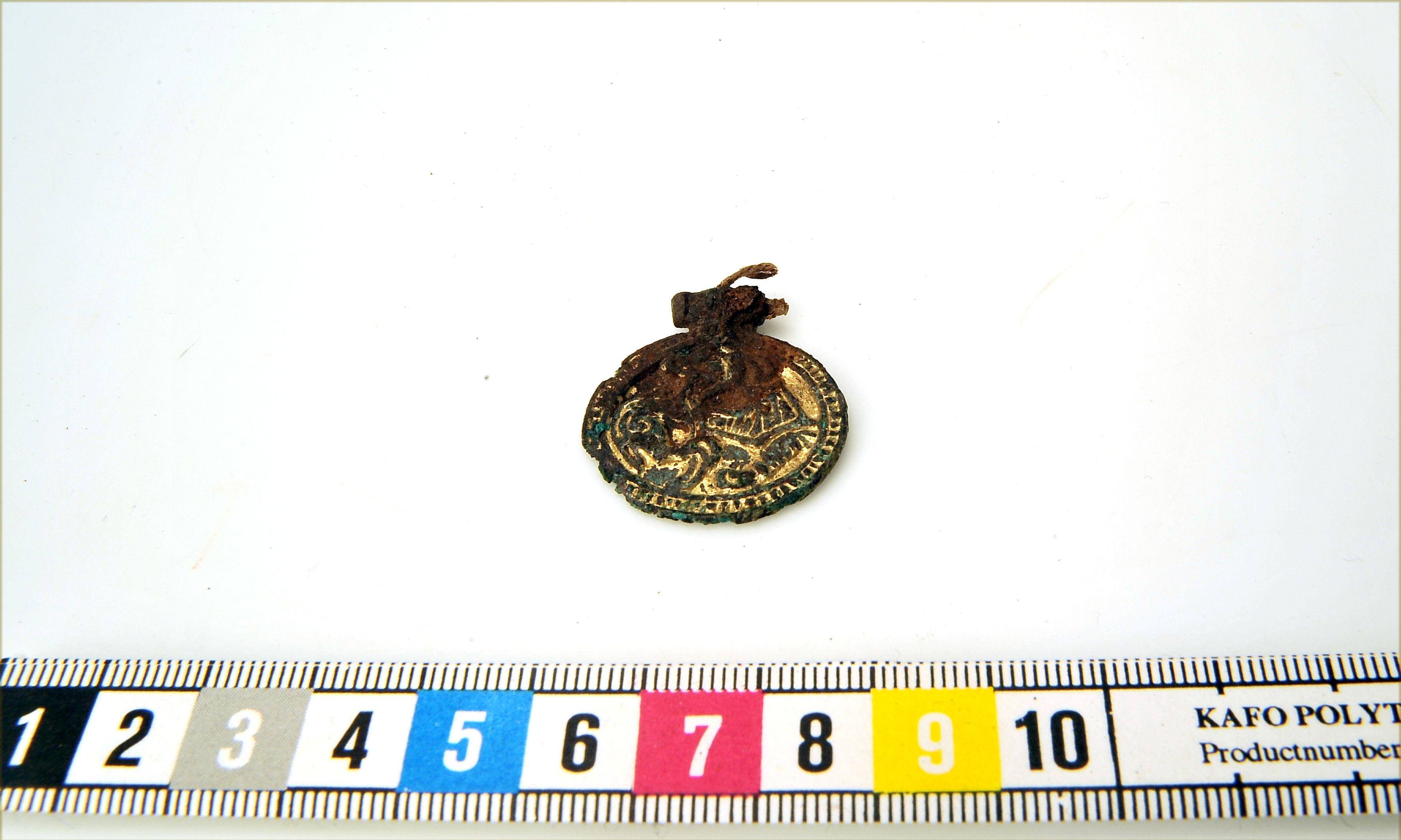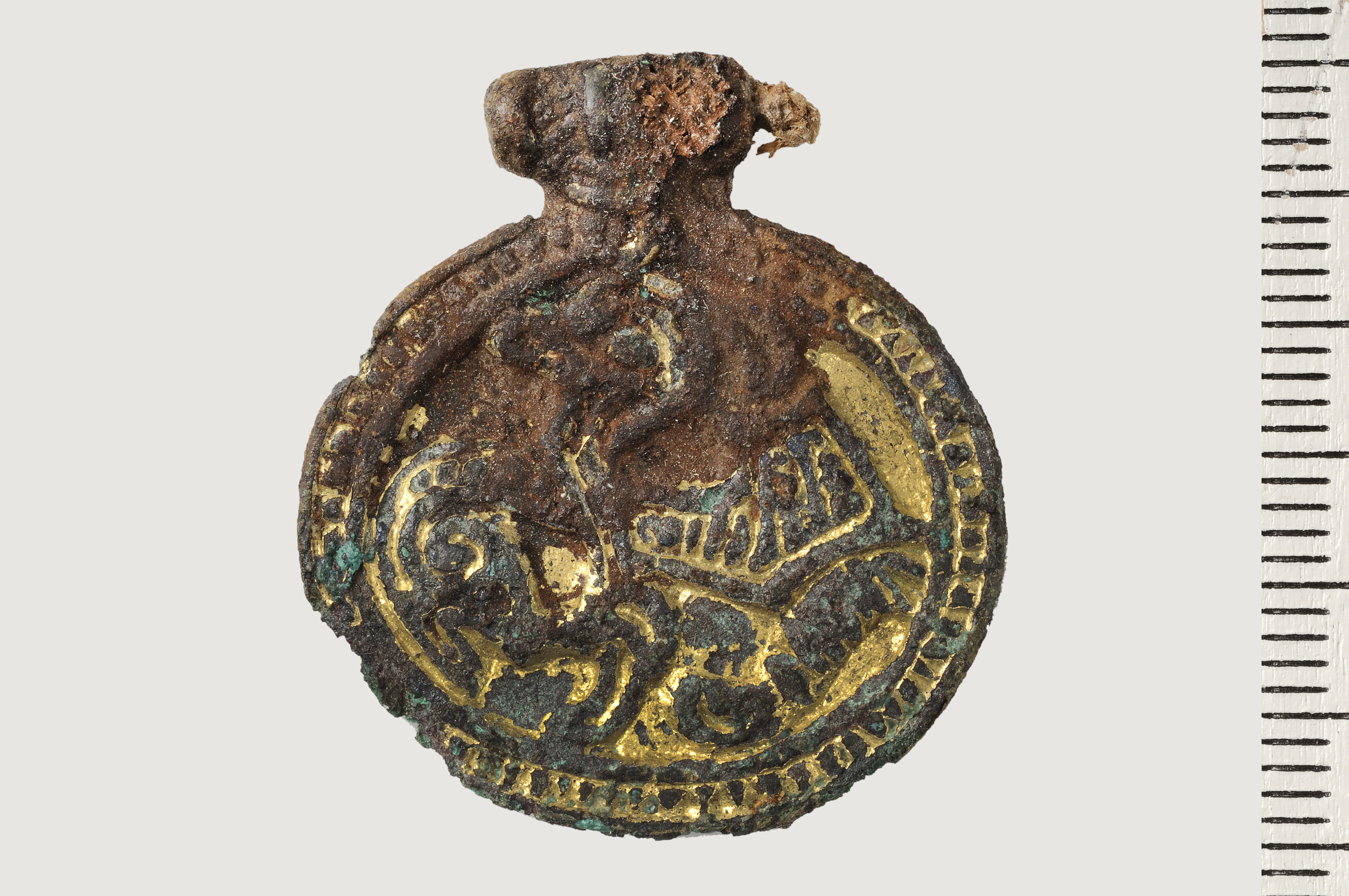 Bronshänge i Jelling-stil med bevarad halsbandssnodd och vidsittande textilrester.