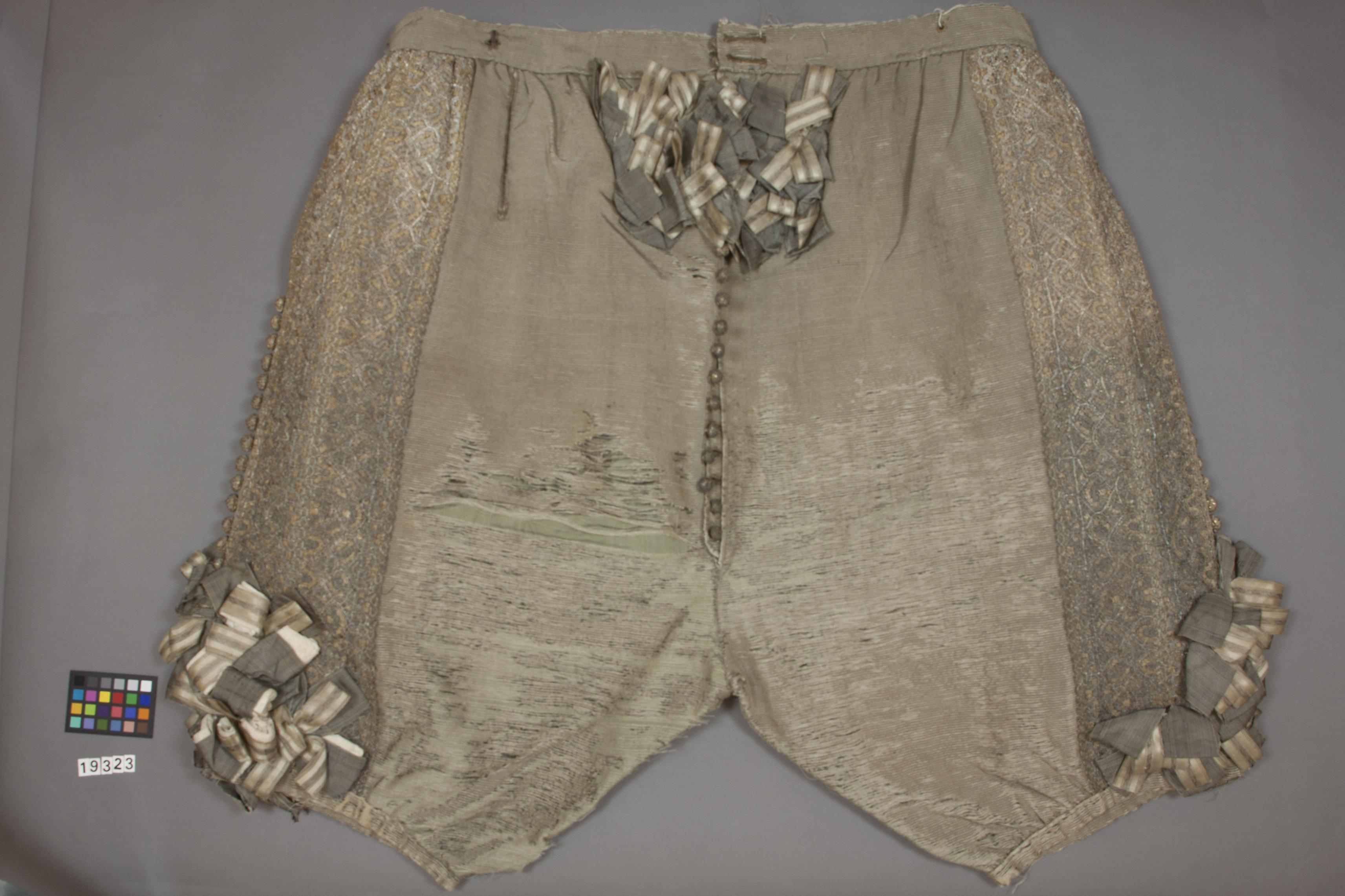 Byxorna skiljer sig till materialet från jackan och de andra byxorna. De är förövrigt illa medfarna. Materialet är grå rips med en vådbredd av minst 50 cm (70x17 á 20 tr/cm2). Det är ett grått randigt siden med ripseffekt vart 4:e inslag och varp av grått otvinnat silke.Inslag av 1 tjock, grå tråd (bestående av 4 otvinnade trådar) samt 3 smala, svarta trådar. Stad: 0,5 cm (14 gröna, 6 vita, 14 gröna trådar). Byxorna är av relativt snäv, rynkad modell. De är förmodligen sydda av 4 hela stycken. (Dethar ej kunnat upptäckas några synliga skarvar men under spetsgarneringen som följer sidsömmarna kan sådana ev. dölja sig). Sömmarna är raka i sidorna och baktill men obetydligt sneddade framtill. Här finns ett 46 cm långt sprund med en 38 cm lång knäppslå. Denna är försedd med 16 st drygt 3 cm långa knapphål (sydda med ca 9 stygn/cm med brunt högertvinnat silke - synbarligen ej över någon tråd, då tygets randning utomordentligt väl lämpat sig för trådrak sömnad). Alla knappar är bevarade framtill. De är 1,3 cm i diamteter och gjorda av guldlan samt silverlanomspunna trådar, överst sitter ett litet kryss av guldkantilj. Upptill är byxorna rynkade vid den 130 cm långa linningen, som har skarvats av 3 bitar. I den återstår nu endast 2 små (knappt 2,5 cm långa) hakar av silver, fastsydda utanpå linningen med gulbrunt silke. Mitt fram finns 2 något större knappar (d: 1,7 cm). De 4 cm långa knapphålen till dessa är sydda med något glesare stygn än knäppslåns (7 á 8 stygn/cm, de är däremot sydda över entråd). Byxorna har nedtill en dragsko, genom vilken ett grått sidenband löper. Sidsömmarna har upptill försetts med knappt 25 cm långa sprund för fickorna och nedtill har de fått ca 13 cm långa, något sneddade sprund, som avslutas med en rosett. På den bit som återstår för sidsömmen har man garnerat byxorna med en rad knappar, 15 st i varje sida (av den vanliga typen, d: 1,7 cm). I linningen finns också en liten urficka framtill på vänstersida. Man har förstärkt linningen med ett stycke linnelärft (21x18 tr/cm2). Sprunden vidfickorna och knäppslån framtill är skodda med grått mönstervävt band. Den mindre fickan på höger sida finns även i dessa byxor. Byxorna har mellanfoder av grå yllelärft (22x17 tr/cm2 med grå varp och brunt inslag). Innerfodret utgörs av vit linnelärft (30x27 tr/cm2). Det ärmed rynkor fastsatt vid liningen och saknar sömmar i sidorna. Blott fram- och baktill finns sömmar i fodret. Garneringen utgörs av spetsar och bandrosetter. Spetsgarneringen går här endast i vertikalled. Ca 1,5 cm från sidsömmen sitter åt vardera hållet 15 cm breda knypplade spetsar, som i själva verket består av 4 sammankomponerade spetsar alldeles som på de föregående plaggen. Från sidsömmen räknat blir det 1 smal, 1 bred, 1 smal, 1 bred spets. Rosetterna är av 2 slag, dels grå sidenrosetter (4,6 cm breda bestående av grå varp och svart inslag 50x23 tr/cm2), dels ljusare atlasband (2,4 cm breda med 15 inslagstr/cm och varp av vitt silke, guld- och silvertrådar - inslagen endast av vitt silke). Dessa band är knutna i vardera 4 öglor. Till varje rosett av det grå bandet åtgår 56 cm, av det vita 52. Rosetterna har troligen varit 14 allt som allt framtill, på varje sida 7 st fördelade på 3i en övre rad och 4 i en undre. Vid knäna har sannolikt suttit 9 rosetter på varje ben, pyramidformigt placerade, 4 nertill i en horisontell rad, häröver ytterligare 4 i en mer spridd rad och slutligen 1 krönande överst. Nu finns emellertid endast följande rosetter,på vardera framstycket på magen 4 st och på varje ben 7 st. Det skulle ursprungligen varit 32 st vilket stämmer med uppgiften i 1691 års inv. Grå moiré, samma slag som i jackan,utgör stoffering i fickornas övre del samt på knäppslåns baksida. Bak i linnefodret är byxorna märkta med bläck: "No 61" (= nr i 1789-90 års inv.)