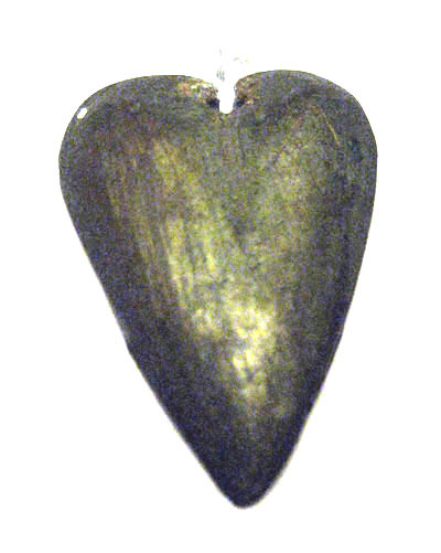 Beslag av mässing. Hjärtformigt lätt välvt med på undersidan, och i framkant fastlödd, platta. Upptill hål.