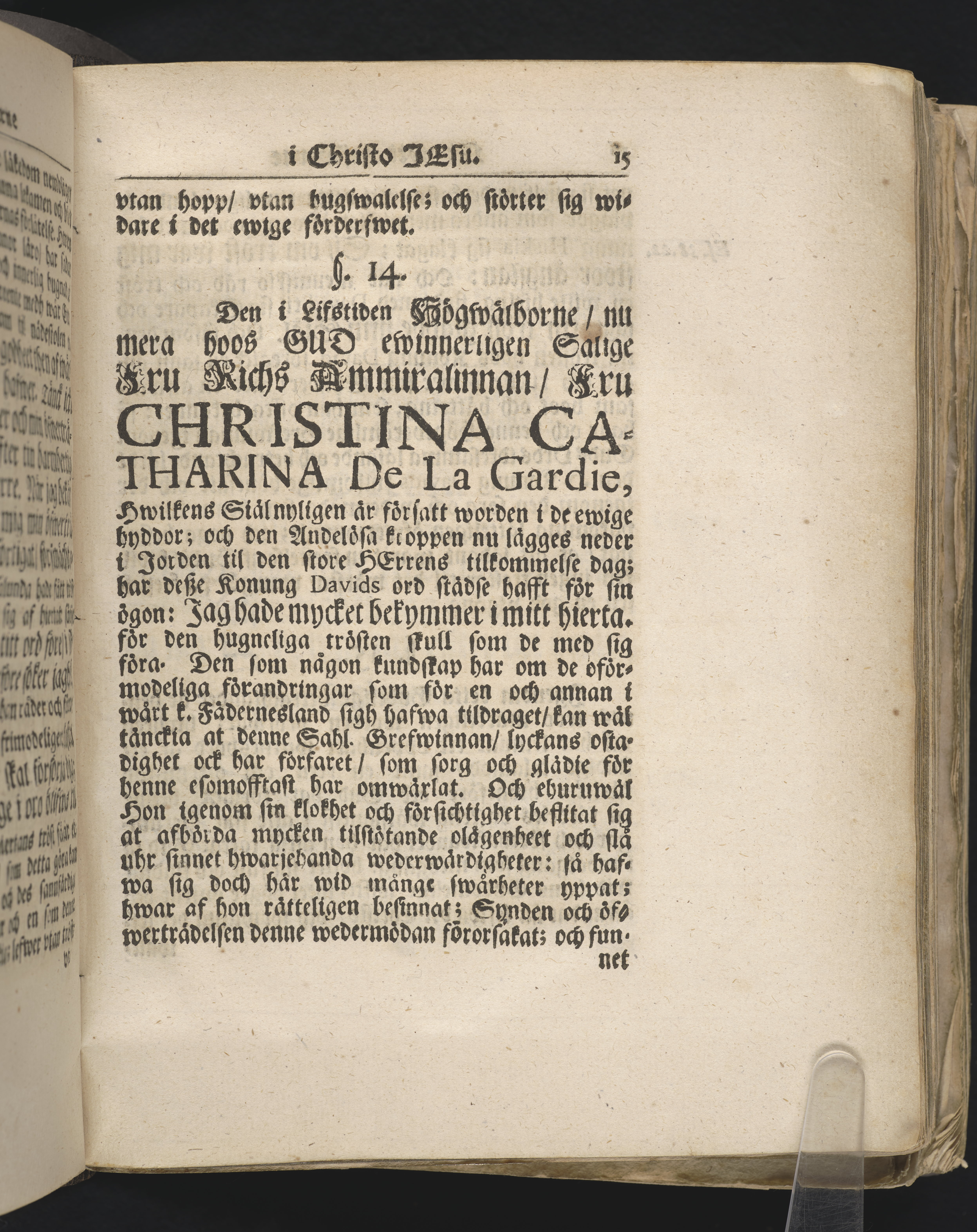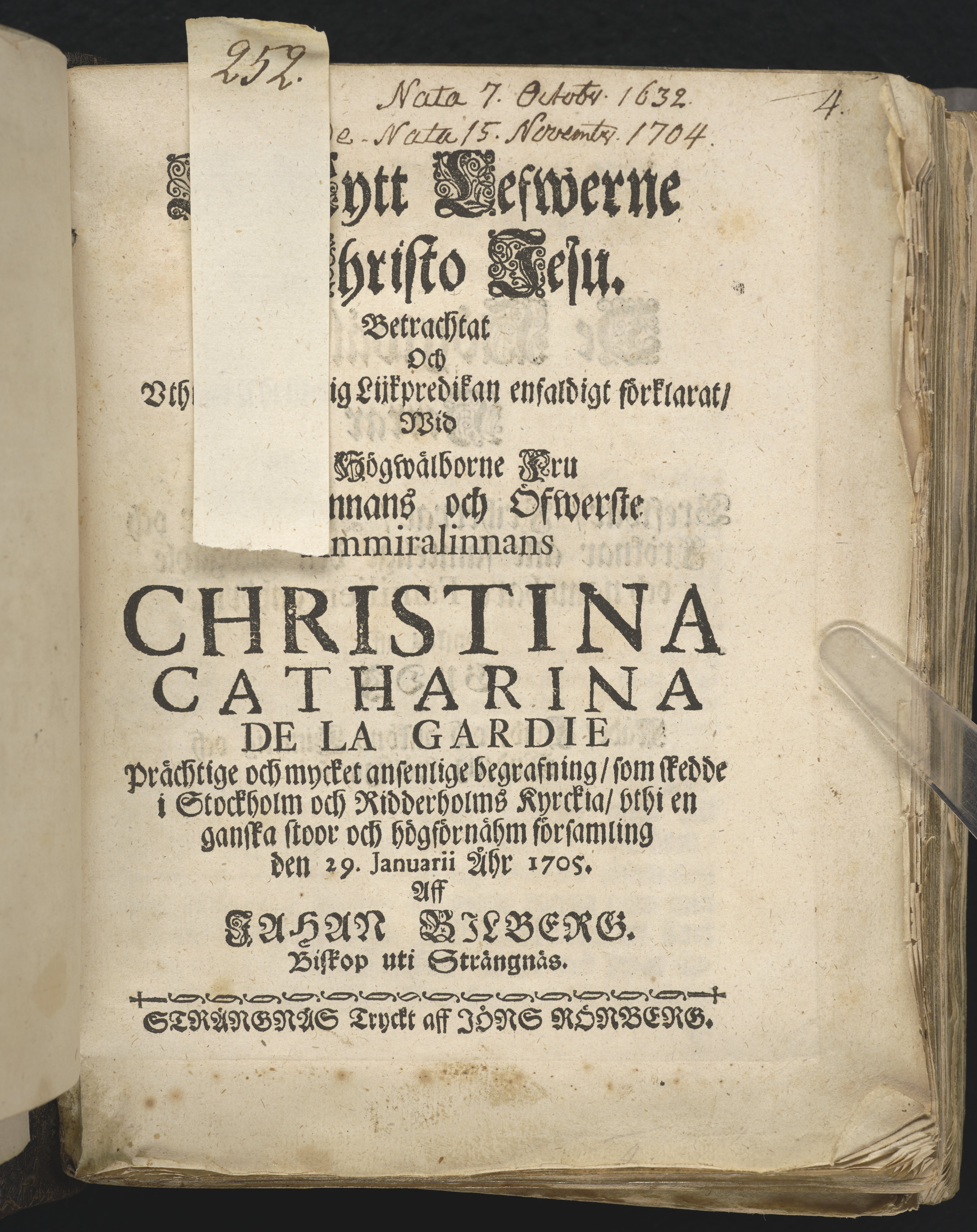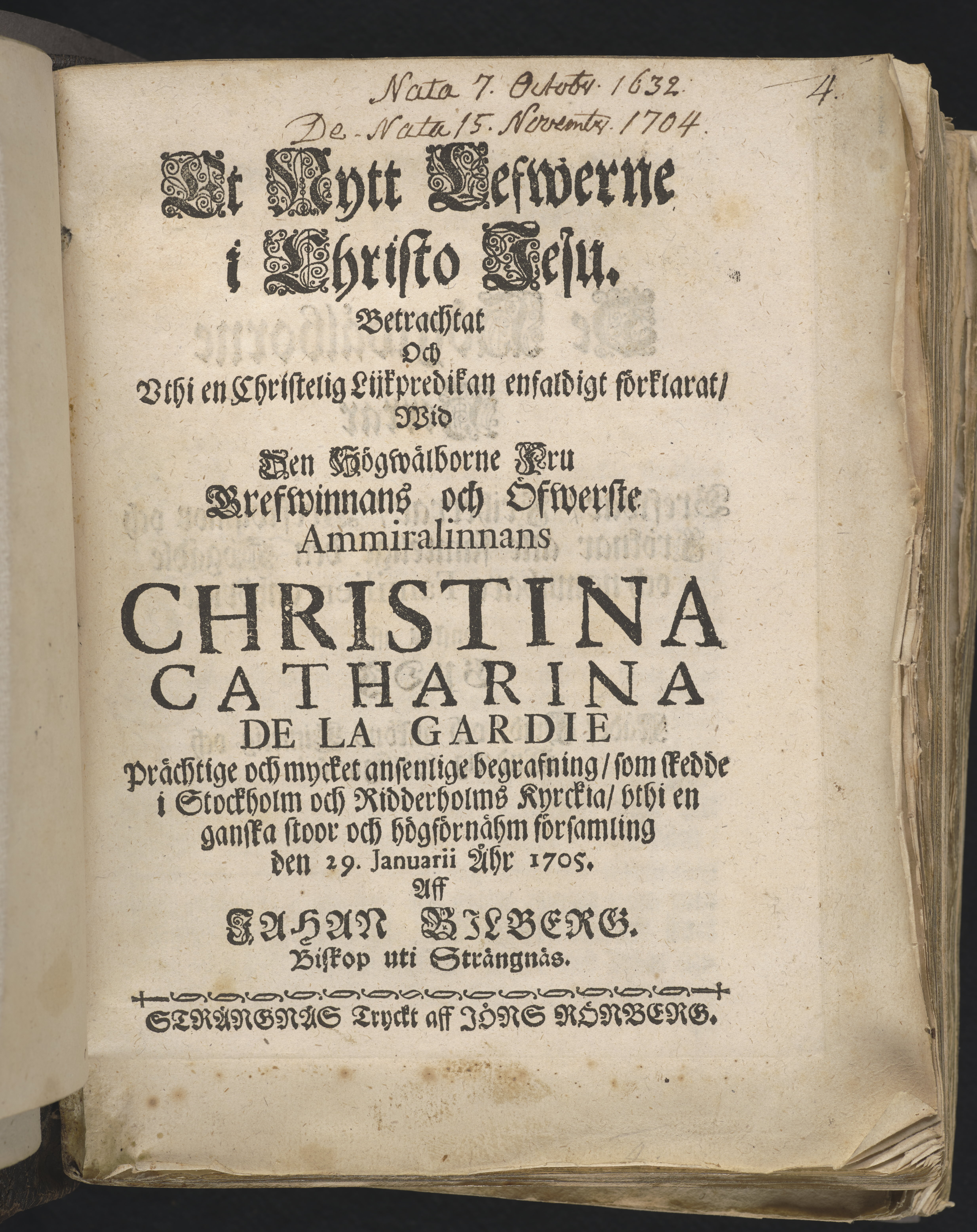 Et nytt lefwerne i Christo Jesu. Betrachtat och vthi en christelig lijkpredikan enfaldigt förklarat, wid ... öfwerste ammiralinnans Christina Catharina De la Gardie prächtige och mycket ansenlige begrafning, som skedde i Stockholm och : Ridderholms kyrckia, vthi en ganska stoor och högförnähm församling den 29. januarii åhr 1705. Aff Jahan Bilberg ... Strängnäs tryckt aff Jöns Rönberg.
