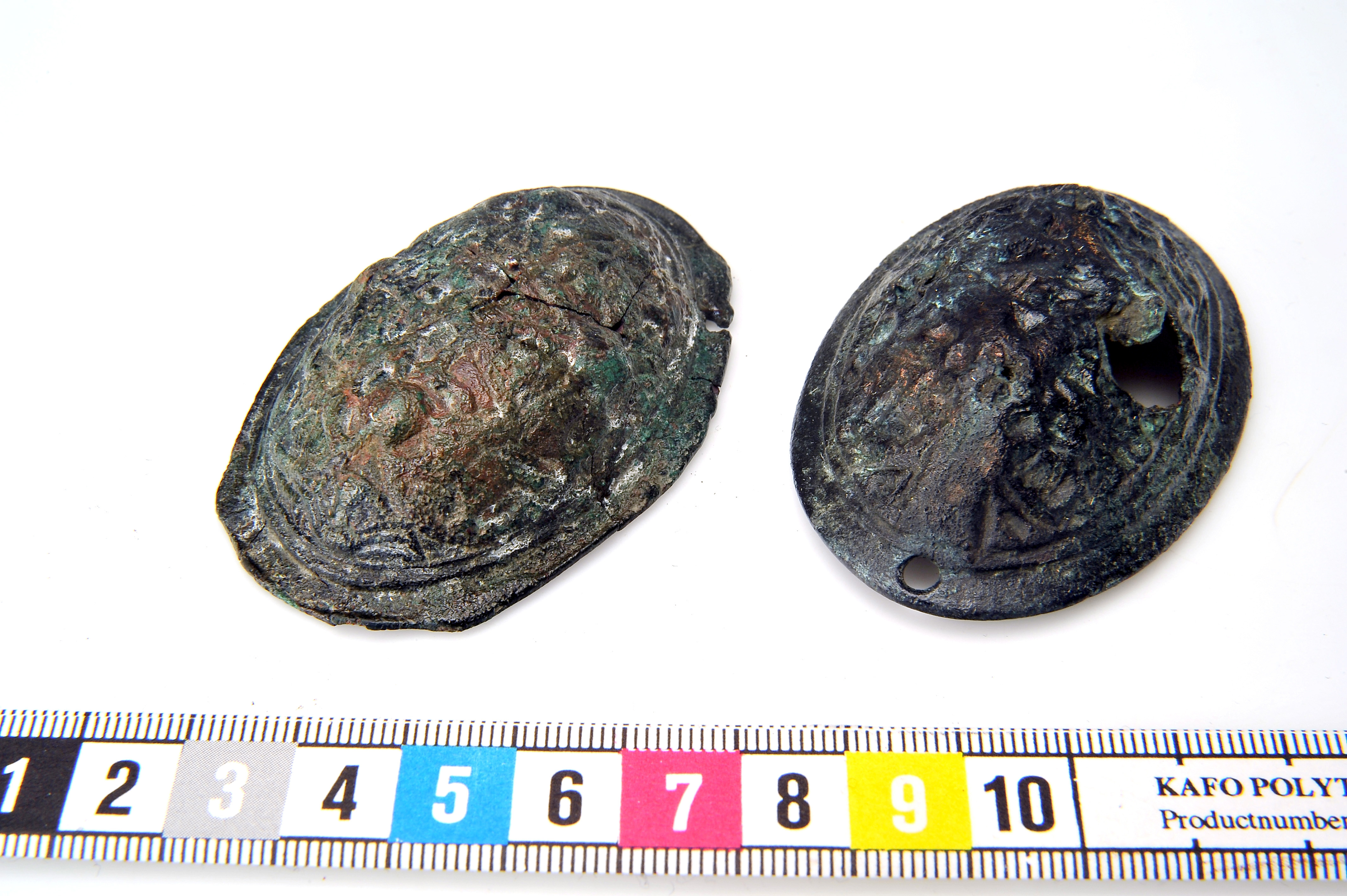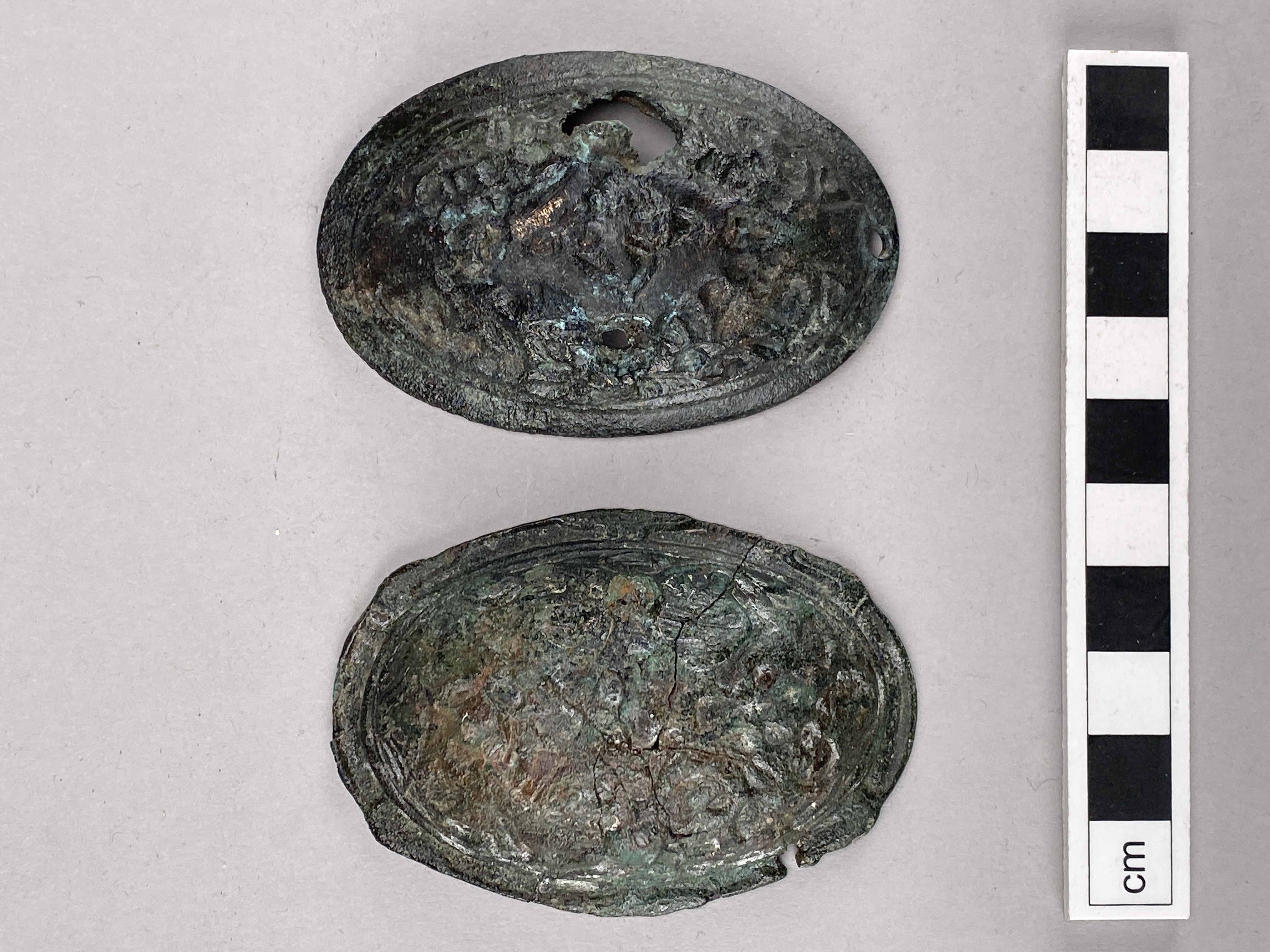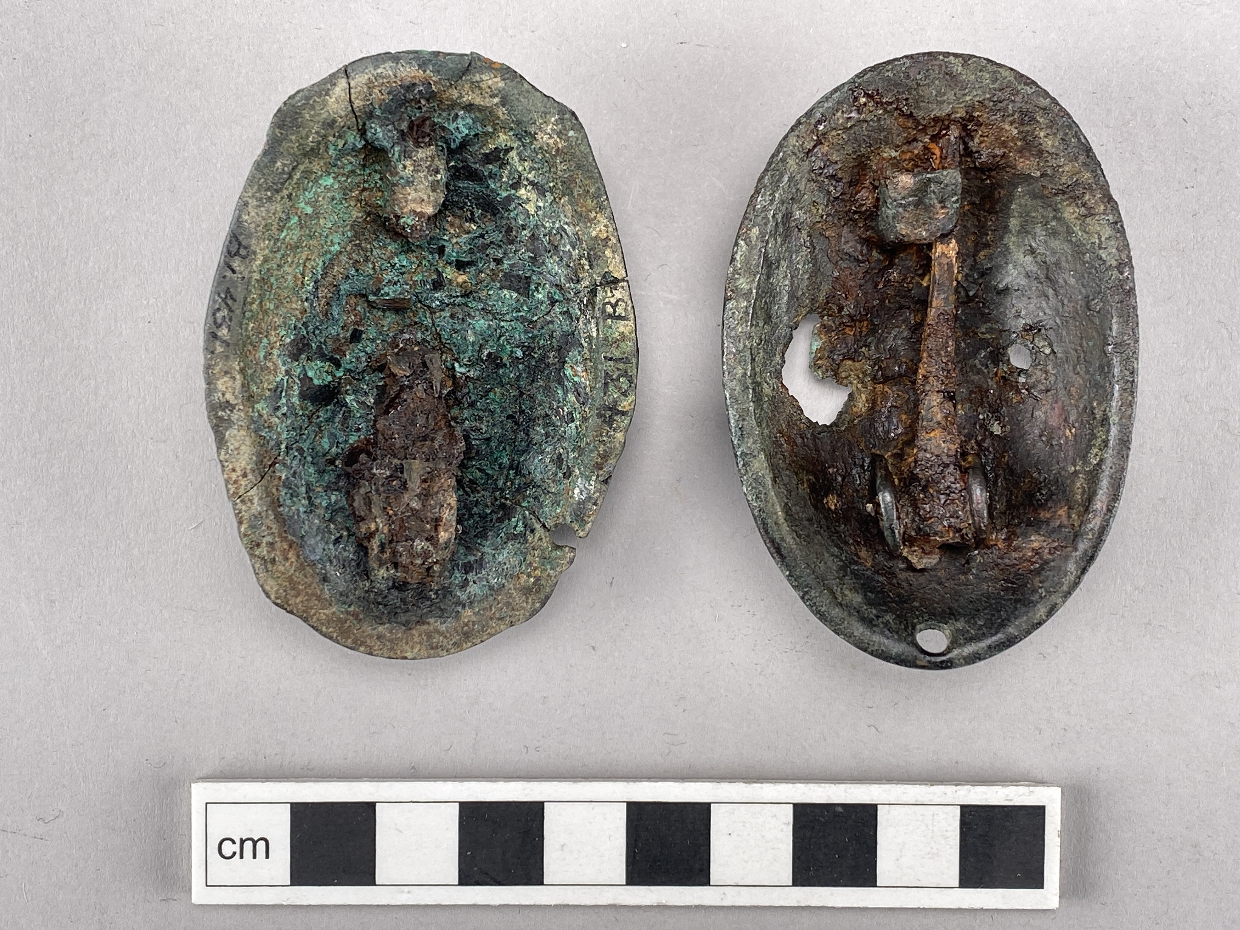 2 enkelskaliga ovala spännbucklor, 1 med nålen bevarad